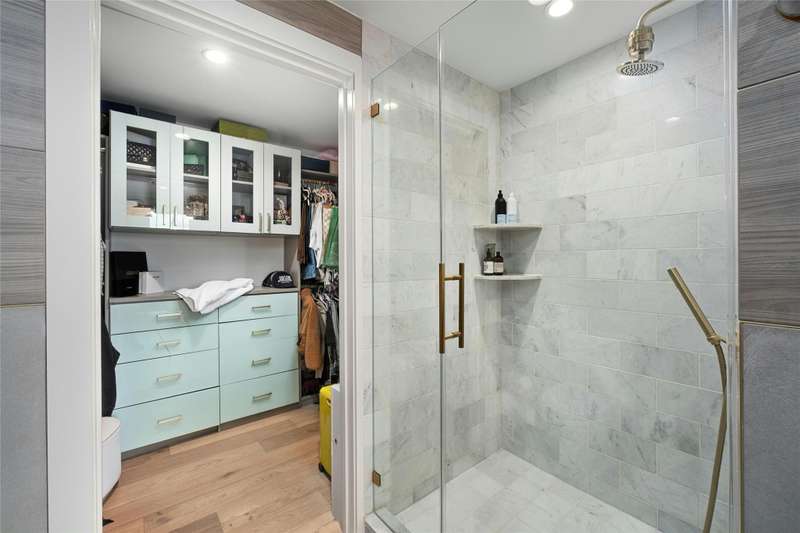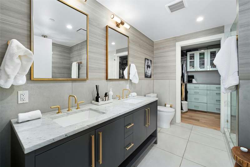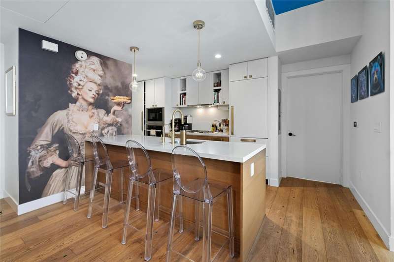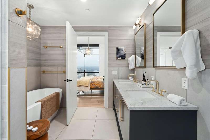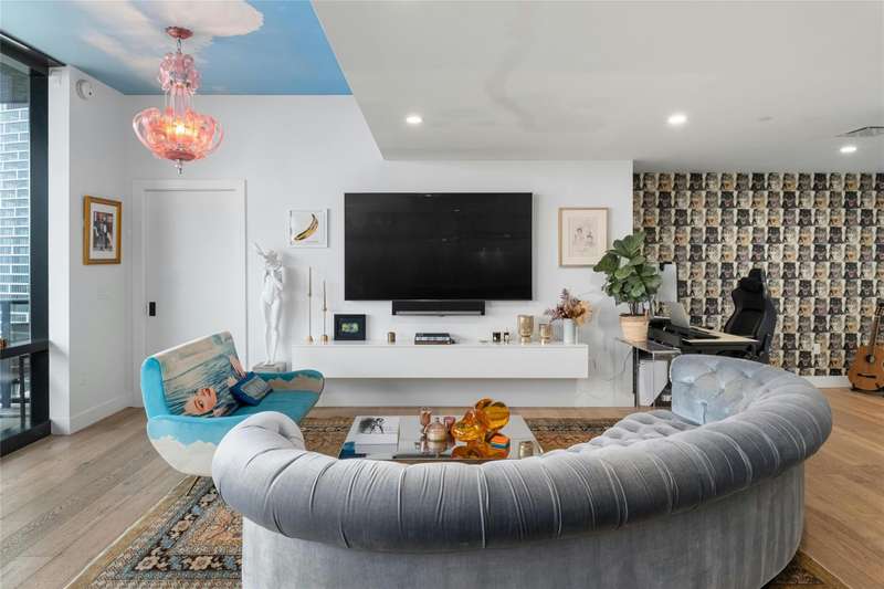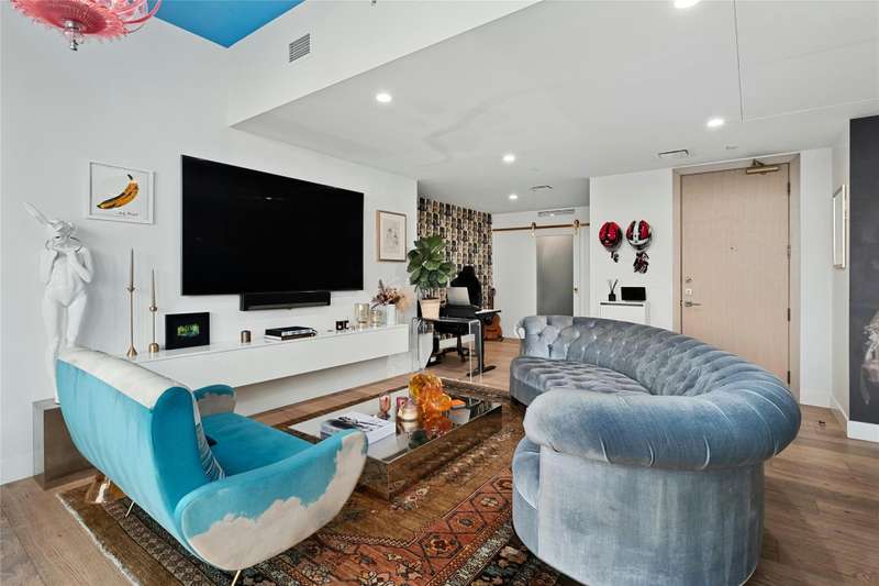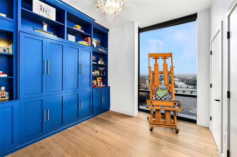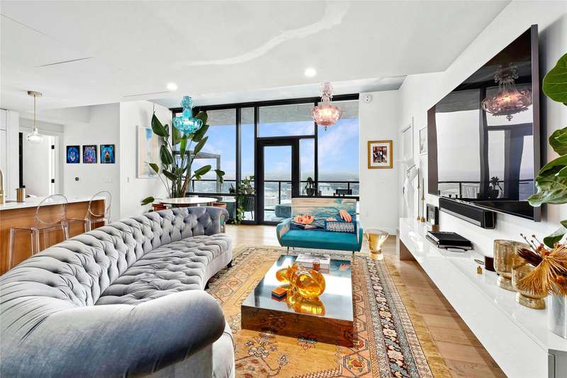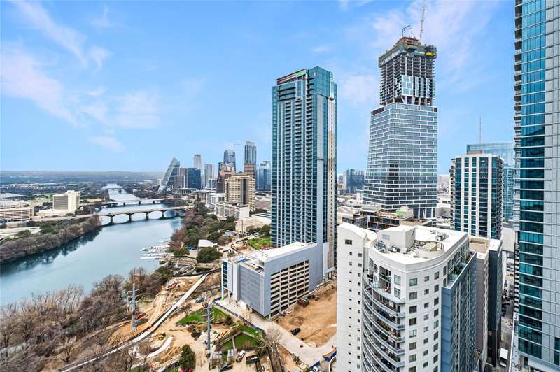 Coveted C2 floor plan located on the 27th floor of the prestigious 70 Rainey, residence #2702 offers an exceptional blend of luxury and breathtaking west-facing views. This two-bedroom, two-bathroom residence captures the beauty of Lady Bird Lake and the evolving Austin skyline from the expansive floor to ceiling windows and your own private 26' x 7' terrace. High-end and custom finishes designed for both comfort and elegance, including a custom closet in the primary bedroom, built-in murphy bed in the second bedroom, Hunter Douglas motorized shades, floor-to-ceiling tilework in both bathrooms, rounded marble shelves in the shower, a custom floating entertainment cabinet with LED shadow, custom cabinets with quartz countertop and modern barn door in laundry room, Miele wine fridge, abundant additional lighting and dimmers throughout. The kitchen is equipped with premium Miele appliances, sleek quartz countertops, and custom cabinetry, making it a chef's dream. With interior design selections by MARKZEFF, 70 Rainey offers over 31,000 sqft of indoor and outdoor amenities. Residents enjoy access to a 21,000-square-foot deck with an infinity-edge pool, private cabanas, and multiple lounge areas overlooking the lake and skyline. Additional features include a state-of-the-art fitness center, a resident lounge, a dog park, and 24/7 concierge services. Nestled in the vibrant Rainey Street District, this home offers the perfect balance of urban excitement and serene luxury, making it a rare opportunity in the heart of downtown Austin. Tax and assessed values are estimates for illustration purposes only. All figures should be independently verified.