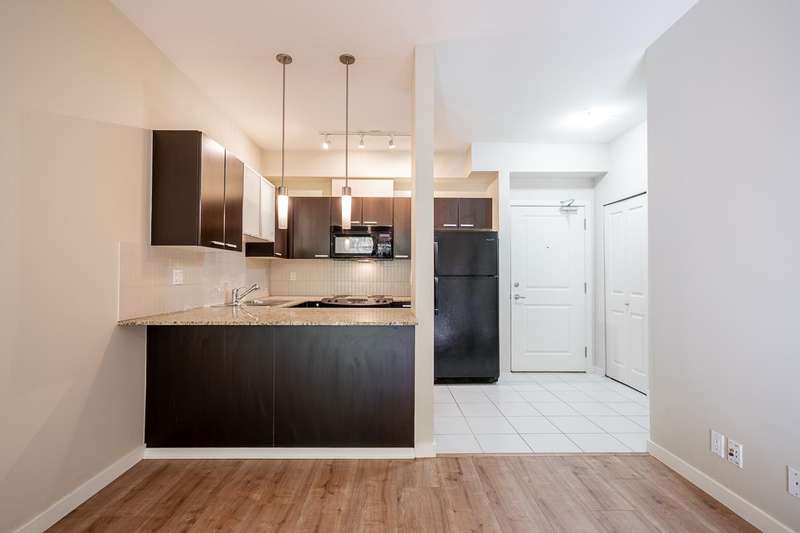 Located in the popular D'Cor community of Surrey City Centre. This Spacious One bedroom, one bathroom condominium is move in ready. Freshly updated with new wide plank laminate flooring in the living and dining areas and a new coat of paint. The Kitchen features dark wood grain cabinets, black appliances, granite counter top, tile backsplash and flooring. Situated on the second floor and on the quiet side of the building with dual-access balcony. 1 parking and 1 locker. Pet-friendly (One cat or one small dog permitted - maximum 20 kgs). The Building offers Secure Gated underground parking, onsite amenity and fitness rooms. Just a short stroll to SFU, KPU, Surrey Central Skytrain, and all the shops and restaurants of Central City Mall. Perfect for first time buyers, investors or students.