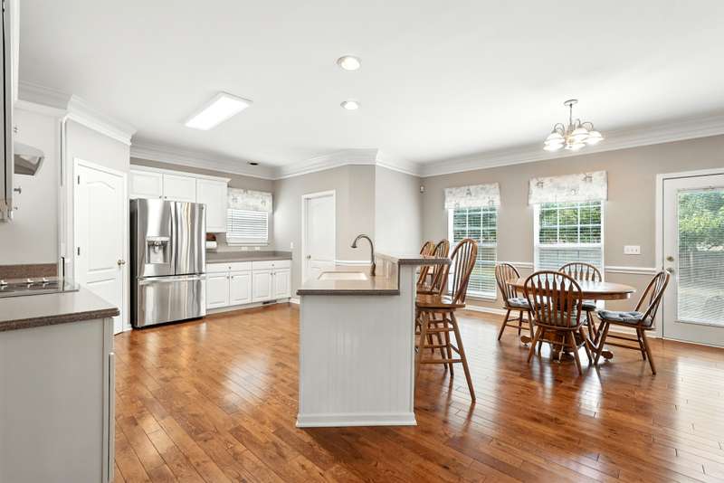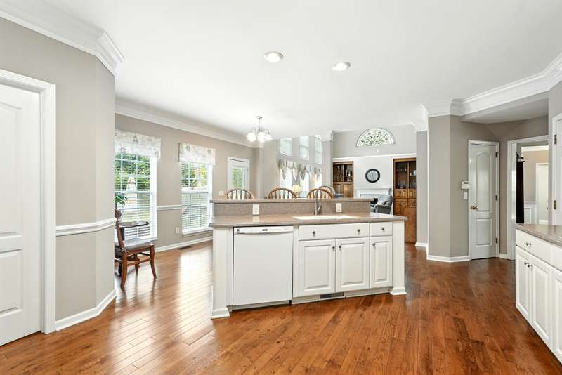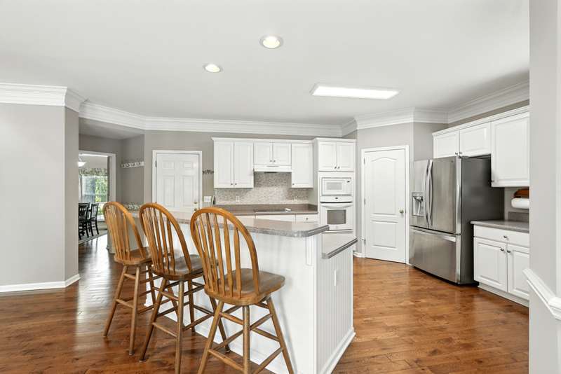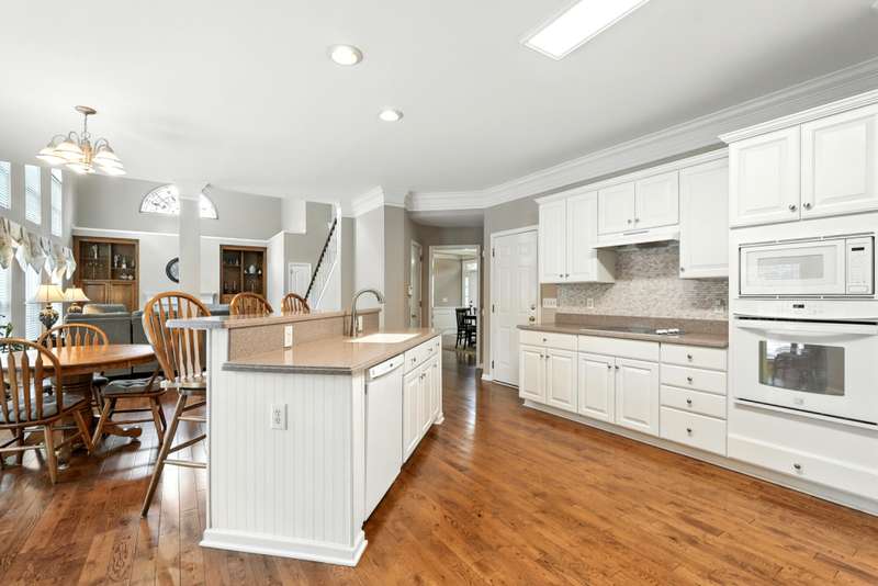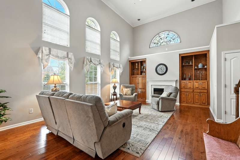 The living room impresses with soaring vaulted ceilings, a wall of windows overlooking the backyard and a cozy fireplace framed by custom oak built-ins. Hardwood floors and a neutral palette run throughout the main level, creating a timeless and inviting feel. The kitchen features an open, functional layout with plenty of seating and gathering space.