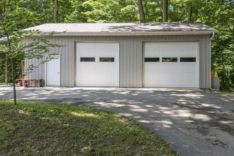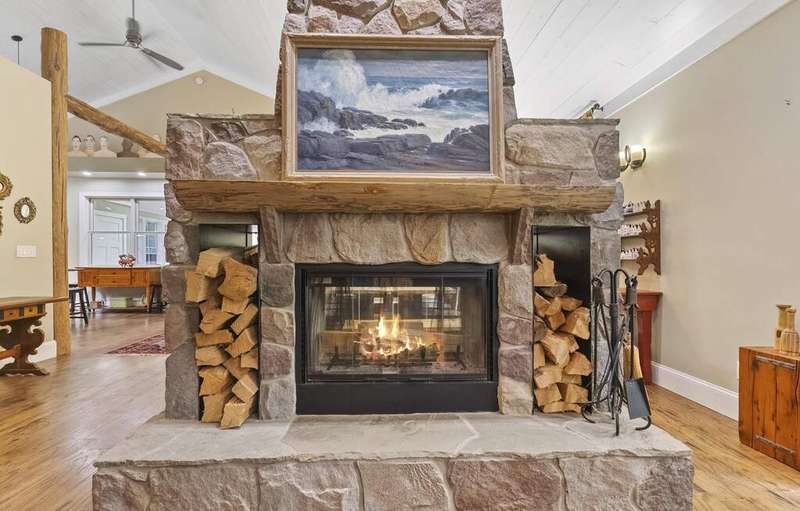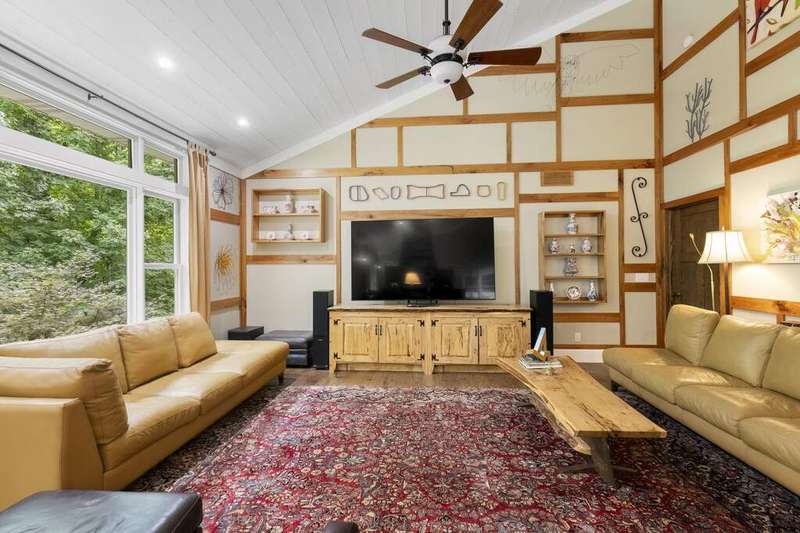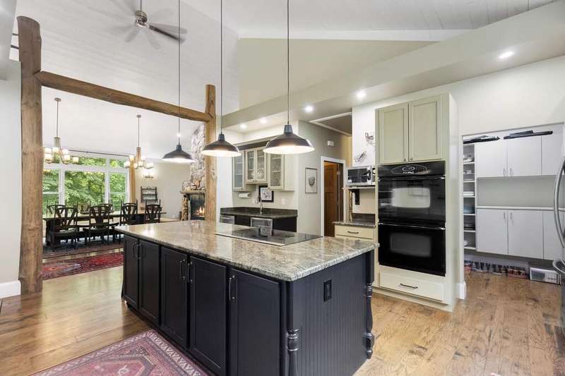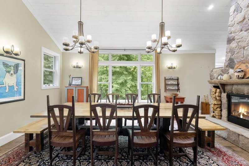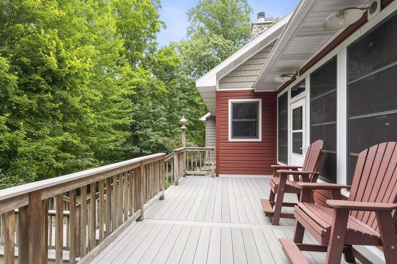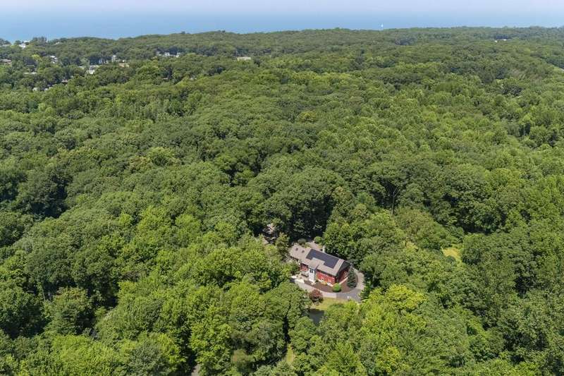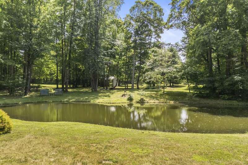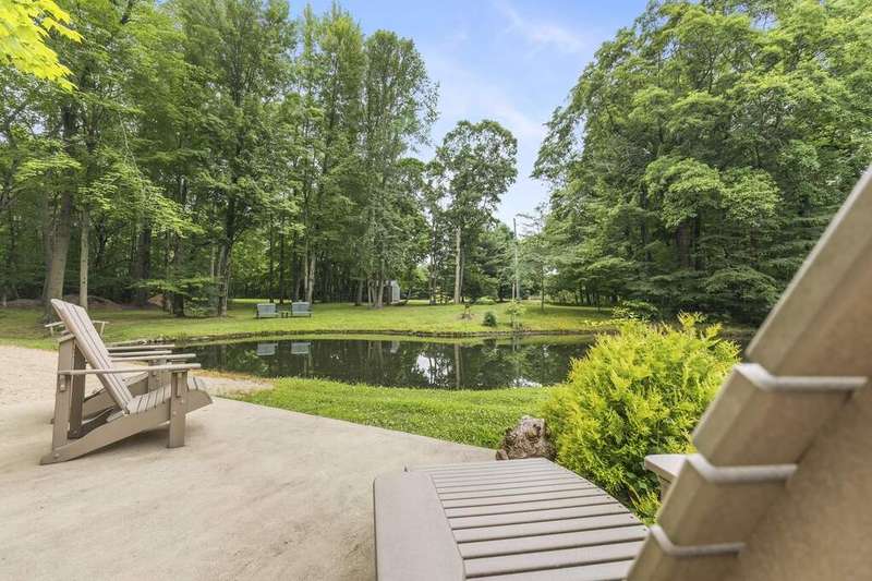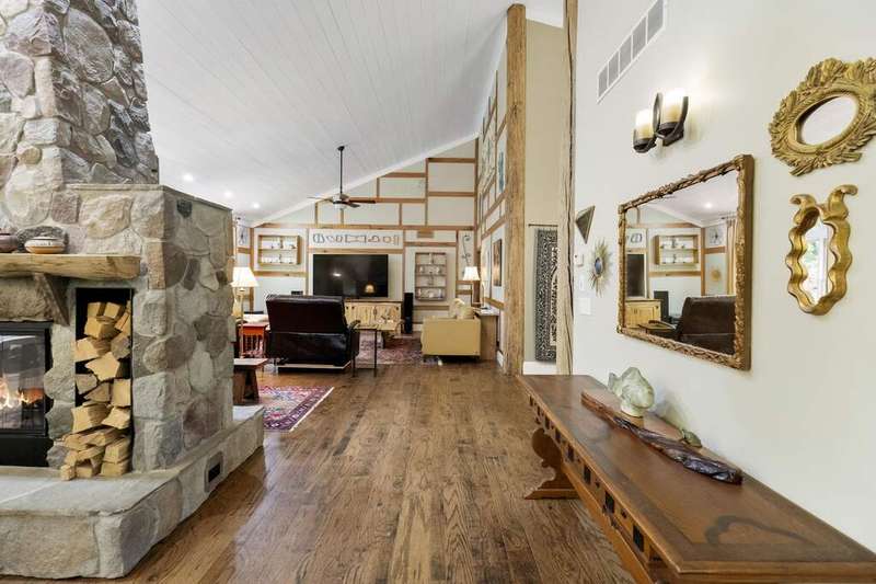 A private estate unlike anything else in Harbor Country. This rare blend of timeless craftsmanship & serene natural beauty, is nestled on 11 wooded acres with a tranquil pond & stream meandering through the property. This one-owner custom-built retreat offers over 5,000 sq ft of luxury living, meticulously designed for comfort, elegance, & privacy. Crafted with high-end features including cypress beams repurposed from the historic Sears warehouse, a grand double-sided stone fireplace, & radiant floor heating in the main level. Explore 2 miles of private trails, cross 5 handcrafted bridges, & enjoy the scenic charm of a 120' x 40' pond surrounded by Paw Paw trees. A truly unique legacy property - perfect for a private residence, STR, weekend escape, or multi-generational compound.