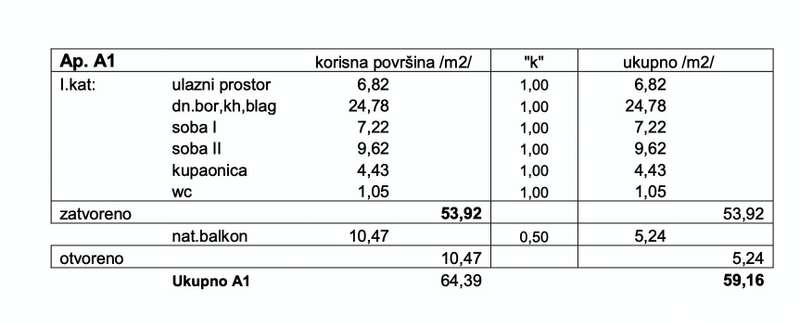 Apartment A-1 - 1st floor - living area of 53.92 m2 (2 bedrooms + bathroom + WC) + covered balcony (10 m2 N - E) + outdoor parking space; total net area 61.66 m2 = 198,000 EUR