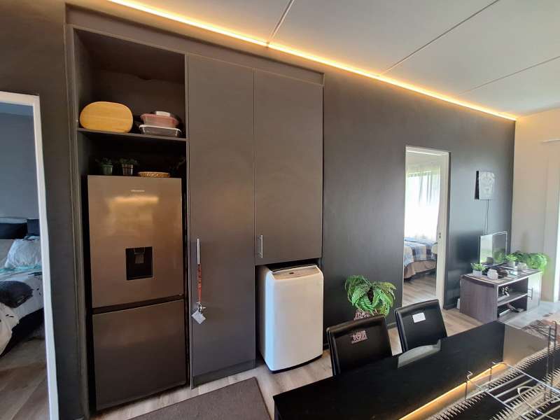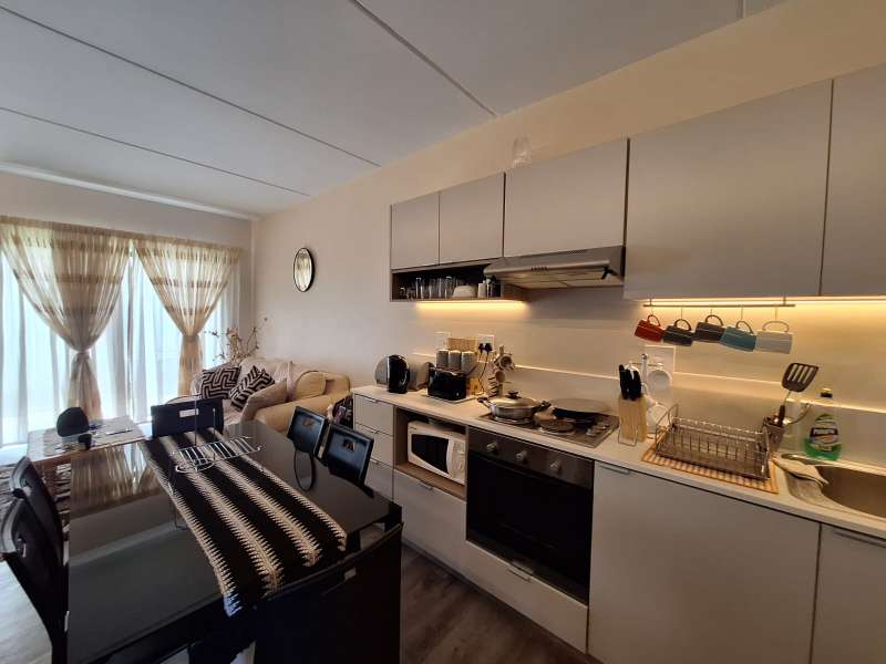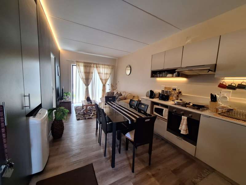 Modern fully fitted kitchen.with Ceasar stone counter tops. Open plan Lounge dining with sliding doors leading to quaint garden. 2 bedrooms with built in cupboards and main en suite. Features and facilities include: Gym, laundry room, soccer pitch Walking track, kids skate park and play area Open workspace, vegetable gardens Fiber Internet included in the levy