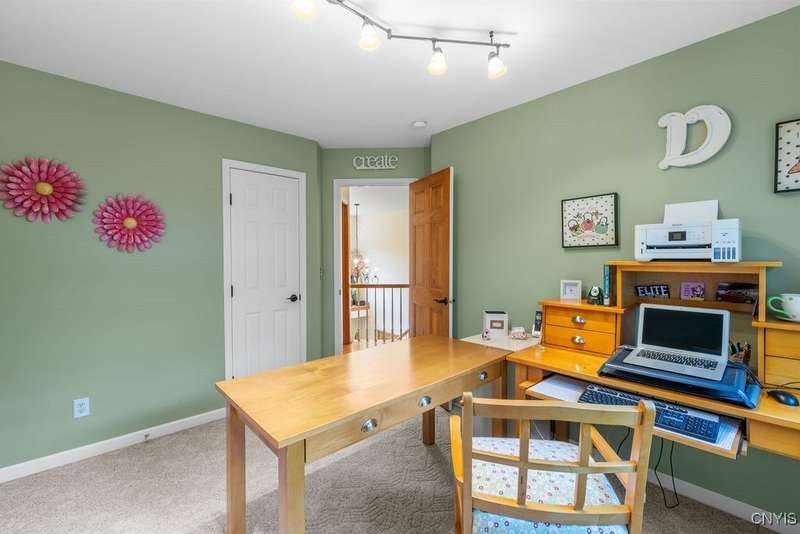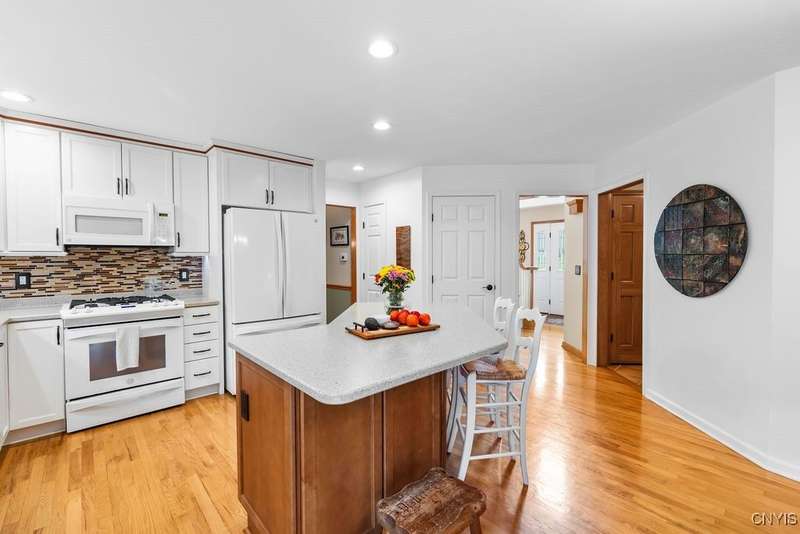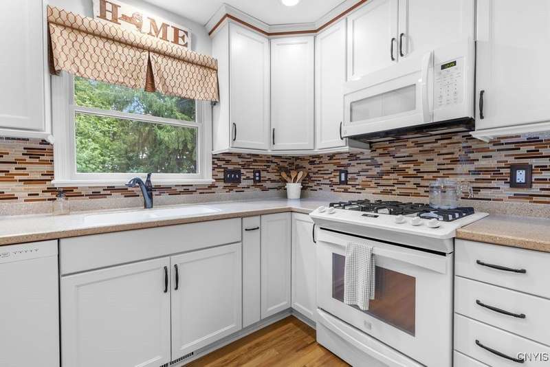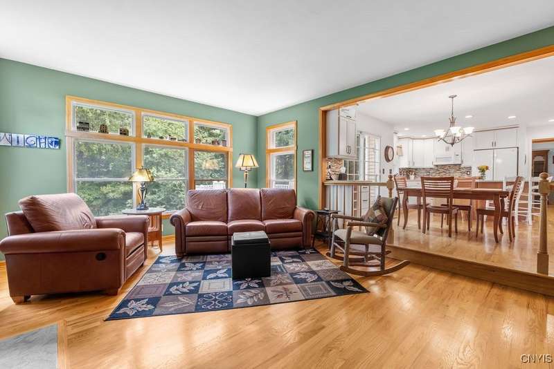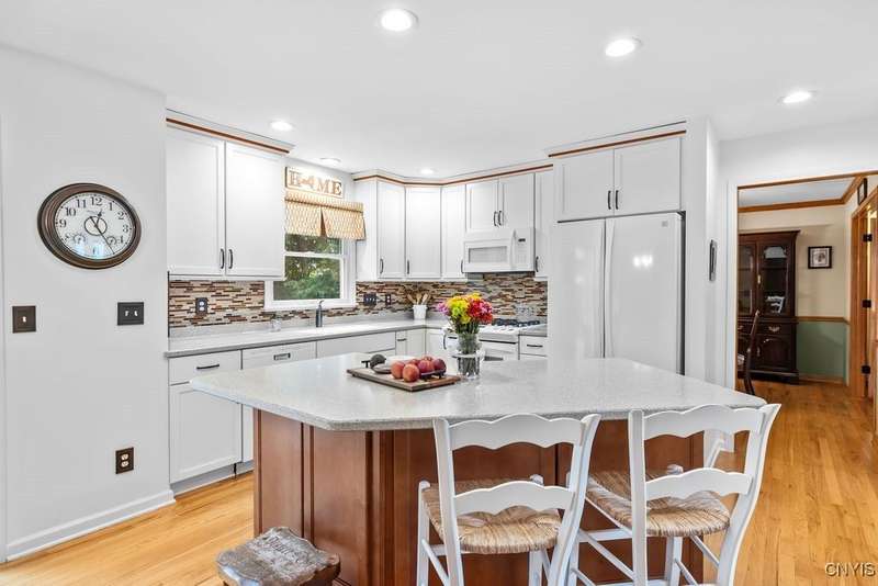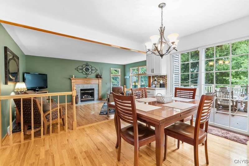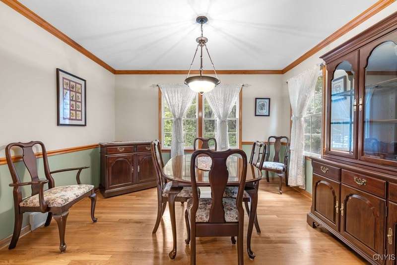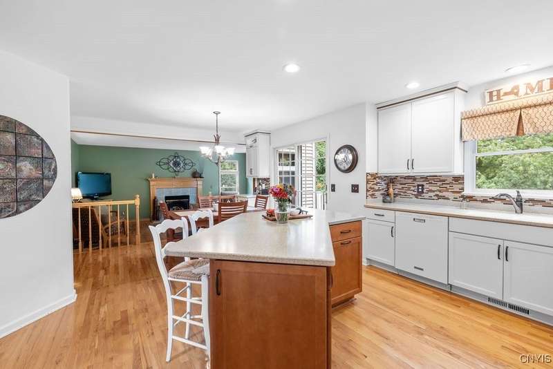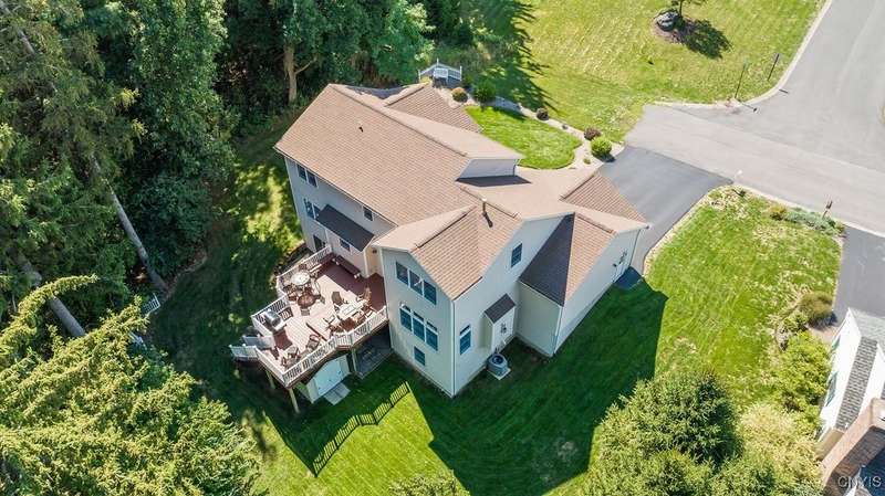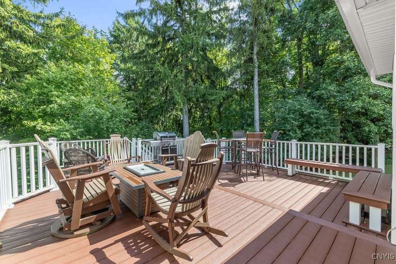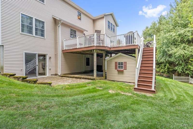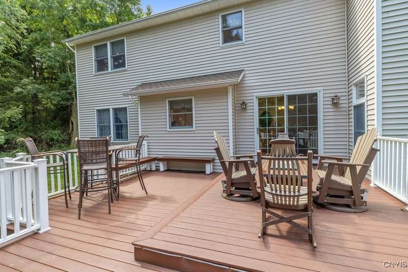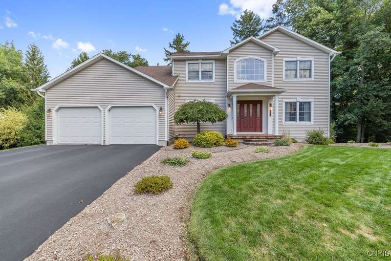 Do you want the feel of a neighborhood while still enjoying privacy? Welcome to 135 Peridot Drive, a beautifully updated 4 bed, 2.5 bath colonial located within the West Genesee School District and spans over 3,000 sqft. Tucked away at the end of the street and surrounded by mature trees, this home combines convenience with a private, peaceful setting. Step inside to a two-story foyer with a grand staircase and gleaming natural wood floors. The remodeled kitchen is a chef's dream, featuring expansive counter space, upgraded cabinetry with toe-kick and pull-out pantry drawers, and newer appliances. A sliding glass door leads to an oversized maintenance free composite deck overlooking the private backyard. The spacious family room offers a gas fireplace and a wall of windows that fill the space with natural light. A formal dining room, private office with French doors, a convenient half bath, and an attached oversized two car garage complete the main level. On the second level, the primary suite is a retreat with a newly remodeled bath (2020) showcasing a walk-in tiled shower with glass door, double vanity, heated floors, and custom corner cabinetry. The suite also includes a large walk-in closet. Three additional bedrooms, all generous in size with ample closet space, share a full bath with a tub. The finished walkout basement is perfect for entertaining, offering additional living space plus room for storage, a workshop, and laundry. Additional shed under the deck for more storage. Notable updates include a new roof (2021), remodeled kitchen, and numerous interior upgrades. This home blends everyday comfort with elegant details ? all in a sought-after location. Don't miss this one! Highest and best offers Tuesday 9/23 @9pm.