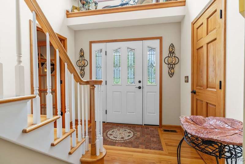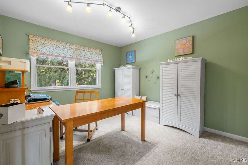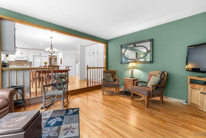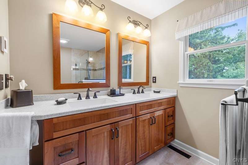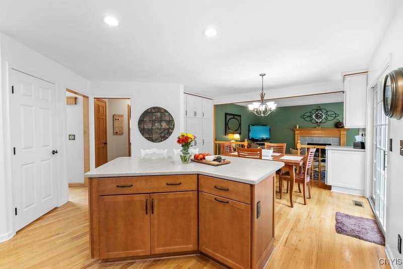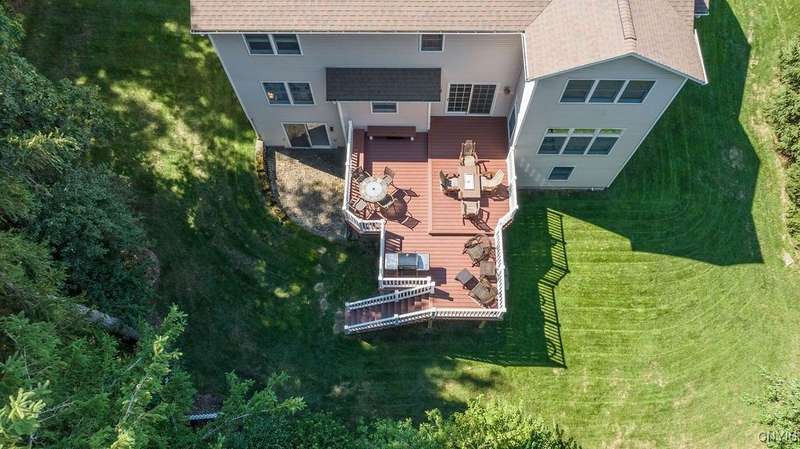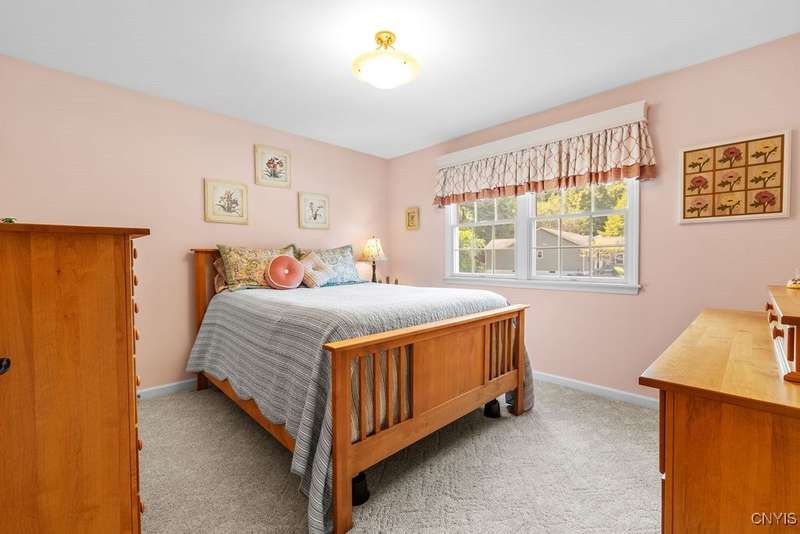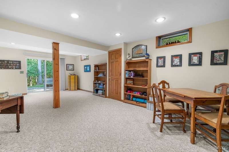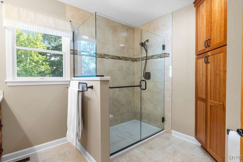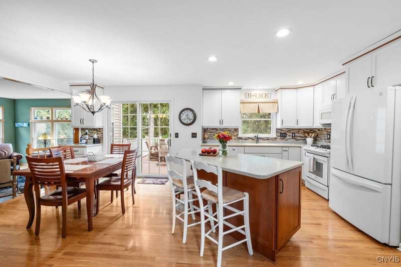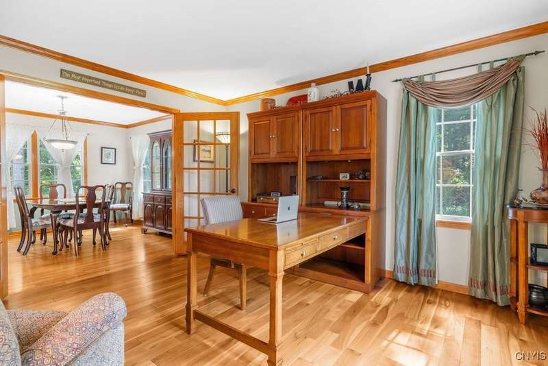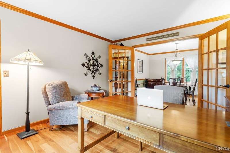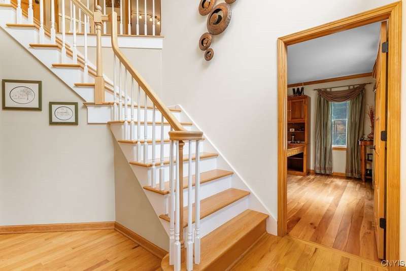 Do you want the feel of a neighborhood while still enjoying privacy? Welcome to 135 Peridot Drive, a beautifully updated 4 bed, 2.5 bath colonial located within the West Genesee School District and spans over 3,000 sqft. Tucked away at the end of the street and surrounded by mature trees, this home combines convenience with a private, peaceful setting. Step inside to a two-story foyer with a grand staircase and gleaming natural wood floors. The remodeled kitchen is a chef's dream, featuring expansive counter space, upgraded cabinetry with toe-kick and pull-out pantry drawers, and newer appliances. A sliding glass door leads to an oversized maintenance free composite deck overlooking the private backyard. The spacious family room offers a gas fireplace and a wall of windows that fill the space with natural light. A formal dining room, private office with French doors, a convenient half bath, and an attached oversized two car garage complete the main level. On the second level, the primary suite is a retreat with a newly remodeled bath (2020) showcasing a walk-in tiled shower with glass door, double vanity, heated floors, and custom corner cabinetry. The suite also includes a large walk-in closet. Three additional bedrooms, all generous in size with ample closet space, share a full bath with a tub. The finished walkout basement is perfect for entertaining, offering additional living space plus room for storage, a workshop, and laundry. Additional shed under the deck for more storage. Notable updates include a new roof (2021), remodeled kitchen, and numerous interior upgrades. This home blends everyday comfort with elegant details ? all in a sought-after location. Don't miss this one! Highest and best offers Tuesday 9/23 @9pm.