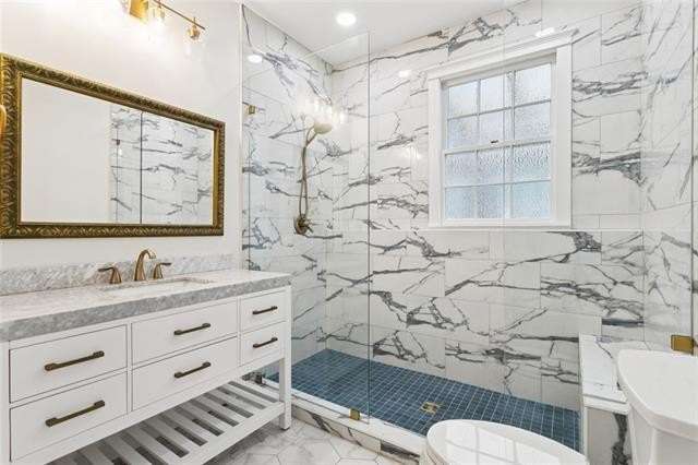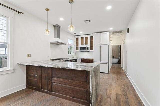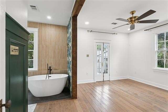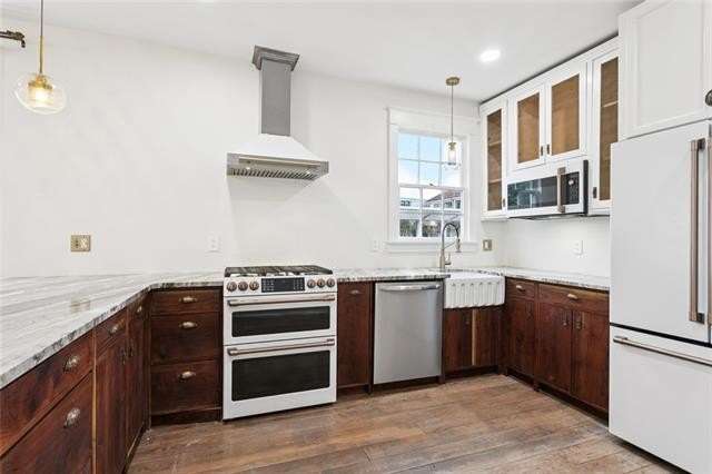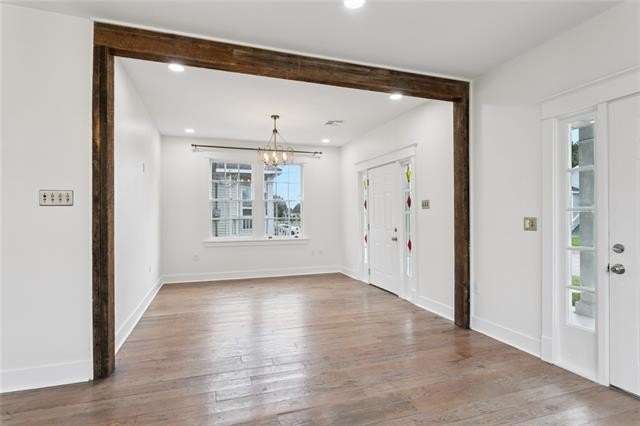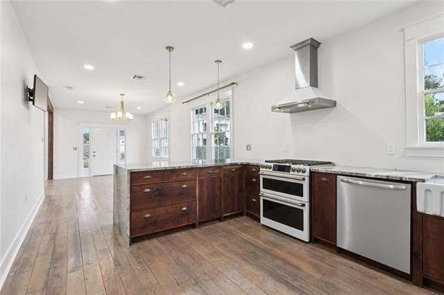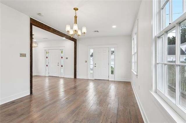 Be bedazzled by this over-the-top, oozing with charm 3 bed, 2 bath cottage in the center of historic Old Arabi. This beautifully renovated gem blends classic Southern architecture and is just minutes from the vibrant energy of New Orleans. Step inside to discover an open and airy floor plan bathed in natural light, featuring reclaimed hardwood floors throughout. The spacious living and dining areas are highlighted by exposed wood beams, elegant chandeliers, and large windows that frame picturesque views of the neighborhood. High ceilings and recessed lighting create a sense of grandeur, while thoughtful details like multi-switch panels and ceiling fans ensure comfort in every season. The dream kitchen has rich dark wood cabinetry, marble countertops, and a generous island. Top-of-the-line stainless steel appliances include a double oven, gas range, built-in microwave, and farmhouse sink. Pendant lighting and a sleek range hood add a touch of sophistication, making this space ideal for casual meals or hosting gatherings. The primary suite boasts French doors leading to the back patio, while the additional bedrooms provide flexibility for guests, home offices, or family needs. The primary suite features a freestanding soaking tub, walk-in shower with glass enclosure, dual vanities, and water closet. The second bath impresses with marble veined tiles, a rainfall shower, ornate gold-framed mirror, and modern fixtures that evoke timeless elegance. Outside, the low-maintenance yard and covered porch invite al fresco living, with easy access to local parks, the Mississippi River, & Arabi's eclectic dining scene. Home is located in an X flood zone and qualifies for 100% financing through the USDA Rural Development. Don't miss your chance to call this property home!