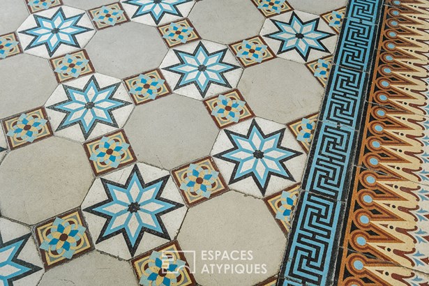 Upon entering, the tone is set: the layout reveals an elegant library on one side, a true reception room, and on the other, a sumptuous living-dining room of over 40 m2. The codes of bourgeois architecture are omnipresent: wood paneling in the basement, generous ceiling heights, delicate moldings, sculpted cornices, cement tiles, a marble fireplace, and superb, carefully chosen parquet floors.