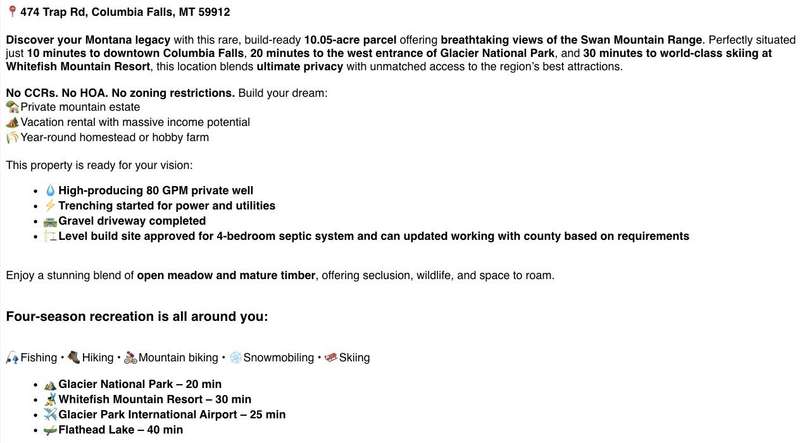 10.05 acres with stunning Swan Mountain Range views-ready to build! This rare gem is perfectly positioned just minutes from Columbia Falls and the entrance to Glacier National Park. With no CCRs, HOA or zoning restrictions, the possibilities are wide open-whether you're dreaming of a private retreat, vacation rental, or full-time homestead. The property is development-ready with a well already dug, trenching started for utilities, & a gravel driveway leading to a prime, level build site. Approved for a 4-bedroom septic, this 10.05-acre parcel offers a serene blend of mature trees and open meadow, creating a private, yet versatile setting. Enjoy four-season recreation just steps away-hiking, fishing, snowmobiling, and more are all at your fingertips. This is Montana living with freedom, convenience, & natural beauty all in one. Flathead Lake, Whitefish Mountain Resort, & the international airport a short drive away.