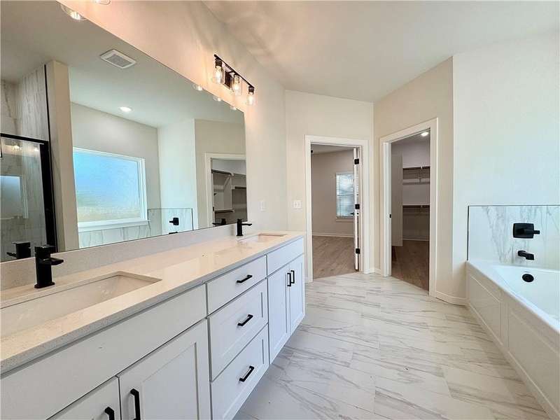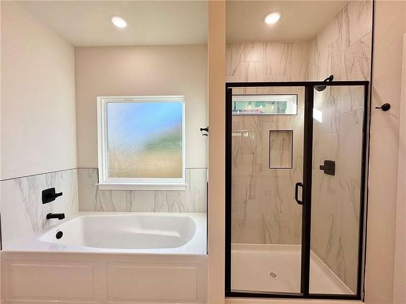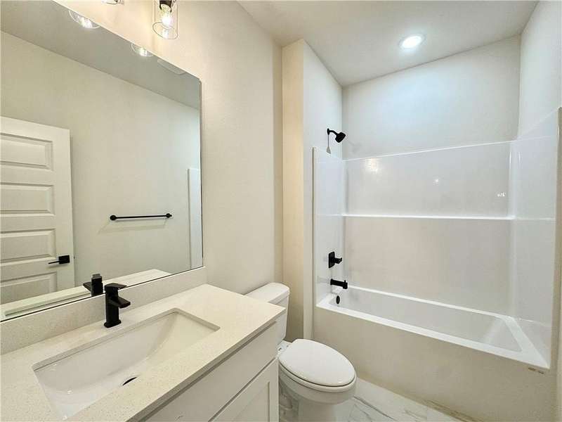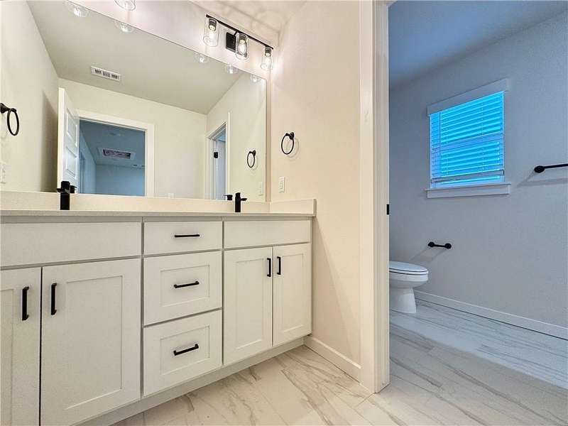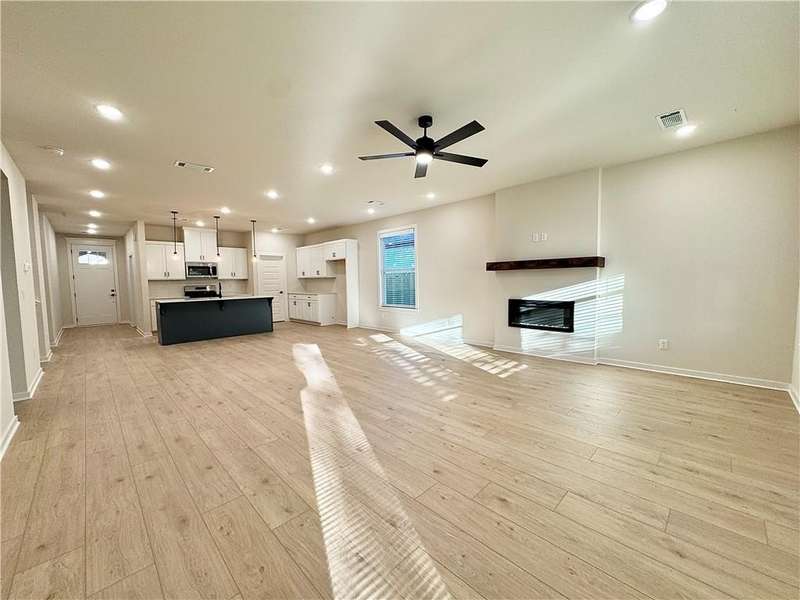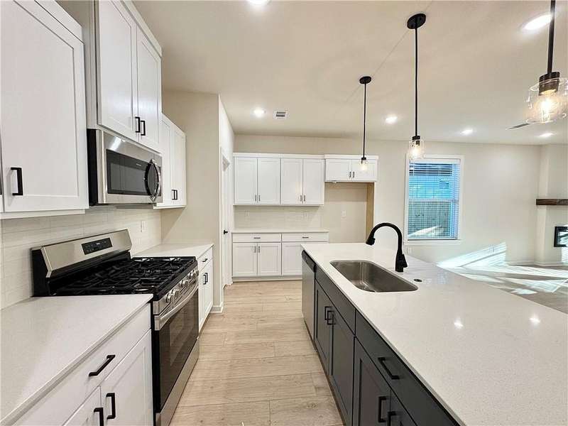 Fence, blinds and gutters included! Discover your dream home in the new neighborhood- Jacob's Crossing. Cooper plan with garage on the right & West facing! 9 ft ceilings, linear electric fireplace, LVP flooring throughout the main living areas & primary bedroom, quartz countertops & more. Chef's kitchen boasting frigidaire stainless steel appliances, gas range, pantry, quartz countertops, bar pull handles, large island and gorgeous backsplash. Luxurious primary bedroom features abundant natural light, while the spa-like primary bathroom offers a walk-in shower, tub, double sinks, and spacious walk-in closets. Additional features-secondary bedroom on the main level, 2 large secondary bedrooms upstairs and a functional laundry room. Nestled on a generous lot with covered patio that overlooks the serene sodded, fully fenced backyard, creating an exceptional living experience. Sturdy concrete siding! Model home located at 3631 Tranquility St- Lot 1.