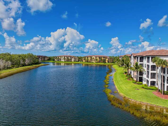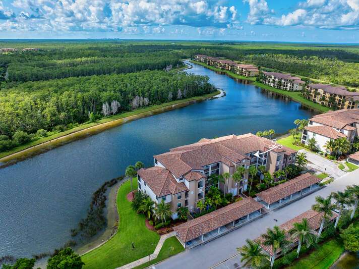 Stunning long lake views in Treviso Bay! This immaculate TOP-FLOOR BELLINI FLOOR PLAN offers a beautifully upgraded design with turnkey furnishings. The 2-bedroom, 2-bath plus FLEX ROOM layout showcases crown molding, custom built-in wall cabinetry with hidden big-screen TV, upgraded ceilings and lighting, plantation shutters, and a designer-tiled lanai for enjoying the best southwestern water views. The kitchen features stainless steel appliances, granite countertops, and breakfast bar seating. Additional perks include covered parking, extra storage, and no golf fees. Treviso Bay lives like a resort with first-class amenities: TPC golf course, clubhouse with fine dining, business center, library, social club, resort-style pools with waterfalls and bar & grill, lap pool, tennis, pickleball, bocce, fitness center, yoga studio, spa, sauna, and more. Just steps to a satellite pool, grilling area, and pickleball courts. Only 10 minutes to downtown Naples and beaches-Make this home your Florida home for the upcoming winter season!
