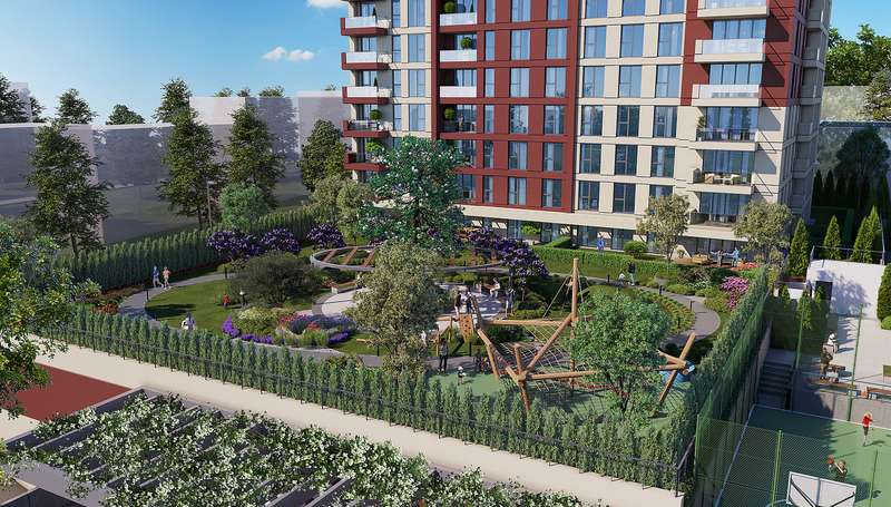 Built on a 6,500 m² plot, the apartments for sale in Bagcilar, Istanbul consists of a single block with 17 floors and 141 independent sections. In addition to apartments with garden access, the project also offers options with en-suite bathrooms and both open and closed kitchen layouts. The project boasts 50% green space with lounging areas, ornamental pools, a children’s playground, a gazebo, landscaped green areas, a fitness center, a sauna, a game and entertainment room, indoor parking, 24/7 security, and security cameras.