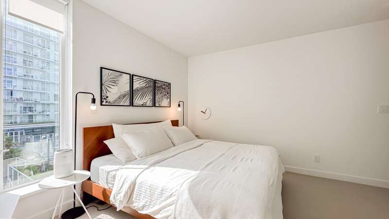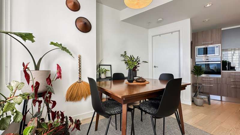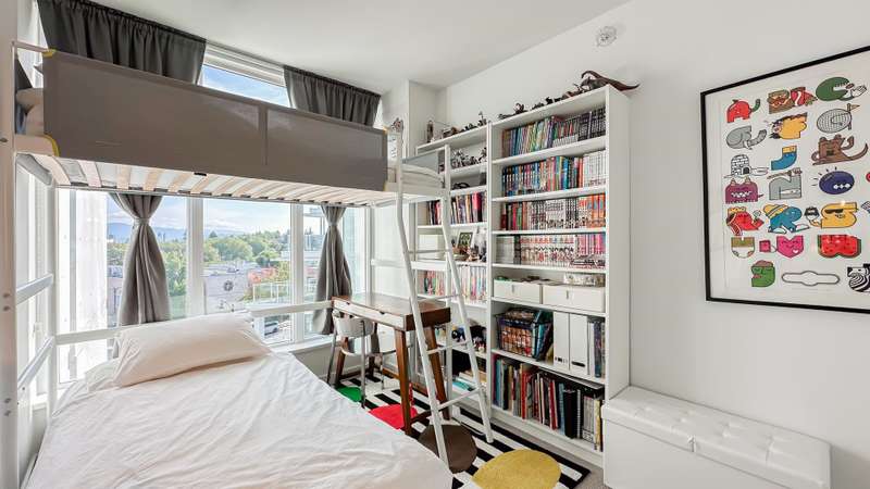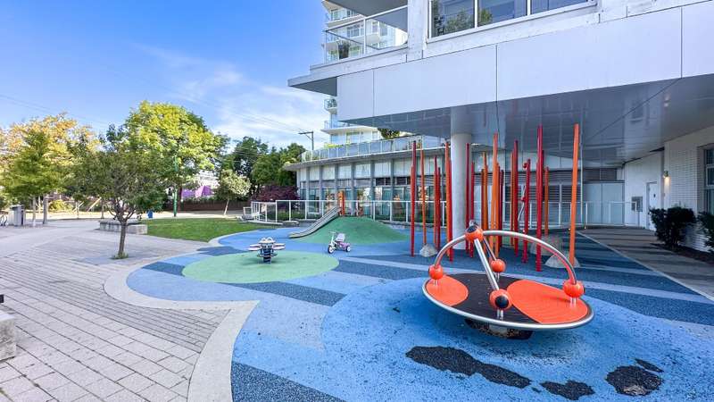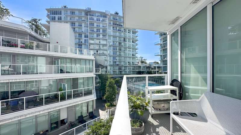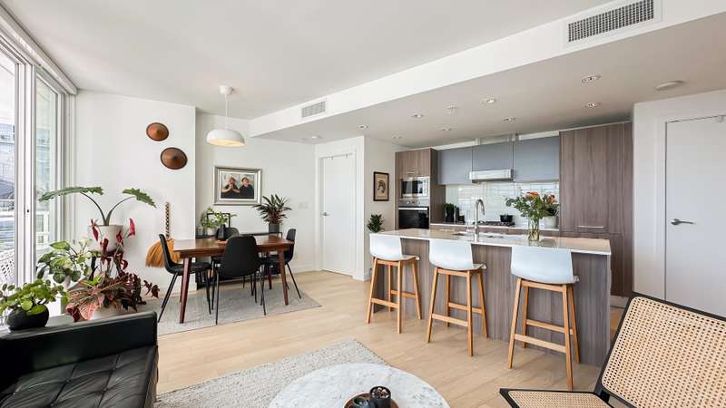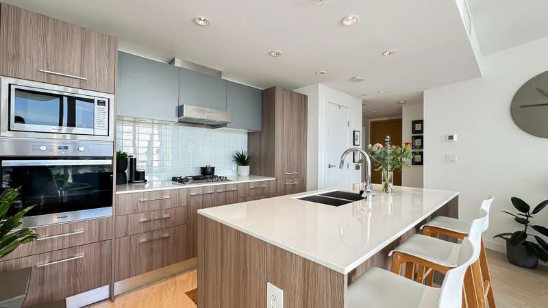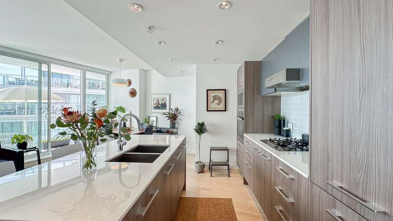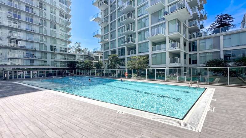Fantastic 2 bed 2 bath at Kensington Gardens. Bright and delightful home shows well and offers perfect open concept plan with lots of floor to ceiling windows. 2 large bedrooms are nicely separated. Kitchen features high end MIELE appliances, gas cooktop and large island for prepping, entertaining and enjoying meals. Enjoy dual access to large covered deck that peeks around so you can watch the kids swimming in the sparkling pool. There is A/C for year round comfort! Primary features a walk in closet and a dual vanity in ensuite.. Amazing amenities include concierge, pristine outdoor heated pool and hot tub, sauna, gym, party room, media room and 2 children’s play areas. Immediate access to T&T, and many fine restaurants, coffee shops and transit routes. Come take a look and be impressed!