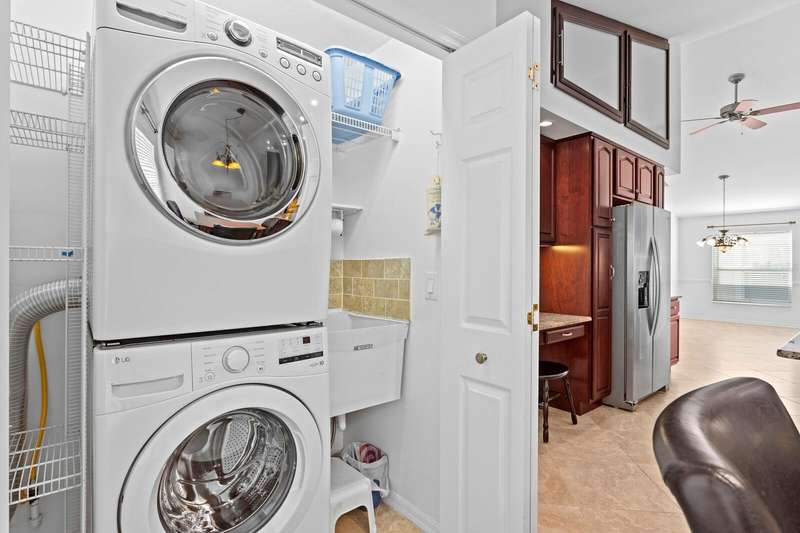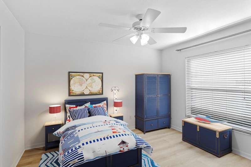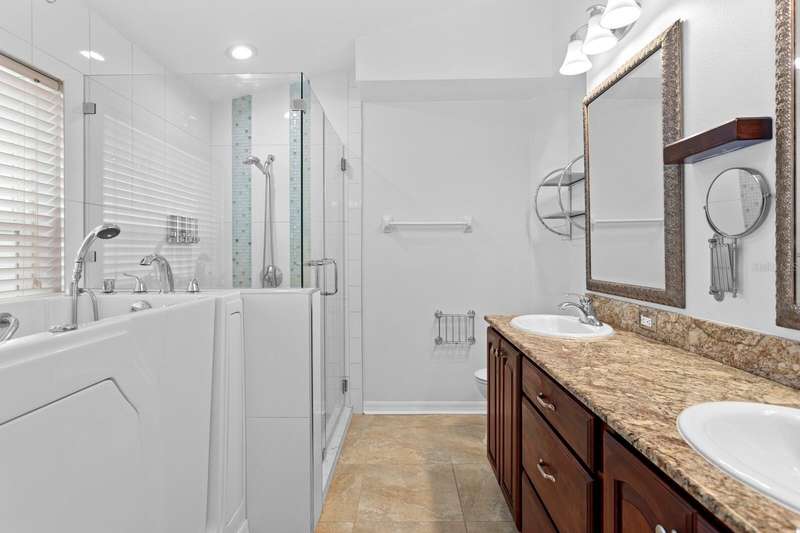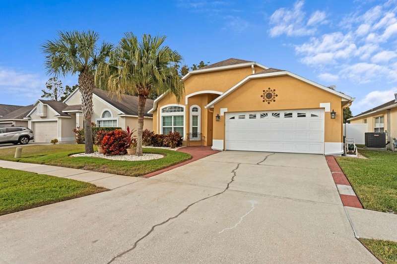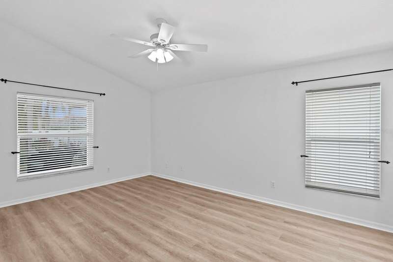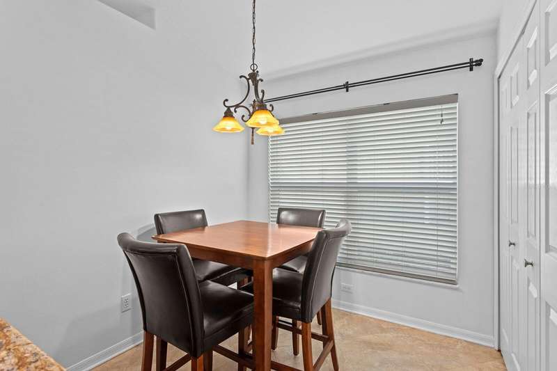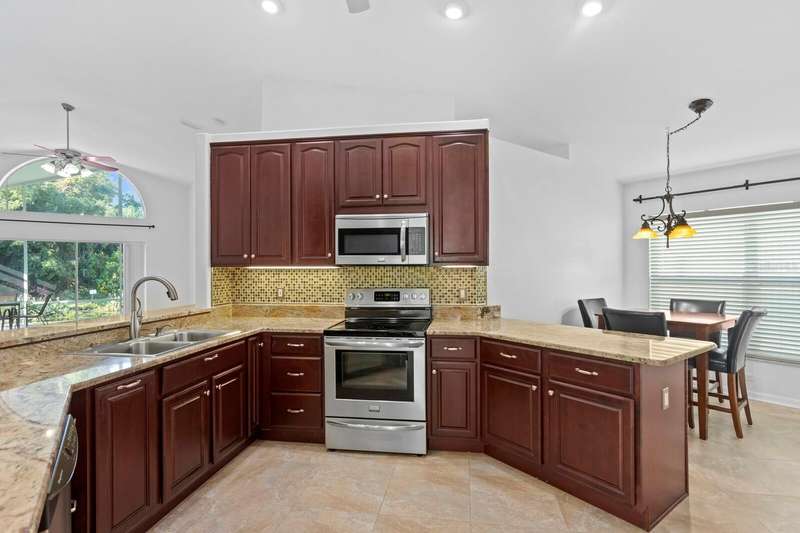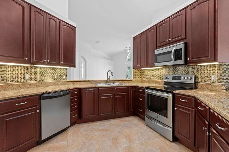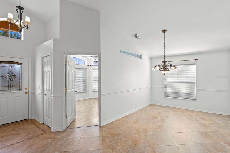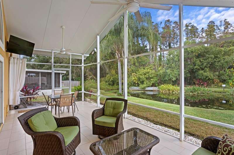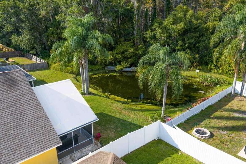 One or more photo(s) has been virtually staged. This exceptional home stands out from the moment you arrive. The curb appeal has immaculate landscaping and a pristine exterior that reflects true pride of ownership. Inside, the home feels even better than brand new, offering thoughtful updates, and a serene conservation setting, all with no HOA restrictions. A formal entry welcomes you with an elegant custom tile inlay and a direct sightline to the tranquil pond and lush conservation beyond. A convenient coat closet adds functionality perfect for when you are walking in from a rainy or chilly day. Vaulted ceilings flow through the main living areas, enhancing the open and airy feel. Just off the foyer is a versatile fourth bedroom that can also serve as an office or den. The dining room is spacious and ideal for gatherings, overlooking the well-designed kitchen. The kitchen features granite countertops, a coordinating tile backsplash, solid wood Kraftmaid cabinetry, under-cabinet lighting, extra storage above the refrigerator, and multiple additional cabinets placed for maximum efficiency. The family room offers generous space for daily living and entertaining, complete with pre-wiring for a surround sound system. Designed for privacy, the primary suite is quietly placed at the back of the home, where wide pond views set the perfect tone for unwinding. The en-suite bathroom has been fully remodeled and includes dual sinks, a walk-in shower, a heated jetted soaking tub, and a custom walk-in closet. All bedrooms feature Lifeproof luxury vinyl flooring and custom closet organizers, while the main areas and bathrooms offer 20x20 porcelain tile for style and durability. Outdoor living is a highlight with an oversized solid insulated lania roof equipped with two ceiling fans, a mounted TV that conveys, and a designated doggie area for rainy days. Enjoy the serene natural backdrop with sweeping views of the pond and conservation area for privacy and tranquility. Additional upgrades include dual-pane low-E windows with argon gas, a tankless water heater, a 2023 water softener, mature landscaping, a reclaimed-water irrigation system, faux wood blinds, and custom cabinetry in the garage. The roof features dimensional shingles with commercial-grade reinforced underlayment, and the exterior paint includes a UAUB blocker for long-lasting protection. With no HOA, city utilities, and CDD fees that include trash and recycling services, this home combines comfort, freedom, and exceptional care in one remarkable package. All while being just minutes from Wesley Chapel’s best shopping, grocery stores, dining, major hospitals, top-rated schools, and quick access to I-75 for an easy commute. Everyday convenience meets unmatched tranquility in this beautifully maintained home.
