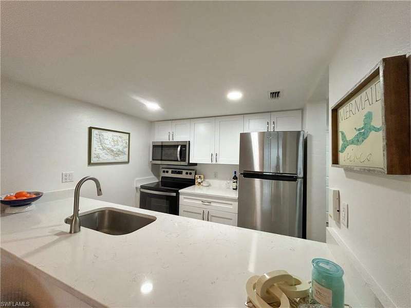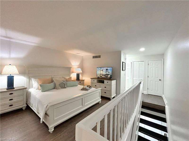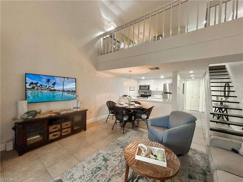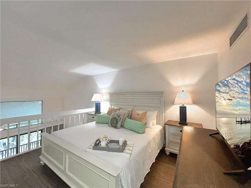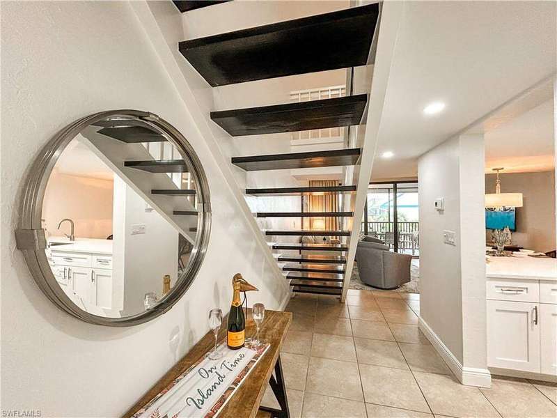 Located behind the gates of South Seas Resort, the exclusive South Seas Villas community offers a serene coastal retreat with a sundeck, pool, gazebo featuring a outdoor dining area, and BBQ facilities. Nestled within the southern enclave, just steps from the beach, this renovated top-floor, two-story villa overlooks a lush courtyard and tropical vegetation. The open-concept design showcases quartzite countertops, white shaker cabinetry, and tile flooring in living areas, all complemented by stylish coastal decor and furnishings. Natural light pours in through impact sliding glass doors and a large picture window, while the screened lanai provides a perfect spot to enjoy the island breeze. The lower level hosts a private guest ensuite, while the upper level boasts a spacious primary ensuite, creating an ideal layout for both relaxation and entertaining. Experience resort-style living in this beautifully appointed villa- where modern elegance meets coastal charm.