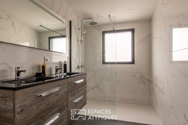 The entrance hall leads to a spacious and bright living area consisting of a living room, a dining room, and an open-plan kitchen with a dining area. This living space of over 55 sqm is bathed in light thanks to large bay windows overlooking the terrace and the outdoors. A master suite with a dressing room and private bathroom allows for single-story living. The upstairs sleeping area consists of two bedrooms and a bathroom. A laundry room and a garage complete the features of this house. The fully enclosed and beautifully landscaped garden allows you to enjoy the outdoors in complete serenity.