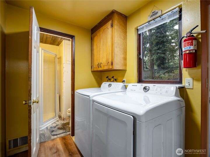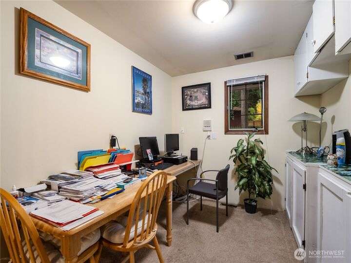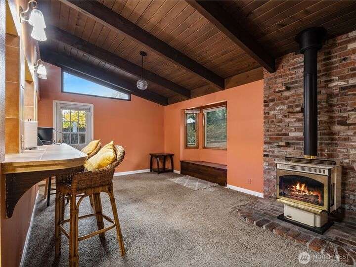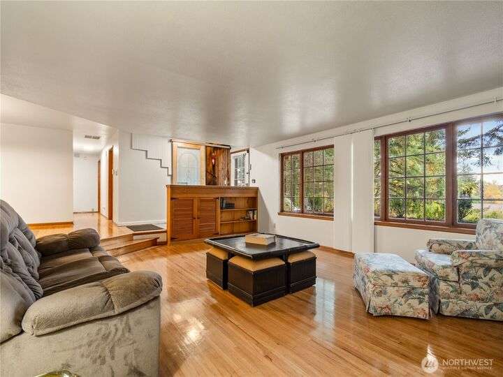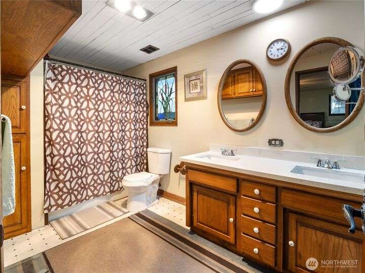 Welcome home! This beautiful property sits high on the hill with views of seasonal Carp Lake. The kitchen opens to a spacious family room featuring vaulted ceilings, gas fireplace, eating bar, & bay windows. Large formal living room offers a wood-burning fireplace & is adjacent to the dining room. Gleaming hardwood floors run throughout the main living area. Main floor includes 4 bdrms & 2 bthrms. Upstairs, you’ll find the primary suite with gas fireplace, full bath, & walk-in closet, plus an additional bdrm, bonus room, & office. Outside, a large deck with built-in seating wraps around the fenced yard, complete with a shed & bball court. Spacious 2-car garage provides ample parking & storage. Conveniently located near schools & JBLM.