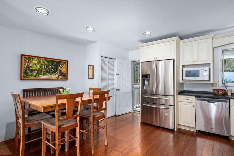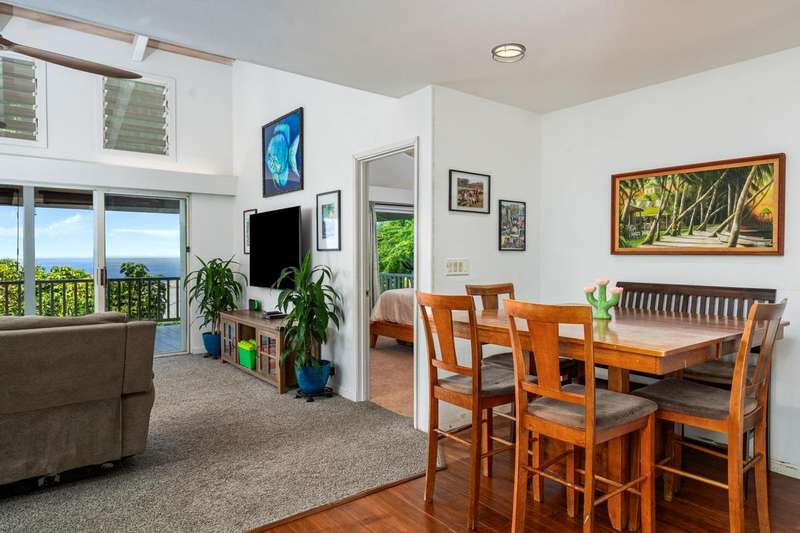 Downstairs (2 bed/1 bath): Separate entrance, full kitchen (stove not included), washer/dryer, and lanai with hot tub and ocean views.