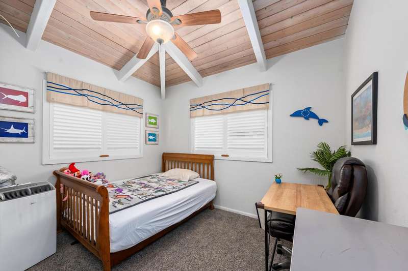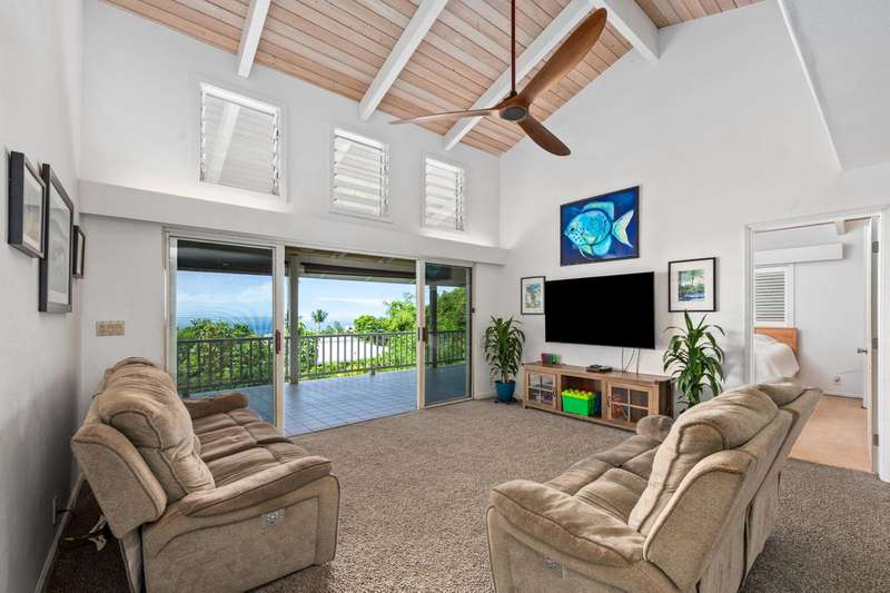 Upstairs (3 bed/2 bath): Main home, Open-concept living with vaulted wood open-beam ceilings, granite kitchen counters, split floor plan with primary and guest rooms separated by living space and large lanai perfect for watching year round sunsets.