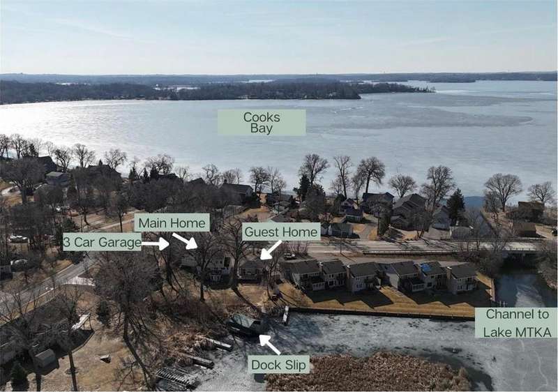 Welcome to Lake Minnetonka living! This rare opportunity includes a deeded dock slip connected to the property! It is located on Lost Lake Channel with easy and direct access to Lake Minnetonka! The property features a beautiful home, charming guest house, and 3 car garage! Offering incredible flexibility as a primary residence, weekend retreat, or investment property. The main home showcases an open-concept main level with an updated kitchen and spacious living area. Upstairs you'll find three bedrooms and two bathrooms, including a private primary ensuite. The lower level includes a charming walkout mudroom, a wet bar, a 3/4 bath-perfect for guests or entertaining. The guest house includes a full bathroom, kitchen and additional bedroom-ideal for hosting visitors, a private office, or potential rental income. Both the main home and guest house offer decks with beautiful views of the channel. An oversized 3-car garage provides ample room for storage, toys, and lake gear. The property has a massive and private backyard, perfect for entertaining or relaxing! Walk right out to your dock and enjoy all that Lake Minnetonka has to offer! Whether you're dreaming of a lake lifestyle, searching for a cozy cabin, or looking for a smart investment-this one has it all!