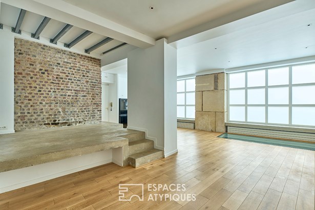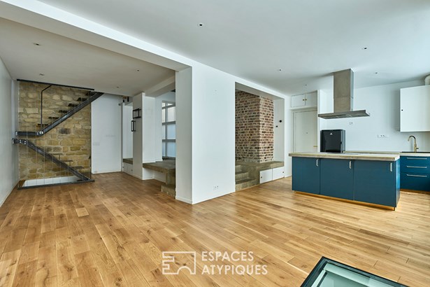 Upon entering, a fitted kitchen in shades of blue with a central island opens onto a vast 54 m2 living room, bathed in light thanks to a double glass facade. Concrete, metal, and exposed stone create a raw and warm atmosphere, faithful to the spirit of the space.
