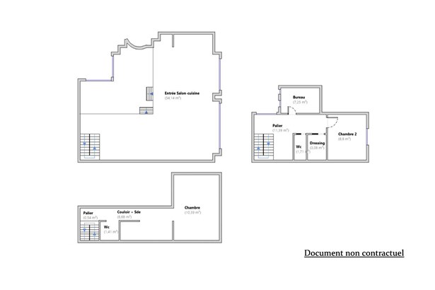 Upstairs, a large landing leads to a 7 m2 bedroom/office overlooking the courtyard, a dressing room, a toilet, and a 9 m2 bedroom overlooking the street.