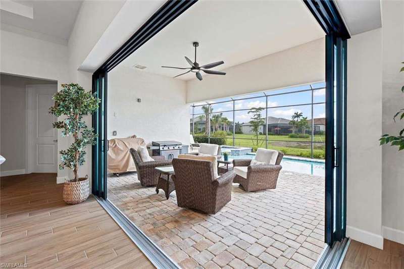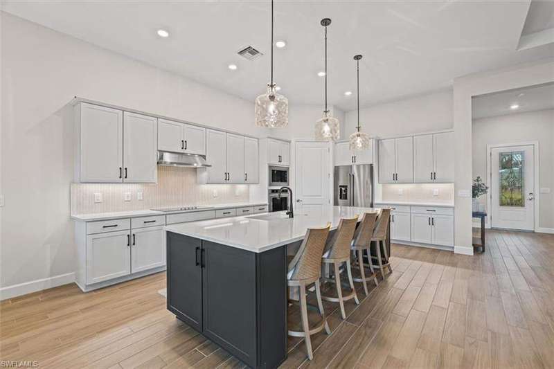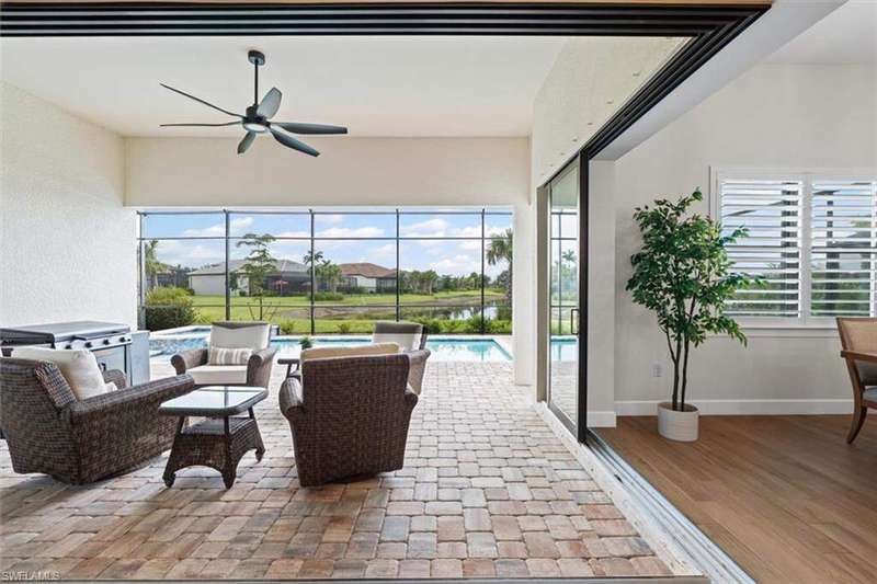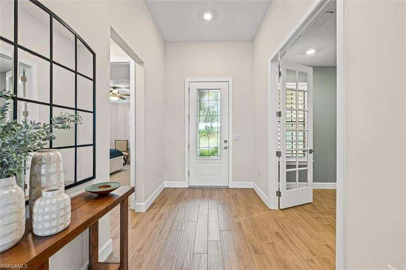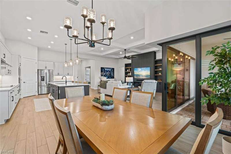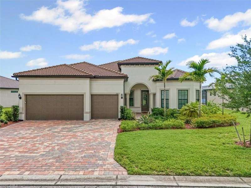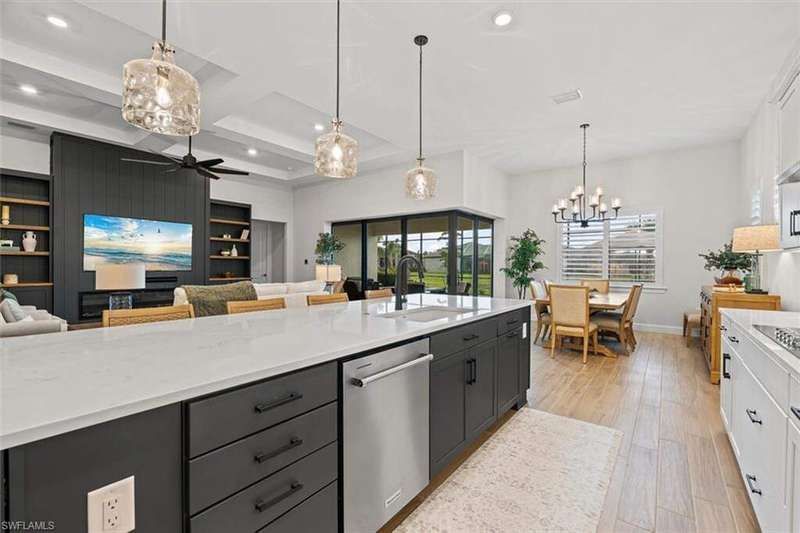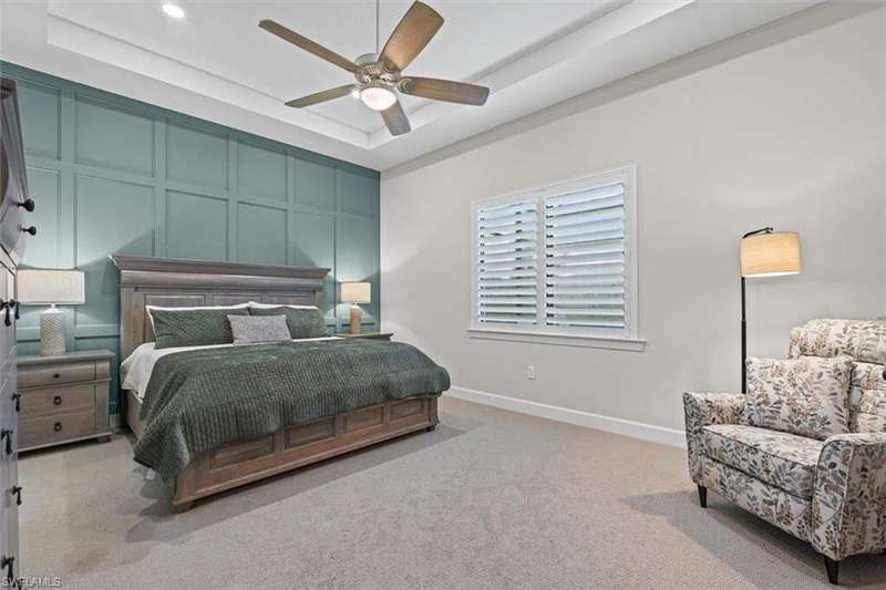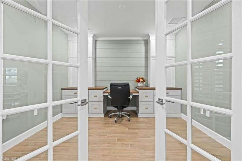 Experience refined elegance in this stunning, model-inspired home nestled on a serene cul-de-sac lot with breathtaking water and golf course views in the prestigious River Hall Country Club. From the moment you enter, exquisite craftsmanship captivates, with soaring coffered ceilings in the living room, elegant tray ceilings in the primary and guest suites, and custom built-ins in the private office, complete with cabinets and a desk for work or relaxation. Vibrant custom accent walls, designer paint, and a dramatic entertainment wall in the living room create a sophisticated ambiance. The open-concept chef's kitchen, with sleek darker island cabinets for bold contrast, flows seamlessly into the great room and dining area-an entertainer's dream. Plantation shutters throughout add timeless charm. The primary suite is a tranquil sanctuary, featuring custom wall accents, a spa-inspired bath with dual vanities, an oversized walk-in shower, and a meticulously organized walk-in closet. Guests will feel pampered in private retreats, one with an en-suite bath and another offering ample comfort and privacy. Glass zero-corner sliding doors open to an expansive covered lanai, perfect for unforgettable gatherings, complete with a heated pool and spa for year-round relaxation and generous deck space for lounging or games. The three-car garage, ideal for car enthusiasts or golf cart lovers, provides abundant storage, blending function with luxury. River Hall Country Club offers a vibrant lifestyle with HOA and golf fees covering an array of premium amenities: cable, high-speed internet/WiFi, irrigation water, lawn/land maintenance, exterior pest control, access to recreational facilities, 24/7 security, street lights, street maintenance, and the renowned championship golf course. Enjoy pickleball courts, a resort-style pool, a state-of-the-art fitness center, a clubhouse, and on-site dining. Seize this extraordinary opportunity-schedule your private tour today and elevate your lifestyle in this unparalleled haven of luxury and leisure! No Flood Insurance required...located in desireable Zone "X"