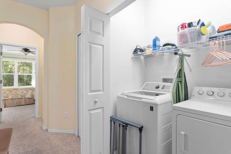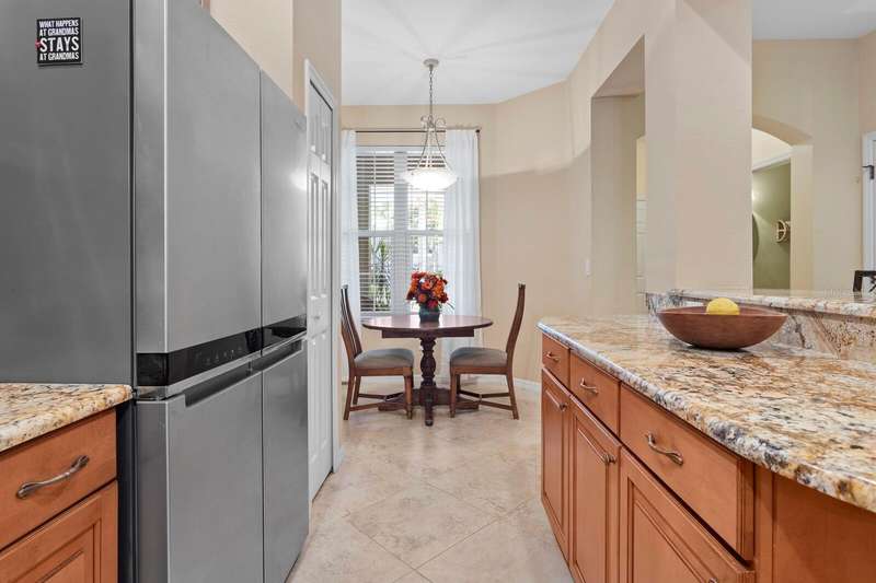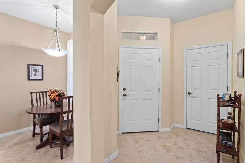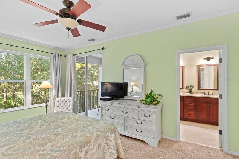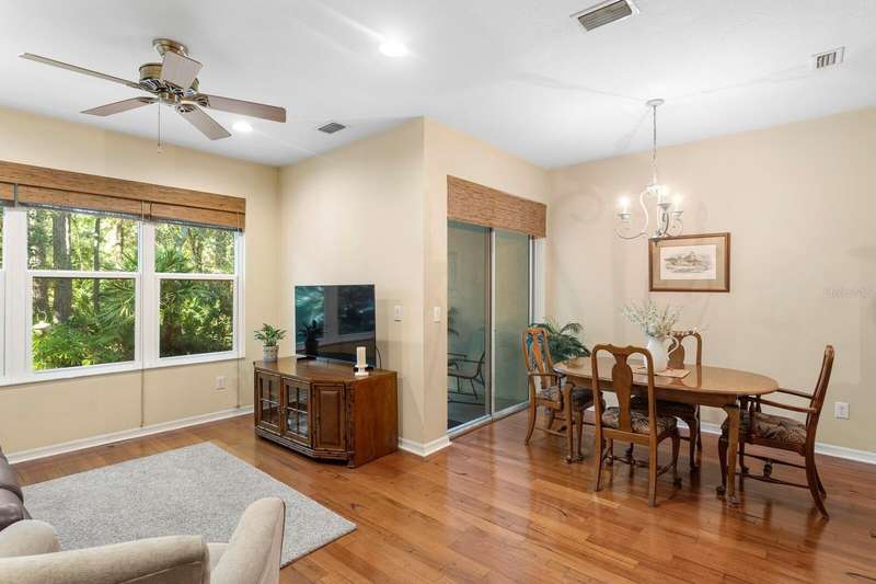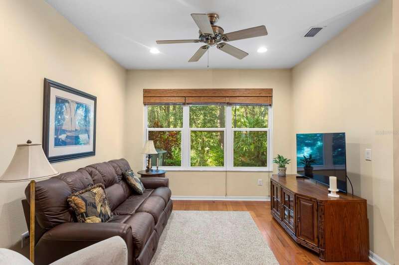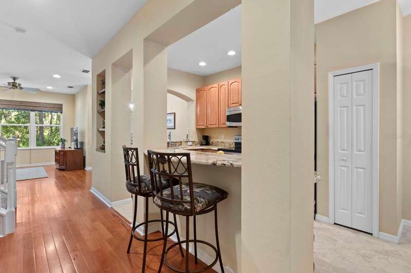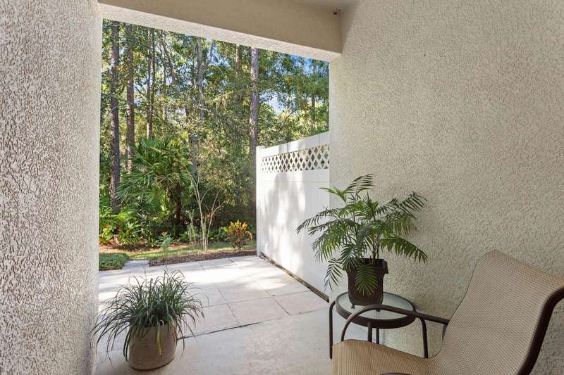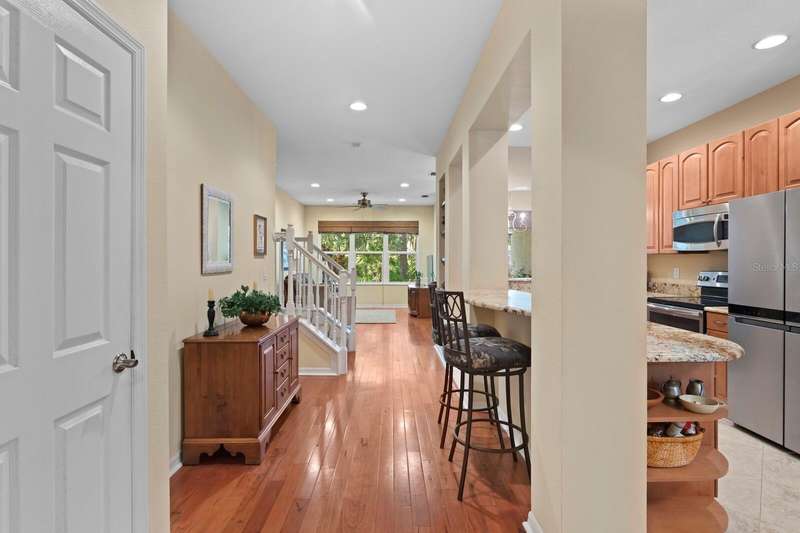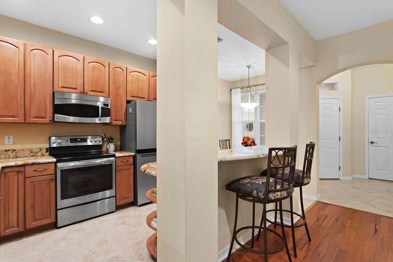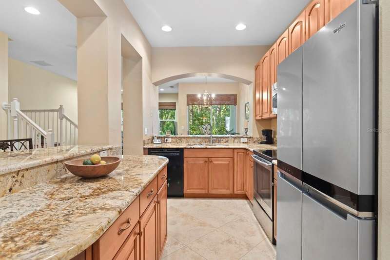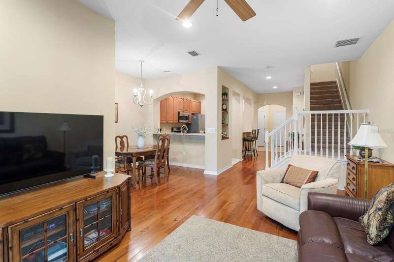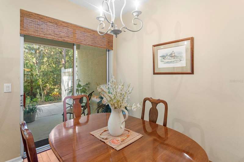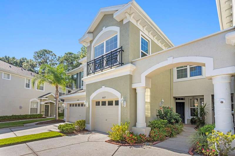 Welcome to this beautifully maintained 3-bedroom, 2.5-bath Townhome with an extended 1-car garage—nestled on a peaceful conservation lot in the desirable gated community of Hampton Chase. Designed for comfortable and stylish living, this home features a bright, open floor plan with abundant natural light and tasteful finishes throughout. The Living and Dining Rooms showcase elegant wood flooring and large windows framing serene conservation views. Sliding doors lead to a covered, extended patio with a privacy fence—perfect for al fresco dining or enjoying your morning coffee while watching the occasional wildlife. The spacious eat-in Kitchen is ideal for entertaining, featuring stainless steel appliances, wood cabinetry, granite countertops, two breakfast bars for casual dining, tile flooring, a double sink, a closet pantry, and generous counter space. A convenient half bath and a large under-stair storage closet complete the first floor. Upstairs, you’ll find 3 generously sized bedrooms, including a Primary Suite with sliding doors to a screened balcony overlooking the tranquil conservation. The suite includes a large walk-in closet and a luxurious ensuite bath renovated with wood cabinetry, granite counters, dual sinks, a large walk-in shower, travertine flooring, and decorative built-in glass shelving. Two additional bedrooms—one with a walk-in closet and the other with dual wall closets—share a beautifully appointed full bath with dual sinks, quartz countertops, and a tub/shower combination. For added convenience, the laundry closet is located on the second floor near all bedrooms. Recent upgrades and features include: Impact-rated triple-pane windows (up to 150 mph wind resistance) with transferable lifetime warranty, New Water Heater (2025) New refrigerator (2023). For durability and energy efficiency, this townhome was built with concrete block on both levels. Hampton Chase is known for its peaceful ambiance, friendly neighbors, and well-maintained amenities, including a heated year-round community pool and playground. Ideally located near A-rated schools, this home offers easy access to Tampa International Airport, shopping, dining, entertainment, and the beautiful Gulf beaches—everything Tampa Bay has to offer at your doorstep.