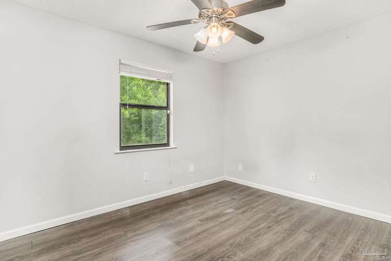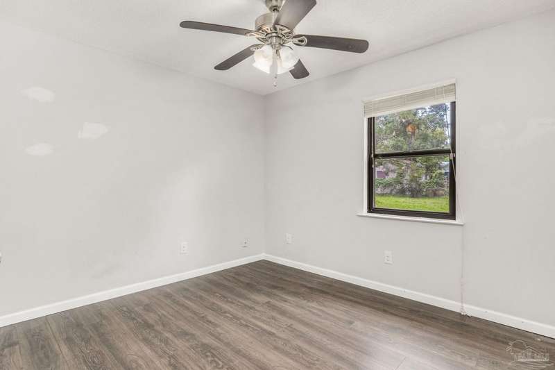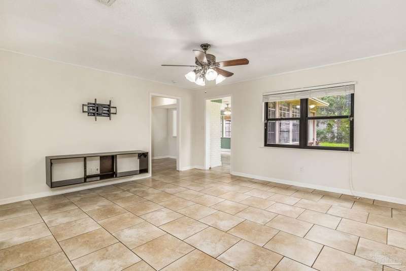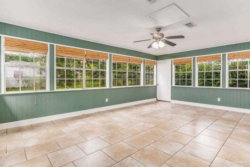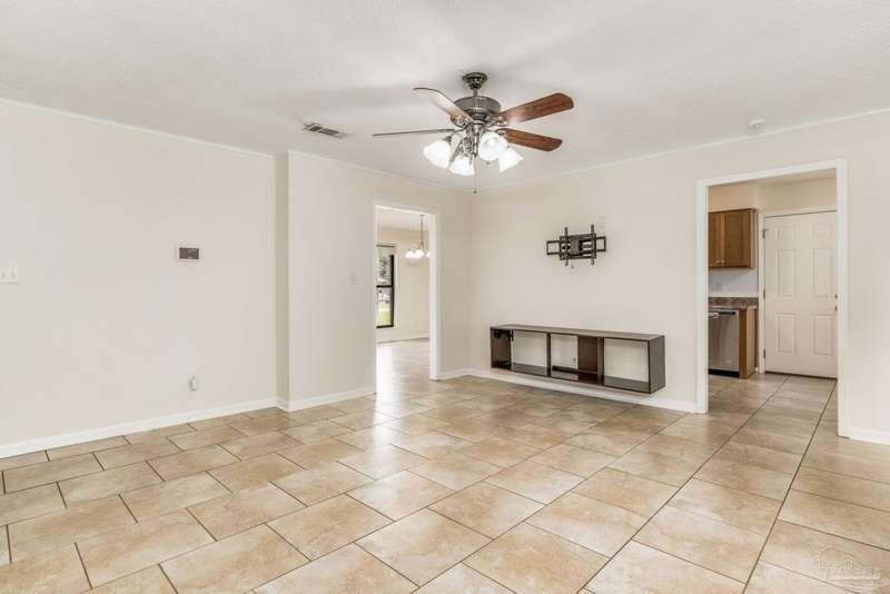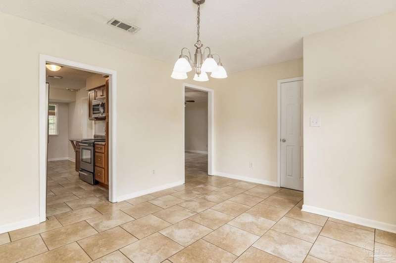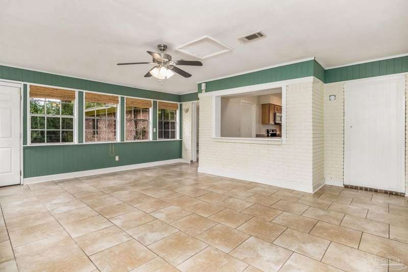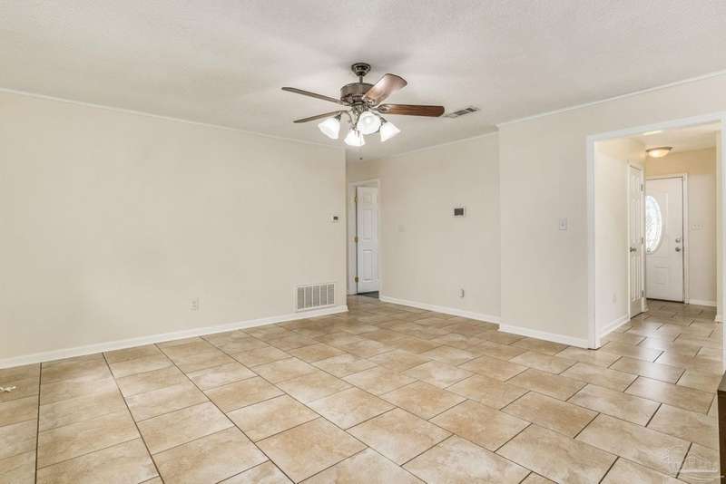 Fall in love with this Cantonment charmer! Known for its highly rated schools, convenient location near Navy Federal Credit Union, medical centers, and easy airport access, Cantonment offers the perfect balance of community and convenience. Sip your morning coffee on the covered front porch, then pull right into the attached garage. Inside, sunshine fills an open layout with easy-care tile floors in the main areas, no carpet anywhere. The spacious dining area flows into a streamlined galley kitchen with stainless-steel appliances and warm wood cabinetry with laminate countertops. Just off the kitchen, the living room is perfect for movie nights or the big game and opens to a flexible window-lined bonus sunroom, with direct backyard access for effortless indoor-outdoor living. The private primary suite features a tiled walk-in shower and a single vanity. Three additional bedrooms offer LVP flooring, ceiling fans, and generous closets, and they share a second full bath with a tiled tub/shower combo. Outside, enjoy a fenced backyard ideal for pets, play, or relaxing, plus an open patio for weekend BBQs or quiet mornings with coffee. Fresh interior paint completes the move-in appeal, this home is ready when you are!