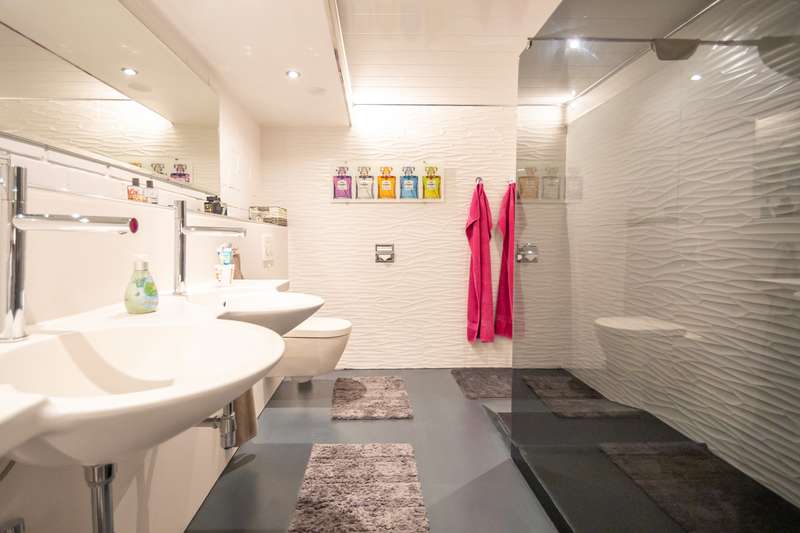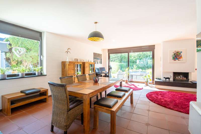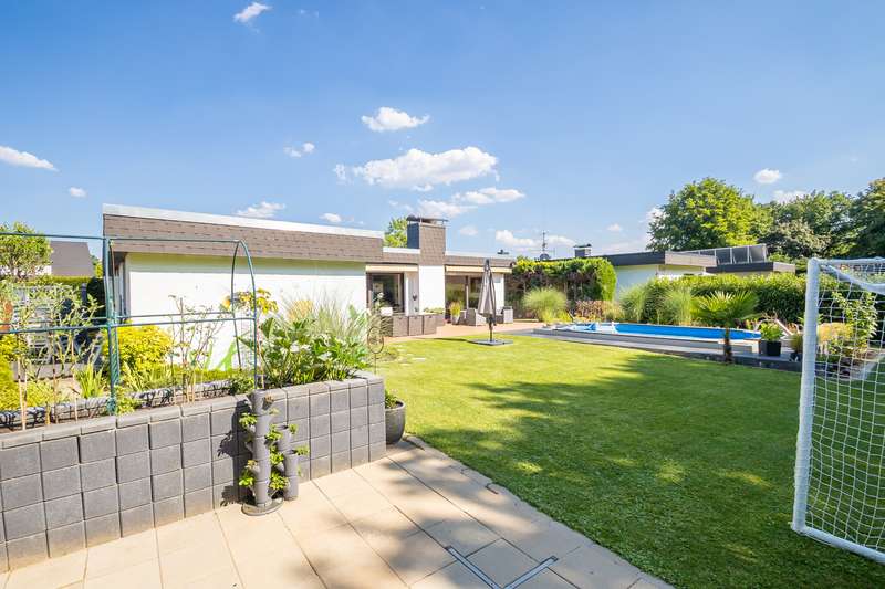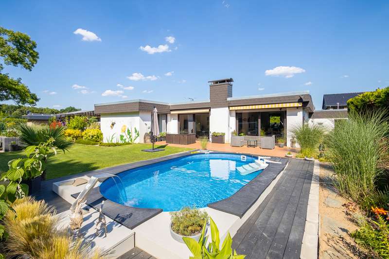 Welcome to a special opportunity: This well-kept bungalow from 1979 is situated on a generous plot of around 824 m² and impresses with its timeless architecture, well thought-out room layout and continuous modernization, which sustainably increases living comfort. With a living space of approx. 170 m², the house offers a wide range of possible uses, whether as a spacious family home, a multi-generational solution or a combination of living and working under one roof. The lovingly landscaped garden with lush planting and an inviting pool creates a private oasis of retreat with a high quality of living. The property has been continuously maintained and technically upgraded. A modern gas central heating system was installed in 2014 and has provided a reliable and efficient heat supply ever since. In 2020, the basement was extensively converted into a fully-fledged living space, a significant added value that gives the house additional flexibility. The most recent investment was made in 2024 with the installation of a photovoltaic system, which not only improves the energy efficiency of the house, but also enables future-oriented and sustainable living. The first floor impresses with a functionally well thought-out floor plan that offers space for versatile use. The central hallway leads to a spacious living and dining area with direct access to the terrace and a view of the garden. Here, living and nature merge into a harmonious whole. The open kitchen is equipped with a high-quality fitted kitchen and brand-name appliances and offers convenience for everyday use. This area is complemented by a separate granny apartment, which is accessible via the hallway. This unit has a bedroom, a living room, two well-kept bathrooms and its own kitchen and is ideal for guests or relatives. This living area also offers direct access to the countryside via a second terrace. The fully developed basement complements the living space in a well thought-out way and clearly sets the property apart from classic bungalows! The internal staircase leads to a spacious hallway that provides access to a further bedroom, a large children's room and two stylishly modernized bathrooms. Both bathrooms are assigned to the bedrooms, creating separate retreat areas. A dressing room offers additional comfort and storage space. The basement is completed by a functional laundry room with connections for washing machine and dryer, two spacious cellar rooms and a separate boiler room. The comfortably converted rooms can be used flexibly as living areas for teenagers, guests, home offices or hobby rooms. The outdoor area underlines the special charm of this property. The beautifully ingrown garden with carefully landscaped planting and well-tended green areas offers a successful combination of privacy and relaxation. On hot days, the pool invites you to cool off, while two spacious terraces offer plenty of room for relaxing hours outdoors. A garage rounds off the offer. This property combines contemporary living comfort with sustainable technology and a flexible room layout - an ideal home for families or discerning owner-occupiers. The generous living space, the very well-kept condition and the quiet location contribute significantly to the special character of this offer. Please do not hesitate to contact us for further information or to arrange a viewing appointment.