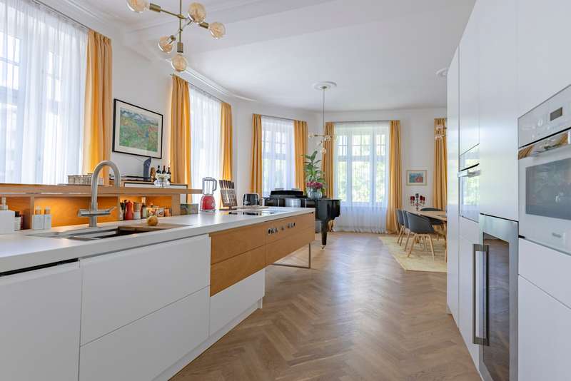 This spacious and as-new apartment extends over a living space of approx. 220 m² and is located in an impressive old building dating back to 1895. It is situated on the 2nd floor of a beautiful old building, which underwent extensive refurbishment in 2013. The property impresses with its high ceilings and well-kept herringbone parquet flooring, which combine the elegant charm of a traditional property with ultra-modern furnishings. The apartment's five rooms are generously proportioned and offer a variety of uses. The room height and the carefully selected materials contribute to the high quality of living. A highlight of the apartment is the extravagant kitchen, which is equipped with high-quality appliances and a stylish design. It not only offers plenty of space for cooking, but also the opportunity to entertain guests or create culinary experiences. The exclusive fittings in the bathrooms deserve special attention. There is a full bathroom, a shower room and a guest WC, all of which meet the highest standards. Fine materials and well thought-out details ensure special moments of well-being. The apartment also has a utility room (HWR) and a storage room, which offer additional storage space. The property has central heating, which ensures even and comfortable warmth in all rooms. The high-quality fittings and well thought-out room layout underline the exclusivity of this apartment. The property can also be divided, which makes it particularly flexible for different living concepts. Thanks to its central location, there are excellent connections to the city's transport network. Stores for daily needs, schools and leisure facilities are all within easy reach. The property is not only a place to live, but also offers space for representation and private retreat. The combination of historical charm and modern amenities makes this apartment a unique home for discerning city dwellers. We would be happy to arrange a personal viewing to show you the many possibilities and high-quality fittings of this special apartment. Contact us to arrange an appointment and let us convince you of the advantages of this property.