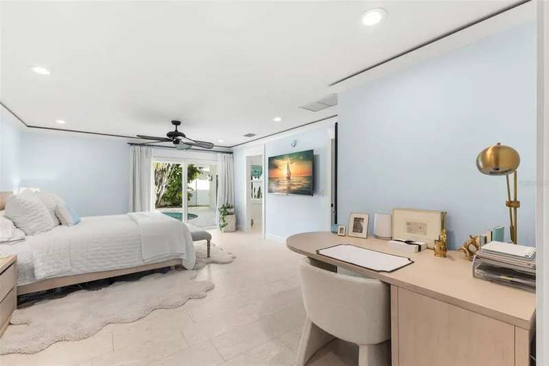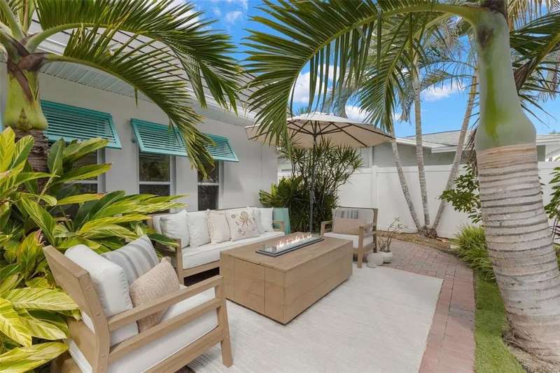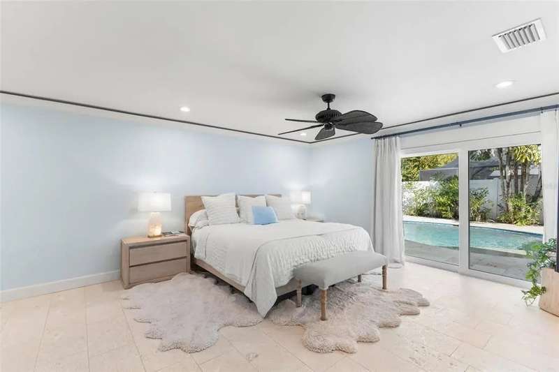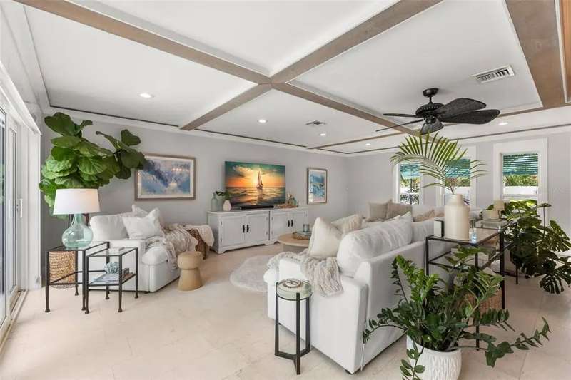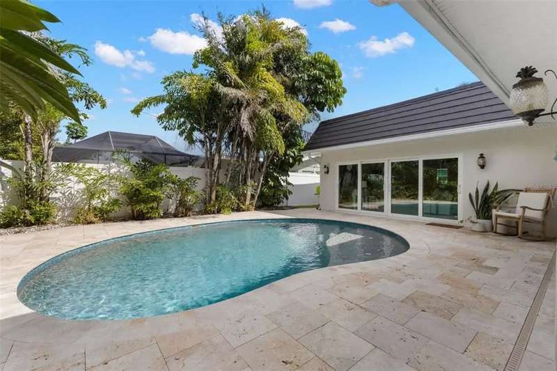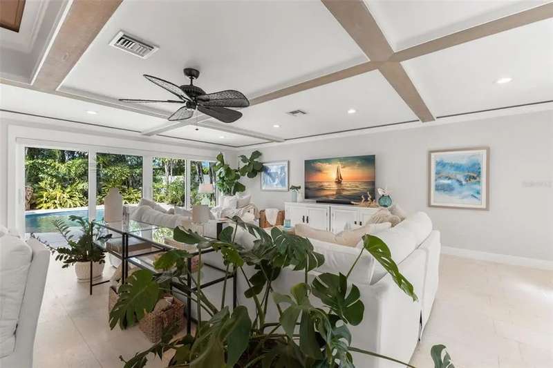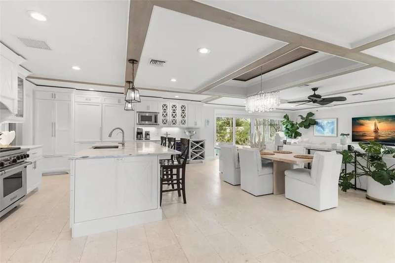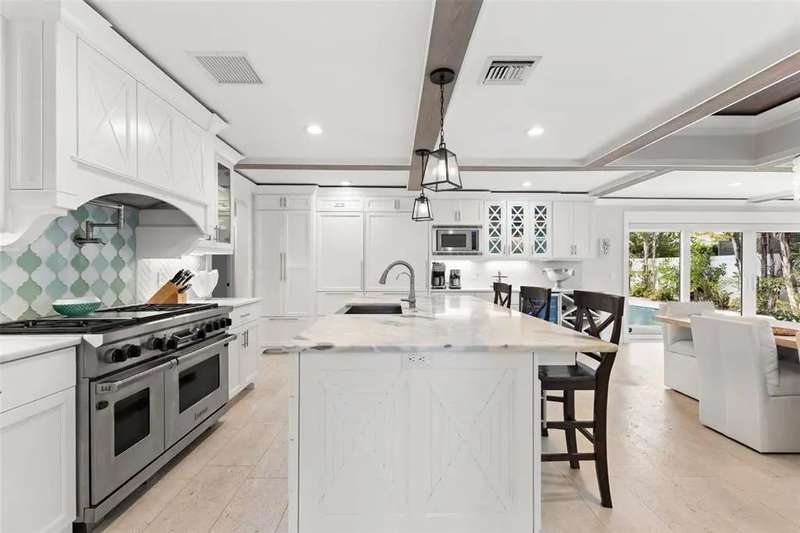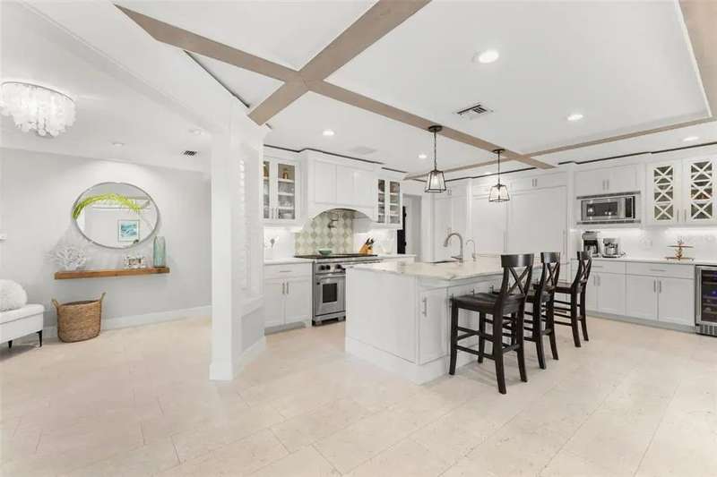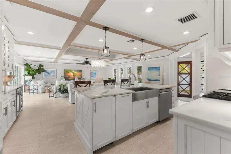 Embrace the elevated and elegant style of this Coastal Contemporary Pool home in Tierra Verde. With a casual sophistication reminiscent of that one effortlessly stylish friend, this residence blends a welcoming atmosphere with refined design throughout. Step through the charming courtyard entry, complete with cozy seating around a gas fireplace, and enter through custom mahogany doors. The foyer leads seamlessly into the kitchen, while cool shell tile floors and warm wood ceiling accents define the open-concept space. The kitchen stands out with coffered ceilings, a striking gas range alcove, and a large quartzite island featuring a double apron sink. Culinary amenities include two SubZero refrigerators, a dual-zoned wine chiller, and a built-in beverage cooler. The adjacent dining area, highlighted by a stunning chandelier and a trayed ceiling, is the centerpiece of the great room. Expansive sliding doors open from the living area to the pool and lanai, inviting sunlight and sparkling water views into the home each afternoon. Three bedrooms each offer ensuite baths for ultimate privacy and comfort. The Primary Suite features sliding doors to the pool, a spacious dressing room with custom closet systems and pocket doors, and a luxurious bath with a double quartzite vanity and Capiz tiled shower. The second bedroom contains a private ensuite bath with custom cabinetry, onyx vanity, and glass tile accents. The third bedroom’s ensuite bath is finished with elegant quartzite and marble details. A powder bath and laundry room are conveniently located along the main hallway, with walk-in pantry storage. Lush tropical plants and palms surround the saltwater Pebbletec pool, which includes a sunshelf and two bubblers, all finished with beautiful travertine pavers. The courtyard and circular drive feature brick pavers, while a reclaimed water irrigation system sustains the landscaping. The attached oversized garage provides ample space for two large vehicles, a workbench, and two storage rooms—ideal for holiday decorations and more.