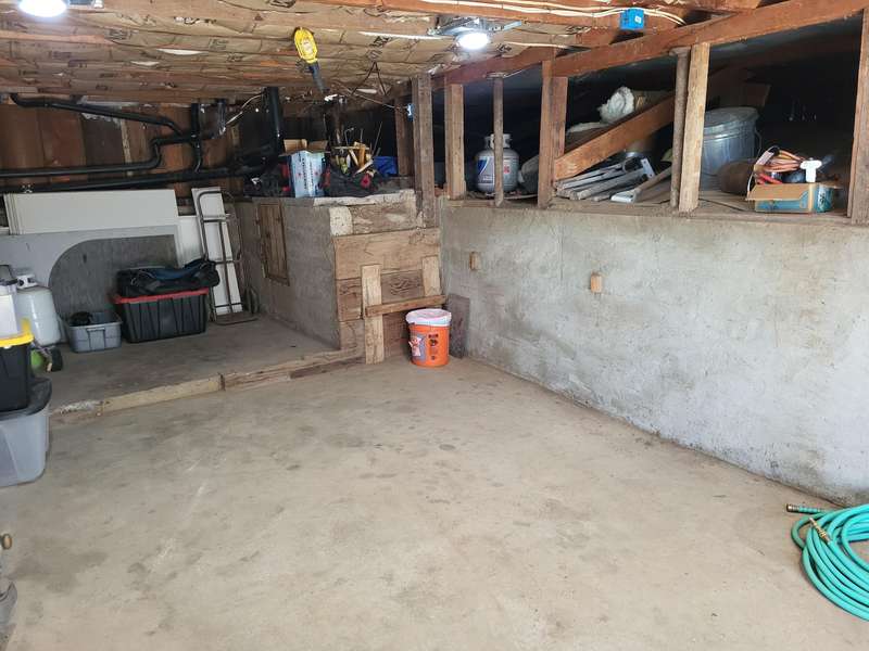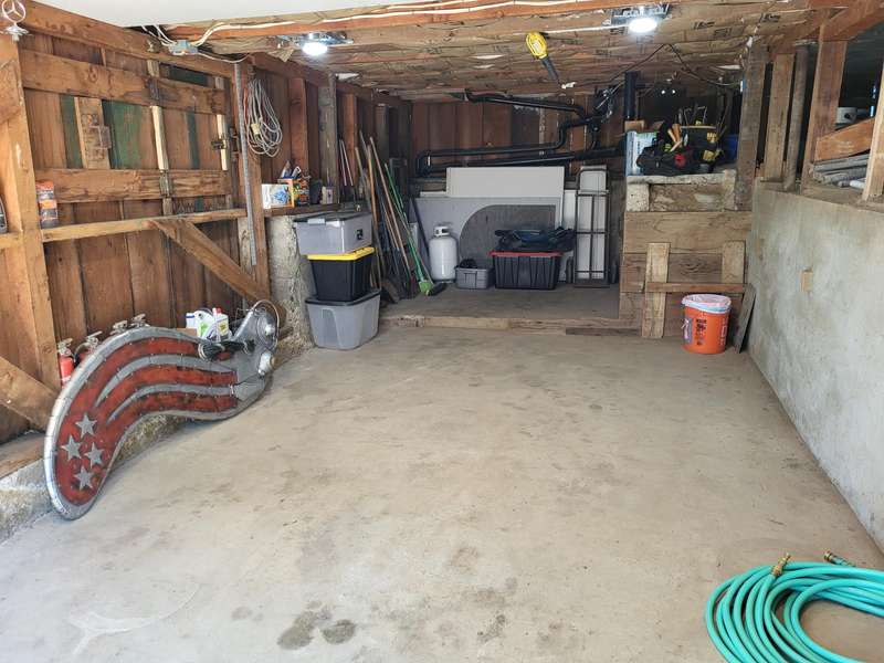A full unfinished basement/garage beneath the house offers additional storage or potential workshop space.