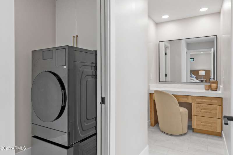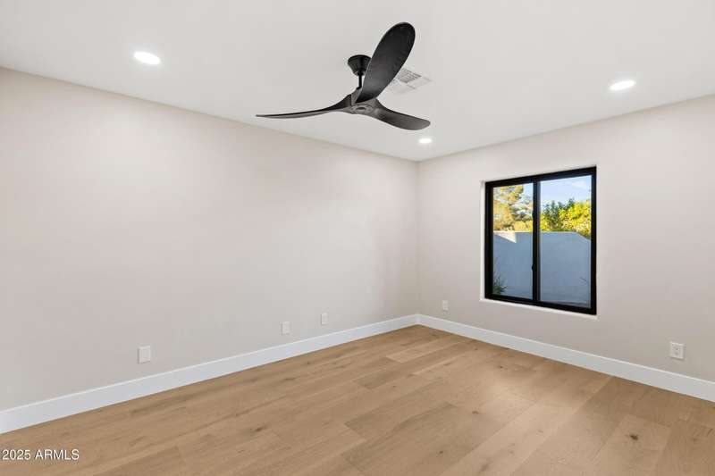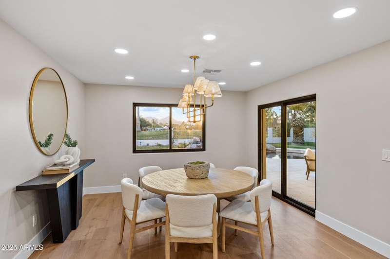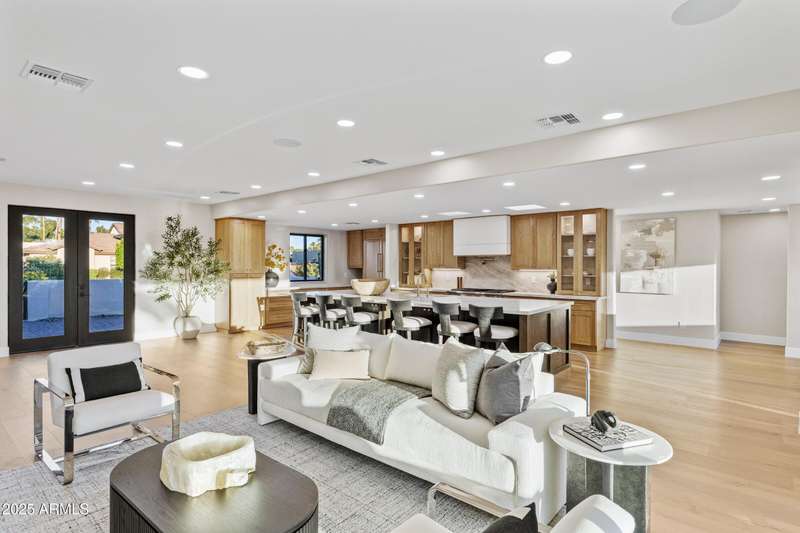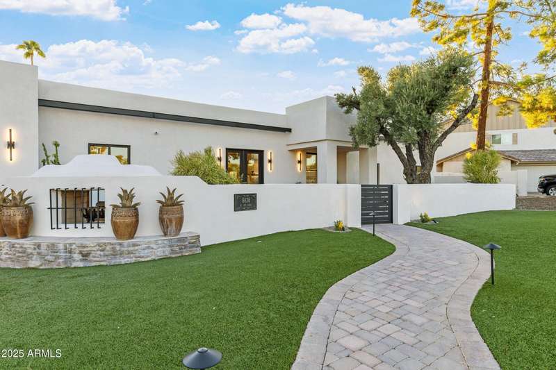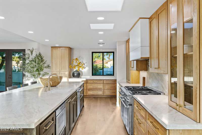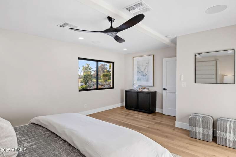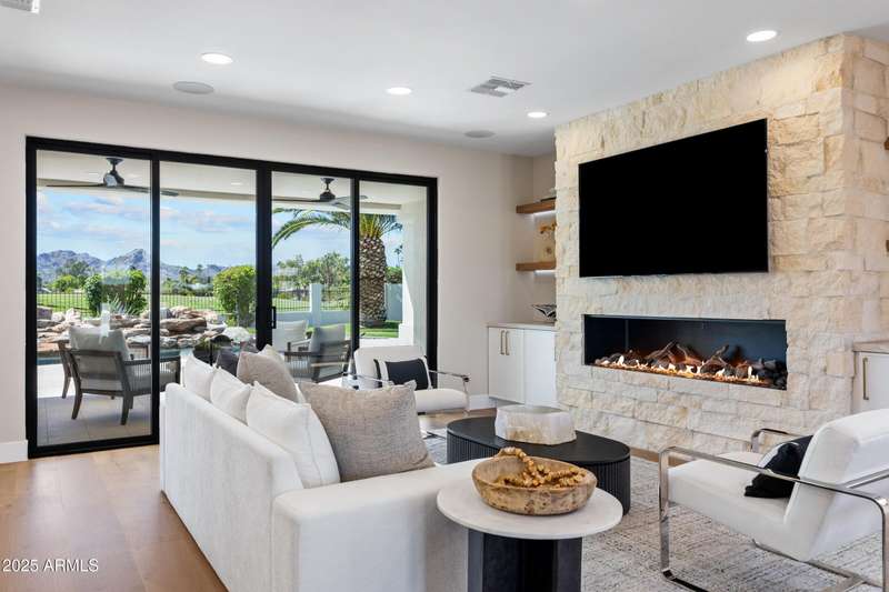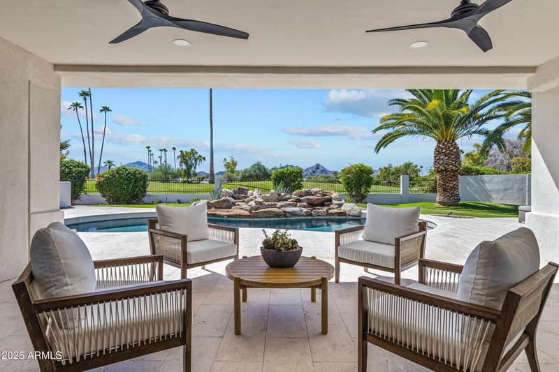With an uncompromising blend of timeless luxury and modern design, welcome to this extraordinary single level estate on a premier golf course lot in McCormick Ranch. Showcasing iconic Camelback Mountain views, this 4 bedroom, 3 bath residence redefines refined living. Inside, European white oak floors, Anderson doors and windows, and a dramatic 72'' open flame gas fireplace set the tone for elegance. The chef's kitchen is nothing short of spectacular, anchored by a 15 foot island, custom stained designer cabinetry, Honed Taj Mahal countertops, and a full suite of Thermador appliances including a 48'' professional double oven. Designed for both grand entertaining and intimate gatherings, the space embodies seamless luxury and functionality. The formal dining room, crowned with a designer chandelier, frames panoramic views of Camelback Mountain and the lush golf course, offering a dining experience unlike any other. The resort inspired primary suite is a private sanctuary, complete with its own sitting room retreat. The spa-like bath boasts custom white oak vanities, a makeup station, a curbless walk in shower, and a freestanding soaking tub perfectly positioned to capture mountain vistas. A boutique style custom closet and in suite laundry area elevate convenience to couture living. An additional guest primary suite offers privacy and sophistication with a walk in closet, custom vanity, and walk in shower, ensuring visitors enjoy the same level of indulgence. Outdoors, the resort experience continues with Marbella Shellstone pavers, a Pebble Tec pool with cascading rock waterfall, and an enviable backdrop of Camelback Mountain rising over the manicured fairways. This is more than a residence, it is a statement of architectural artistry, modern elegance, and breathtaking natural beauty. Welcome home to Via Linda.