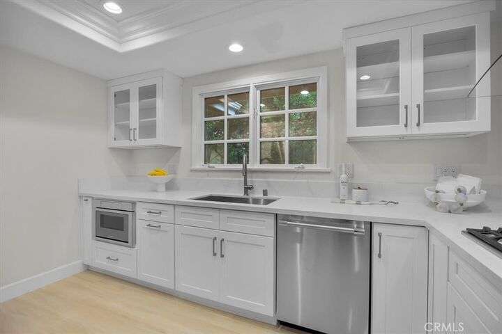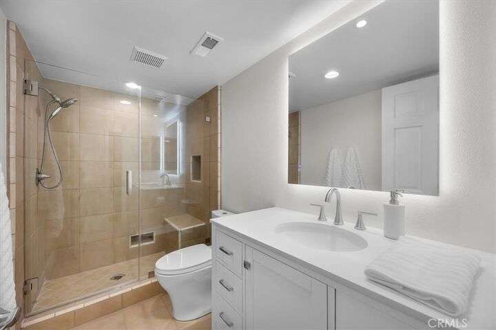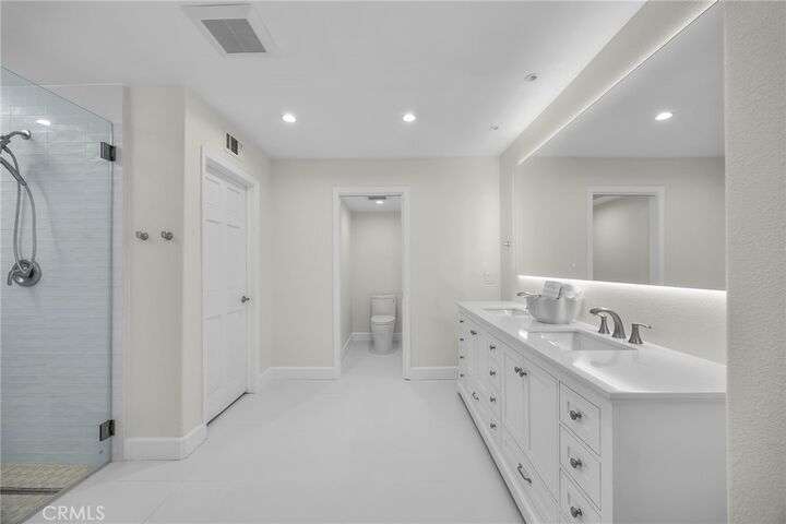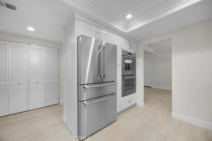 Beautiful and filled with light, this highly desirable, remodeled PLAN 8 home features 3 bedrooms (including a PRIMARY SUITE ON THE GROUND FLOOR) and 2.5 bathrooms. The main living area (living room, dining room, kitchen, and family room) are all on the main floor.The primary bath, completely remodeled, now has an oversized backlit shower with separate showerheads at either end, custom tile, and elegant shower doors. The new dual-sink vanity features a quartz countertop and a large, backlit, antifog mirror.The spacious living room features a fireplace with a new custom quartz surround. Adjacent to the dining room, the walls are lined with windows that offer a picturesque view of the surrounding trees. A doorway from the dining room leads to the brand new kitchen, which features stainless steel Thermador appliances (double oven, refrigerator, cooktop, dishwasher, and a microwave drawer). Adjacent to the kitchen, there's a laundry area for a stackable washer and dryer, and next to it, a pantry with pull out shelves. Down the hall, the powder room has been updated with a new vanity, light fixture, and hardware. The oversized patio flows from both the family room and the primary suite. Upstairs, there are two nicely sized bedrooms. Adjacent, the upstairs bath has been updated with new shower doors, a new vanity, and a backlit antifog mirror. (All three bathrooms have new plumbing fixtures.)The new, light colored luxury vinyl floors installed throughout the home are easy to clean and maintain. The updated oversized garage is ready for cars and storage. Additionally, the home has been newly painted both inside and outside (HOA). Manhattan Village Living Secure, Connected, and Exceptionally Convenient Manhattan Village is a gated community with 24-hour security. This micro community is conveniently located next to the best the city has to offer with its private, walkable access to some of the newest and most desirable shopping, entertainment and more. Within the community, there are well lit sidewalks, a pool and spa, as well as direct access to the Manhattan Village Mall, the Manhattan Country Club and the city’s only golf course. HOA: $760/month. Photos with furnishing have been virtually staged.