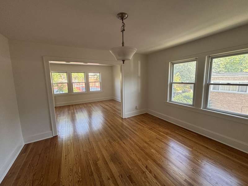 Immediately available. Newly updated two-unit building. 2 bedrooms plus bath. Large eat-in kitchen. Separate living and dining room. Freshly refinished hardwood floors throughout, neutrally painted. Kitchen with granite counter-tops. Central heat and air. Ceramic tile bathrooms. Private laundry and storage in basement. Parking pad off back alley. Large fence-in yard with cement patio. No pets. Across the street from Evanston Township High School, close to Dodge and Dempster shopping district. Feeds into Lincolnwood Elementary and Haven Middle Schools. Has additional walk in closet and storage closet.