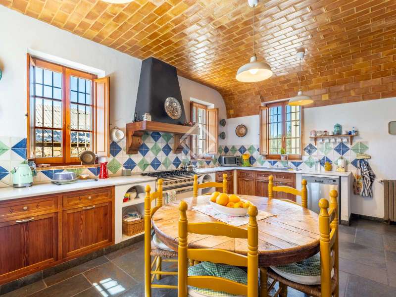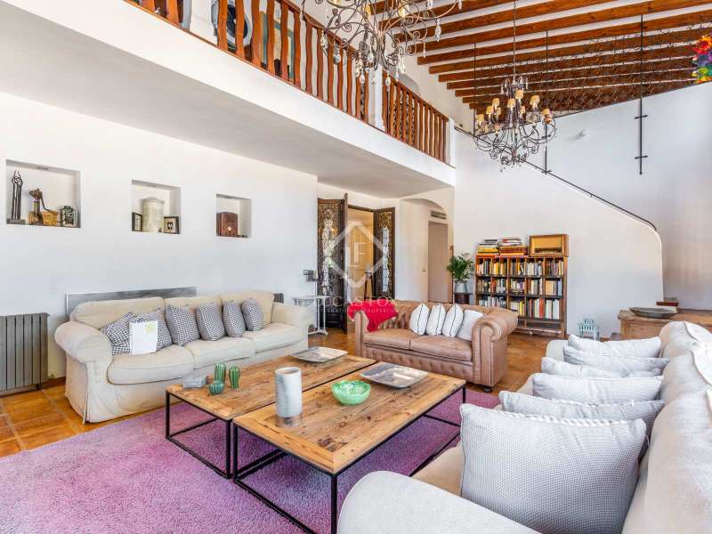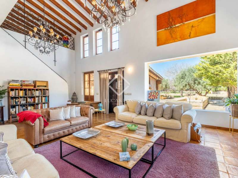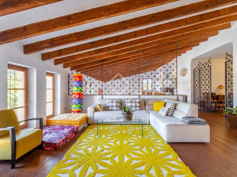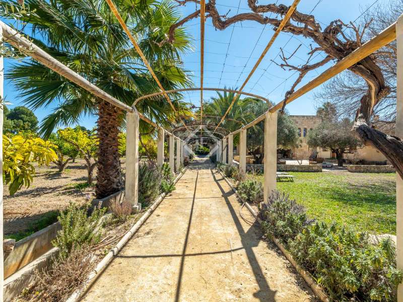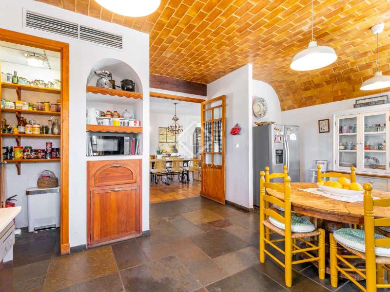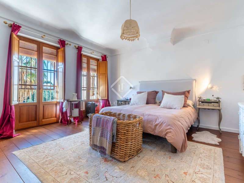 Lucas Fox presents this amazing farm with an impressive 536 m² manor house dating from the end of the 19th century with an unusual style, surrounded by orange and olive trees with gardens and located in an exceptional area of Mutxamel. The farm has a 1.9-hectare plot of land in perfect state of production for organic farming, which gives it an undeniable addition. The mansion is protected by hundred-year-old pine trees and has several cobbled terraces, an almost complete traditional oil press and an old stone utility room . This typical house with an orchard from Alicante has an unusual architectural façade that categorizes it as a historical monument. In the 2000s, it underwent a restoration for three years, without losing its historical value, since the wrought iron balconies on the second floor, the stone tower, the high ceilings and the baked clay were maintained. We enter the property through an African door restored by an artist and go inside. Here, we find elements of great character, from the Moumetiam stained glass window in the early 19th century entrance, the impressive double-height guest living room with its attractive exposed wooden beams, to the second- floor recreation room and its four bright bedrooms and three beautiful bathrooms completely restored with Andalusian hydraulic tiles from the 17th century. The guest living room is connected to a fantastic dining room, as well as to the large fully equipped kitchen with a Lacanche oven and Catalan vaulting vaulted ceilings. Next to the main property , there is a guest house with a spacious living room, two bedrooms, outdoor kitchen and barbecue. Both houses have been renovated respecting the style of the house, with luxury materials, such as the exclusive exterior carpentry in Dussie nautical wood and Climalit glass or the interior carpentry in solid wood. Outside, there is a beautiful garden and an vegetable garden with more than 600 trees: olive trees, cypresses, orange trees, mandarins and other various fruit trees. The large summer courtyard with a covered terrace offers an old stone utility room , which maintains a pleasant temperature during the summer months. Through a path covered with vines, we access the chill-out area with its pool with a Cuban mahogany pergola and iroko wood and fossil stone floors. This fabulous mansion would make an impressive family-friendly property , although due to its size and location it would also be ideal as a luxury boutique hotel.
