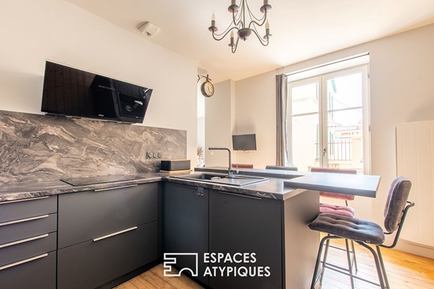 The top floor houses a second bedroom with an en-suite shower room. Opposite, the guest house unfolds its charm over three levels. Its corner facade with green shutters and period ironwork railings is eye-catching. From the entrance, the cement tiles, antique woodwork, and generous volumes evoke the bourgeois elegance of the late 19th century. The tone is set in the reception hall with its graphic flooring and views into the living areas. The bright and understated dining room is enhanced by a tasseled chandelier and eclectic furniture. The adjoining living room offers a cozy and refined setting, bathed in light thanks to large openings. The perfectly preserved old parquet flooring and molded cornices reinforce the authenticity of the place. The kitchen, separated by a double glass door, benefits from a modern and elegant layout. It is designed as a true living space with a central island, careful finishes and a natural stone wall that brings warmth and character. In a corner, a charming cabinet of curiosities houses the second-hand objects and relics discovered during the renovation. On the mezzanine, a sunny bedroom attracts the eye with a freestanding bathtub, an adjoining bathroom and a separate entrance, ideal for complete autonomy.