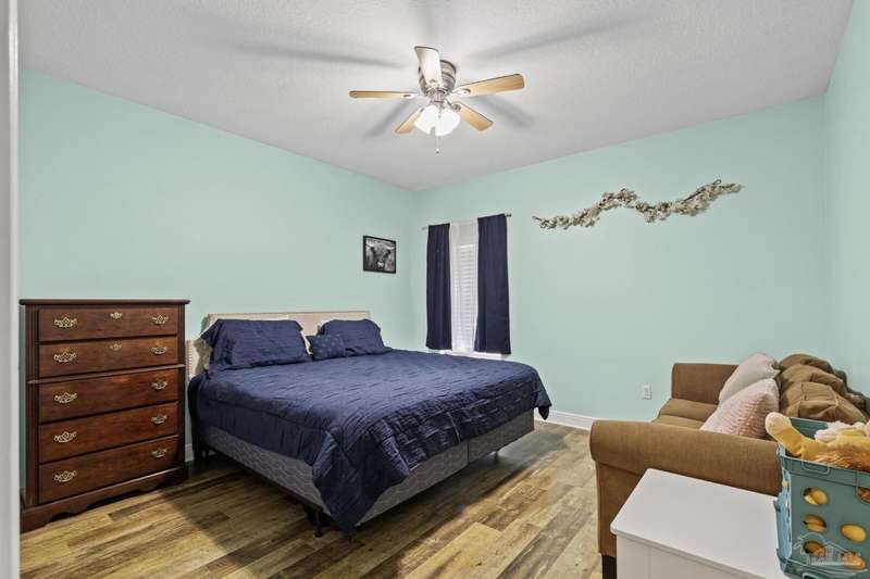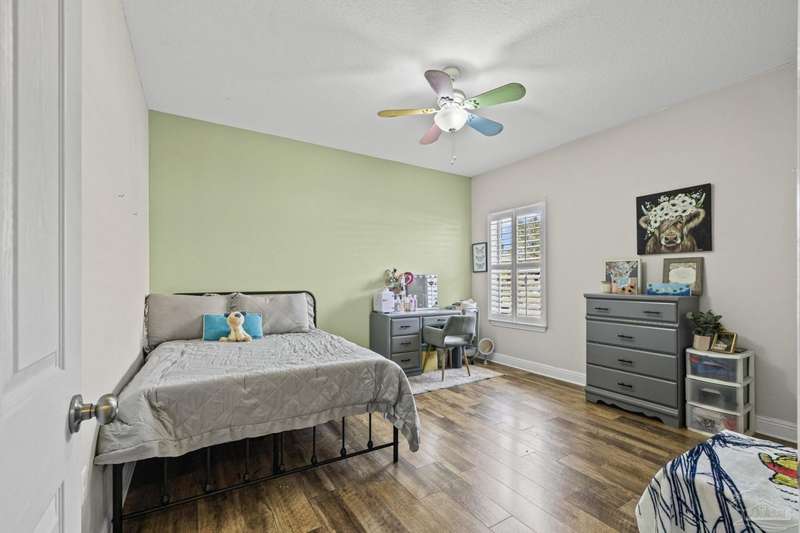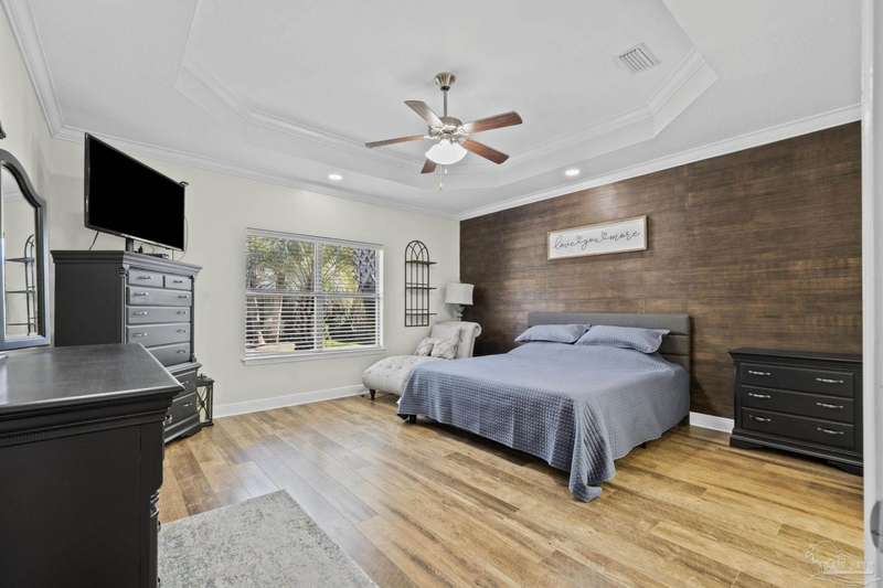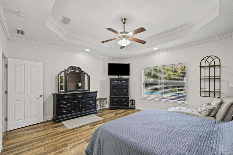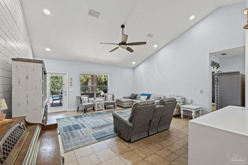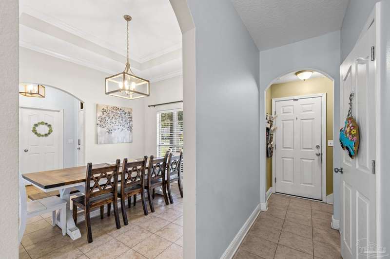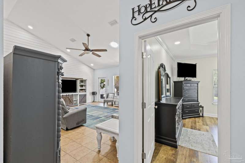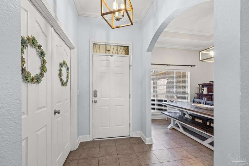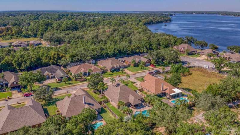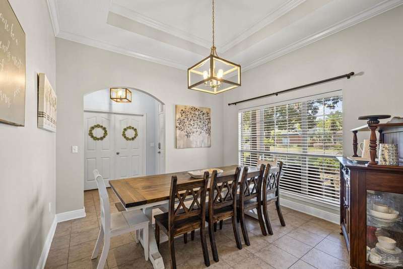 Waiting for a pool home in Navarre? Wait no more! Discover your dream Florida lifestyle in this home within the highly sought-after Grand Bay Estates community in Navarre. This 4-bedroom 2 and 1/2-bath residence, complete with a dedicated private office, offers a split bedroom floorplan, a bonus room upstairs, all hard floors, all solid surface countertops, large open kitchen and lots of added charm and character. Step inside to a bright entry foyer with the office to the right and formal dining room to the left. Then down the hall is an impressive, open-concept design featuring soaring high ceilings that enhance the natural light and spacious feel of the great room. There is one skylight in the kitchen and one in the greatroom - both in the cathedral ceiling.The centerpiece is a chic, modern aesthetic highlighted by a beautifully accented shiplap wall, creating a perfect gathering space for family and friends. Open to the greatroom is the kitchen in the heart of the home - complete with quartz countertops, tile backsplash, stainless appliances, center - moveable - island, pantry and lots of cabinets. The main suite is on the back of the home with a box ceiling with crown molding and a view of the back yard - since the home faces west, is cooler in the afternoon heat of the day. The bath - what can I say - double vanity, granite countertops, large closet with built-ins - no wire shelving here, separate shower, garden tub and water closet. The true highlight is your private outdoor sanctuary! Escape the Florida heat in your very own backyard oasis featuring an in-ground gunite pool with ionizer and an integrated spa - with propane heater. This luxurious feature is perfect for relaxing after a day at the beach, hosting summer BBQs, or simply enjoying the tranquil Navarre evenings. Grand Bay Estates is known for its waterfront access to East Bay with dock, peaceful atmosphere, streetlights, underground utilities, fiber and proximity to Navarre's beautiful beach.