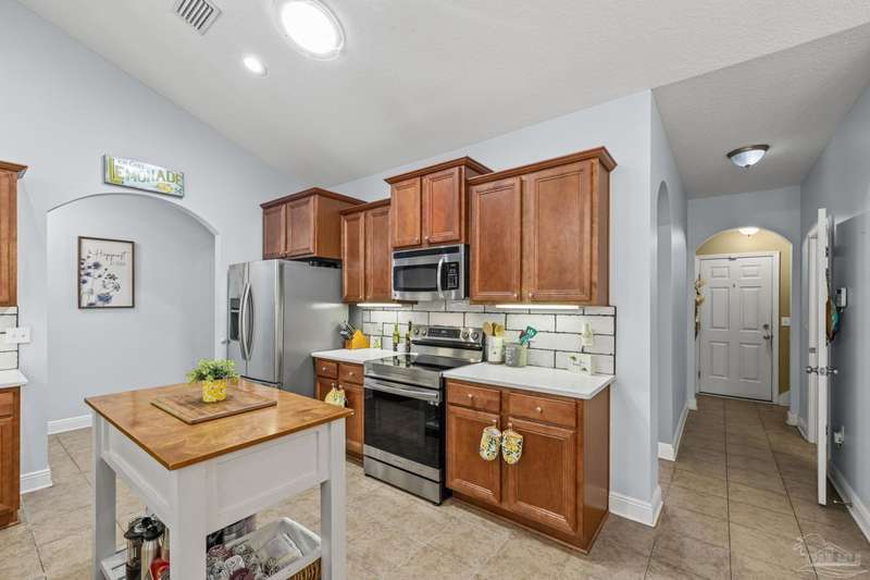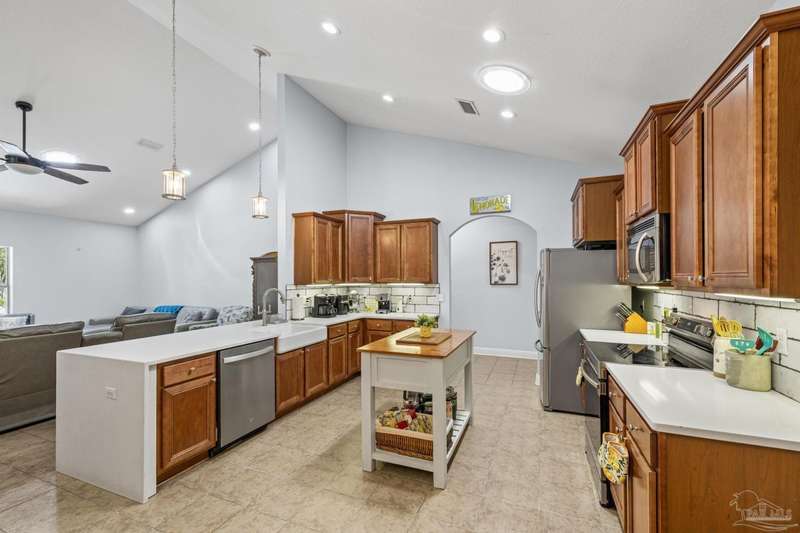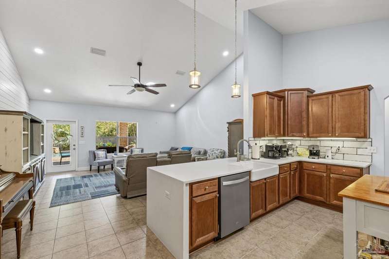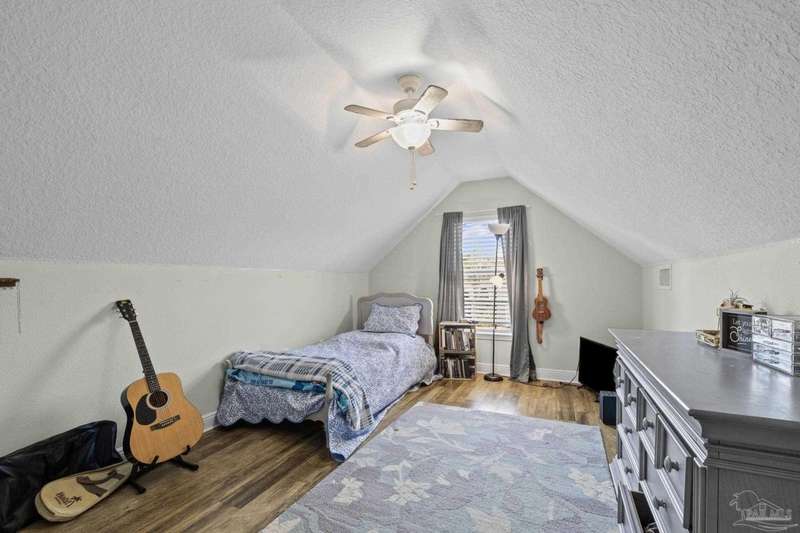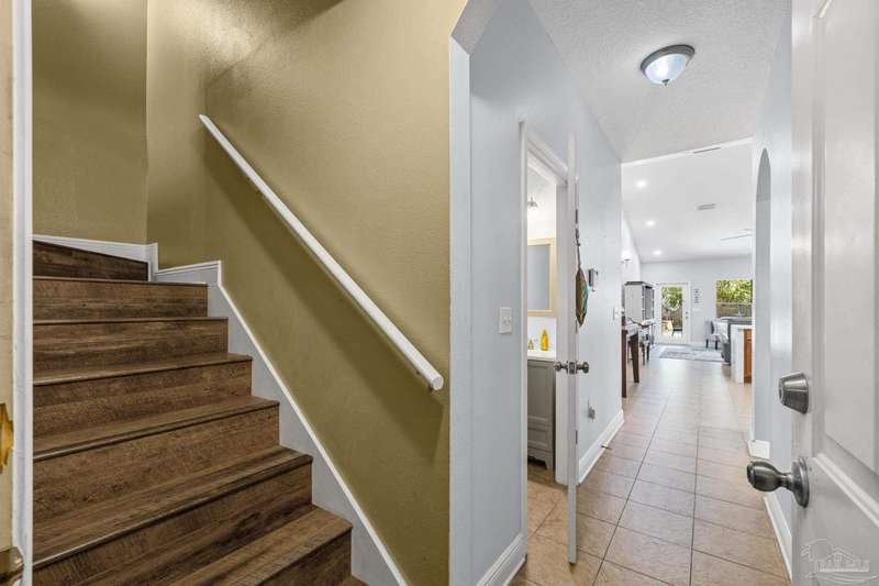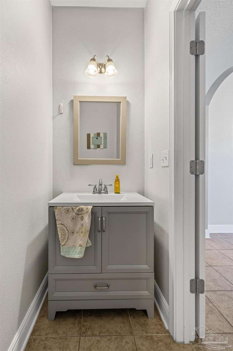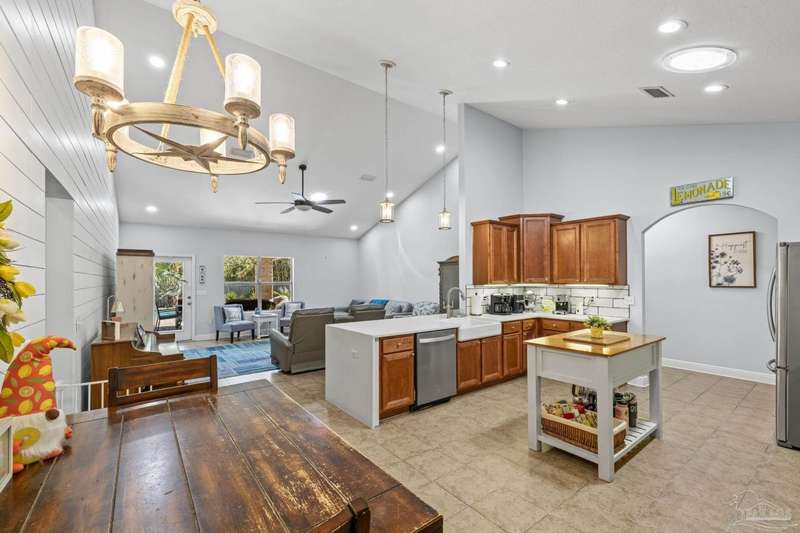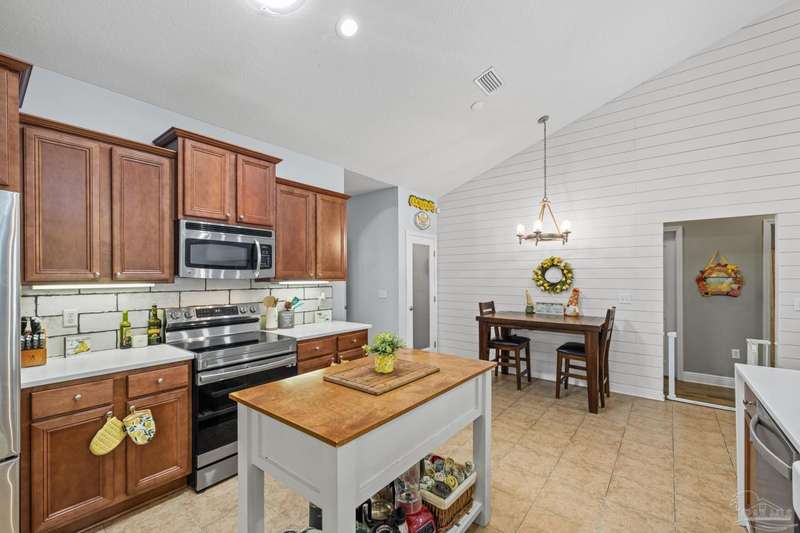 Waiting for a pool home in Navarre? Wait no more! Discover your dream Florida lifestyle in this home within the highly sought-after Grand Bay Estates community in Navarre. This 4-bedroom 2 and 1/2-bath residence, complete with a dedicated private office, offers a split bedroom floorplan, a bonus room upstairs, all hard floors, all solid surface countertops, large open kitchen and lots of added charm and character. Step inside to a bright entry foyer with the office to the right and formal dining room to the left. Then down the hall is an impressive, open-concept design featuring soaring high ceilings that enhance the natural light and spacious feel of the great room. There is one skylight in the kitchen and one in the greatroom - both in the cathedral ceiling.The centerpiece is a chic, modern aesthetic highlighted by a beautifully accented shiplap wall, creating a perfect gathering space for family and friends. Open to the greatroom is the kitchen in the heart of the home - complete with quartz countertops, tile backsplash, stainless appliances, center - moveable - island, pantry and lots of cabinets. The main suite is on the back of the home with a box ceiling with crown molding and a view of the back yard - since the home faces west, is cooler in the afternoon heat of the day. The bath - what can I say - double vanity, granite countertops, large closet with built-ins - no wire shelving here, separate shower, garden tub and water closet. The true highlight is your private outdoor sanctuary! Escape the Florida heat in your very own backyard oasis featuring an in-ground gunite pool with ionizer and an integrated spa - with propane heater. This luxurious feature is perfect for relaxing after a day at the beach, hosting summer BBQs, or simply enjoying the tranquil Navarre evenings. Grand Bay Estates is known for its waterfront access to East Bay with dock, peaceful atmosphere, streetlights, underground utilities, fiber and proximity to Navarre's beautiful beach.