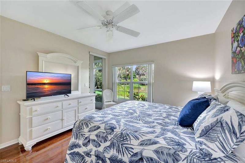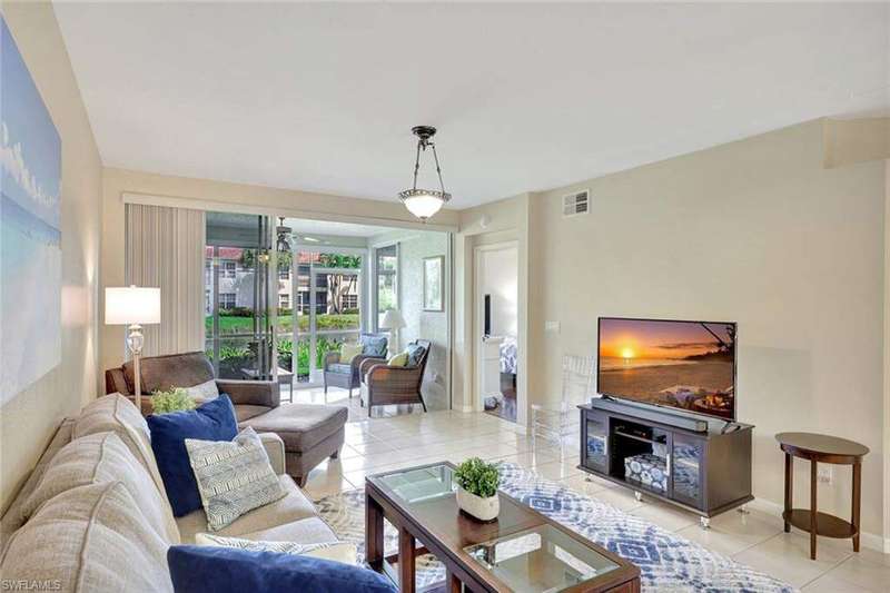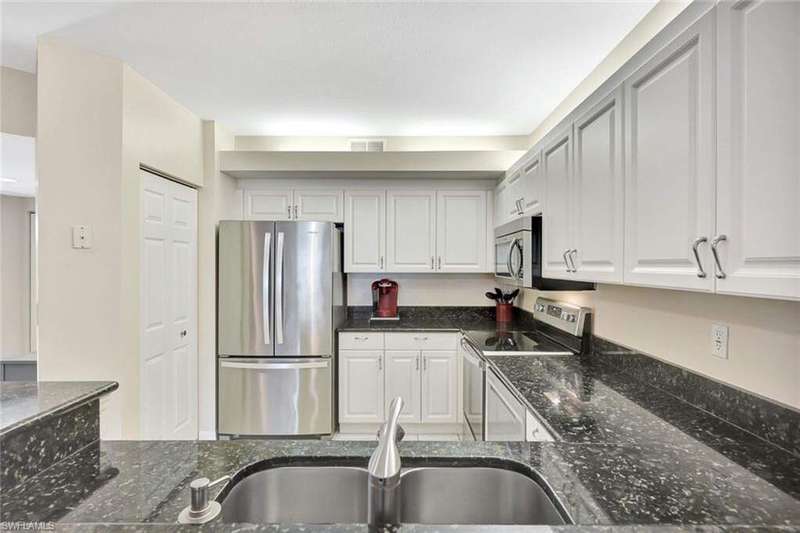 LAKE VIEW & TURNKEY! This 2 bedroom/2 bath first-floor condo is open and welcoming. The perfect mix of comfort, style, and convenience for SWFL living. Through the front door the open floor plan offers an abundance of natural light and a neutral color palette that is the perfect backdrop for any decor. The kitchen boast crisp white cabinetry, stunning dark granite countertops, newer stainless steel appliances, and generous storage paired across from the formal dining area with built in Buffet for additional storage. The primary suite offers serene lake and fountain views and ensuite bath features dual raised vanities and upgraded walk-in shower with frameless glass door. The lanai has been enclosed and fitted with IMPACT sliding glass doors, expanding your living space and allowing you to enjoy rain or shine. This condo also has a newer Air Conditioner and newer Water Heater! Stone-coated steel roofs replaced community-wide in 2020 for peace of mind and durability. ResortStyle Living at Lighthouse Bay: This gated community is packed with amenities, including:5 pools, including a lap pool 2.5miles of walking/jogging paths A robust bocce program Tennis courts with a pro on staff 2 boat houses, a fitness center, sauna, clubhouse, and library Arts & Learning Center and more! As a bonus, a Bronze Membership to the Brooks Commons Club is included, granting access to a private restaurant, enrichment center, pickleball, vibrant social programs, and more. Prime Location. Enjoy being just minutes from Coconut Point Mall, dining, entertainment, SWFL International Airport, and pristine beaches!