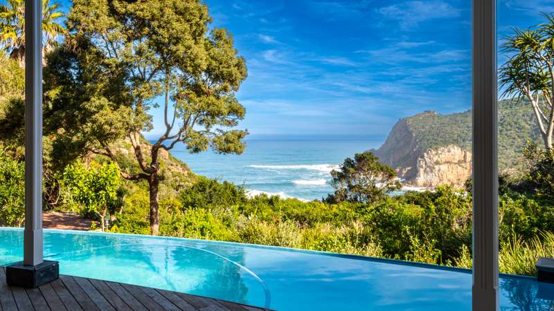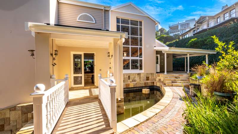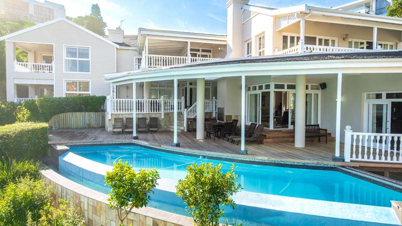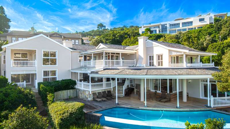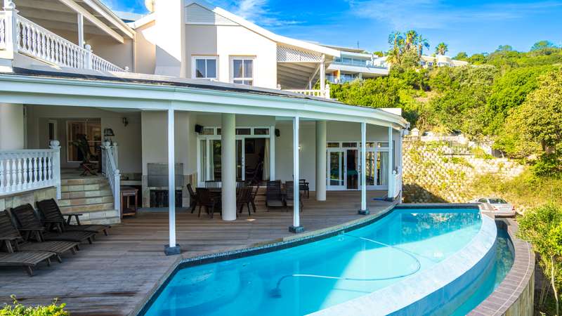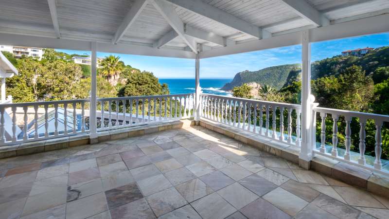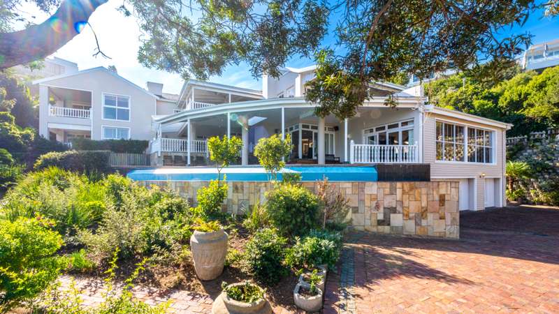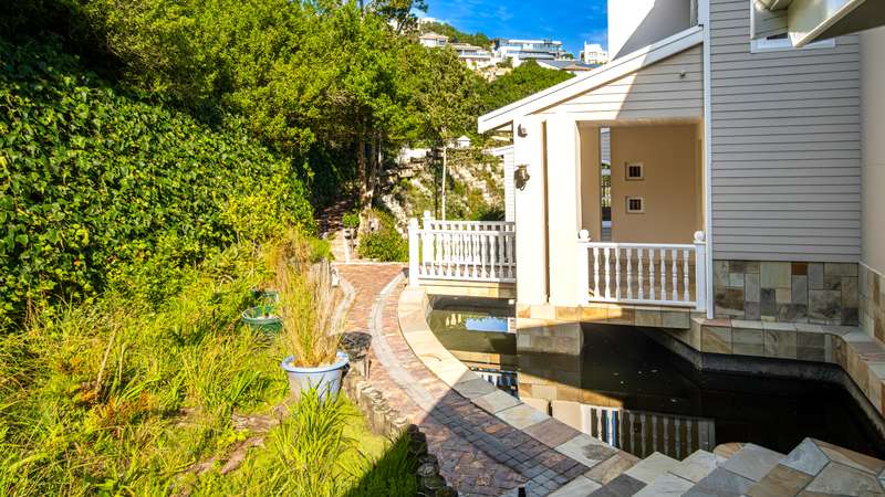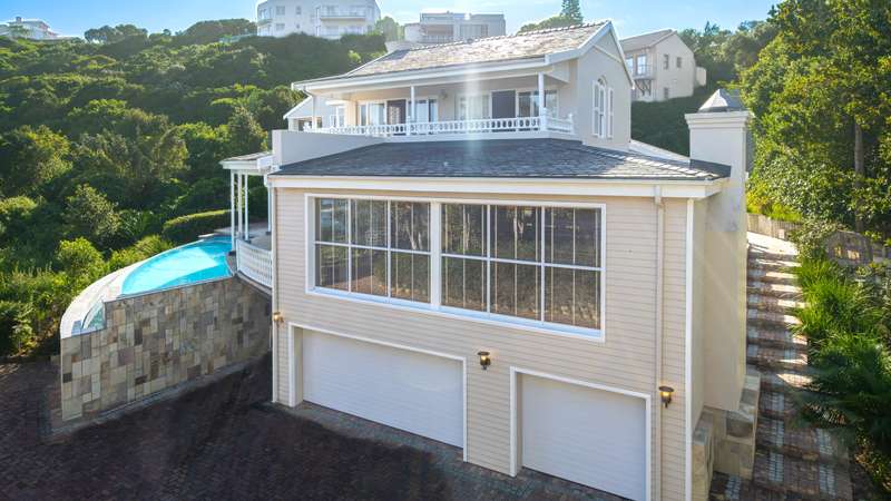 Joint Mandate Magnificent Coastal Residence with Uninterrupted Views and Tropical Ambience This extraordinary property includes a separate vacant erf located in front of the main house, ensuring your breathtaking views of the Knysna Heads and ocean can never be obstructed. The sale includes the furniture with exception of some items. Features at a Glance: Ground Floor: Automated access gate and fully paved driveway with ample under-paving parking Double and single automated garages with direct staircase access to the first floor Under-roof carport Tropical landscaping with palm trees and indigenous plants, creating a Caribbean villa feel First Floor: Striking paved walkway across a bridge with fish infinity pond leads to the grand entrance Elegant formal lounge with fireplace opening onto a generous patio Recreation room with fireplace and built-in bar, flowing out to the entertainment patio Expansive covered patio with built-in braai, infinity pool, and spectacular sea and mountain views A magnificent double-volume dining room with fireplace and staircase to the upper level, opening onto the upper patio Designer chef’s kitchen with granite tops, walk-in pantry, separate laundry and scullery Two spacious bedrooms, each with full en-suite bathrooms, private lounge areas, and balconies Second Floor: Two additional bedrooms, each with full en-suite bathrooms and private balconies Luxurious master suite featuring a private study with fireplace and balcony Walk-in dressing room Full en-suite bathroom with double vanity (his and hers basins) Private balcony and fireplace Basement: Large wine cellar This remarkable home is designed to blend luxury, privacy, and natural beauty. All balconies and entertainment areas offer magnificent views of the infinity pool, landscaped gardens, and the sparkling ocean. An exceptional opportunity to own a home that offers both seclusion and grandeur in one of the most sought-after coastal regions in South Africa. A definite Guest House opportunity exists. Floorplans included, with estimates sqm measurements. Contact us today for an exclusive viewing.