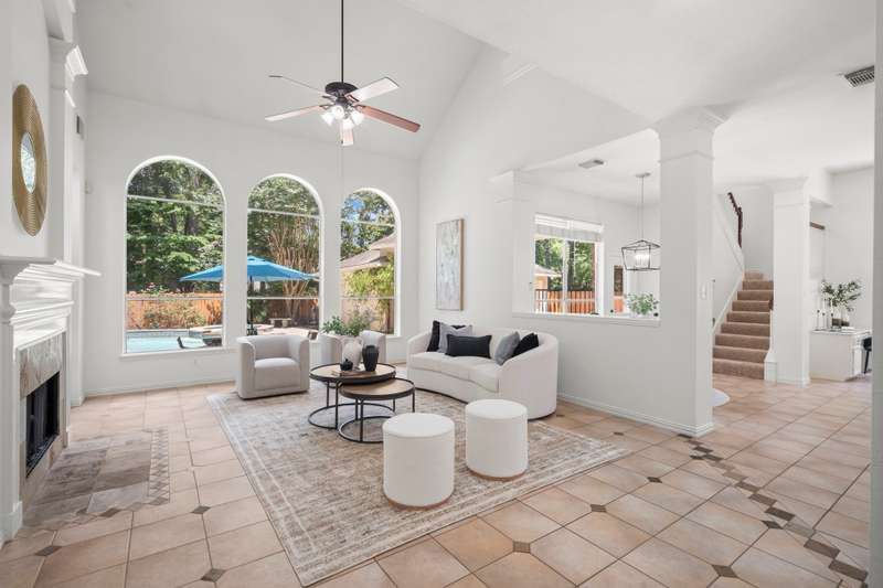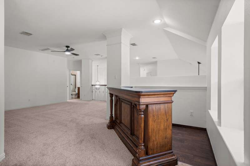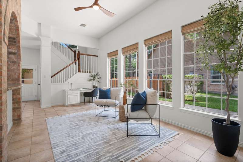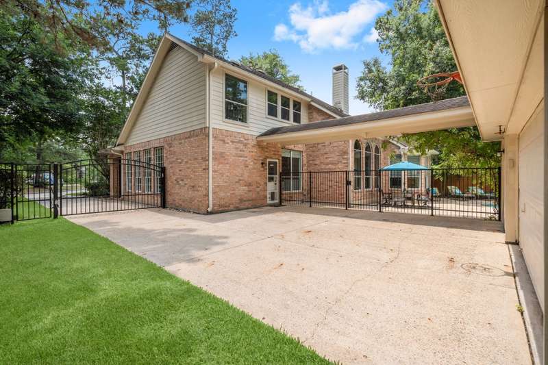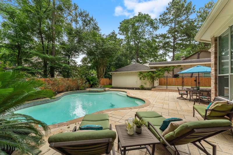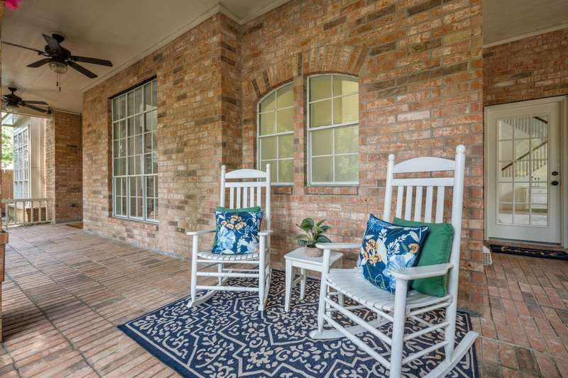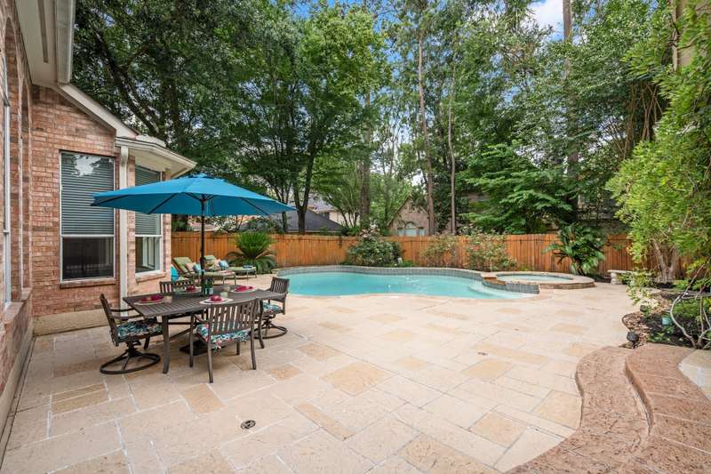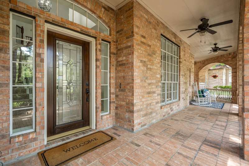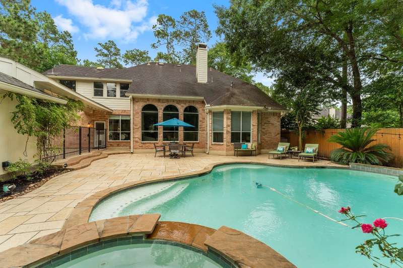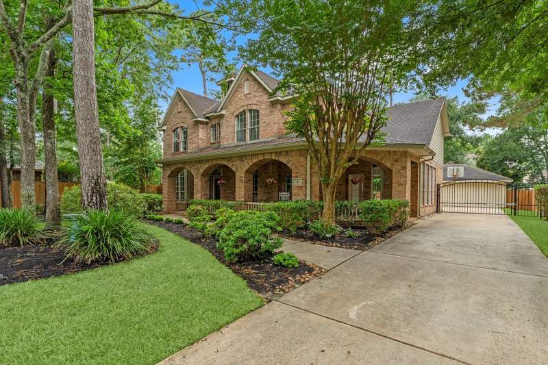 Tucked away on a peaceful cul-de-sac in desirable Alden Bridge, this charming David Weekley home offers 4 bedrooms, 3.5 baths, and inviting spaces throughout. Enjoy relaxing on the wraparound porch or in your private backyard retreat with pool and spa. Inside, the bright family room features expansive windows with serene pool views. The open kitchen flows into the sunroom, breakfast nook, and family room—perfect for everyday living. A spacious primary suite offers dramatic windows, a luxurious bath with jetted tub, oversized shower, dual vanities, makeup area, and a large walk-in closet. Two staircases lead to a generous game room with bar and two full baths upstairs. A private office with French doors and built-ins is ideal for working from home. Fresh paint and new carpet throughout. Walk to parks, trails, tennis courts, a pool, and top-rated Buckalew Elementary. This warm and welcoming home is ready for you to move in and make it your own.