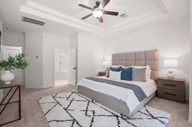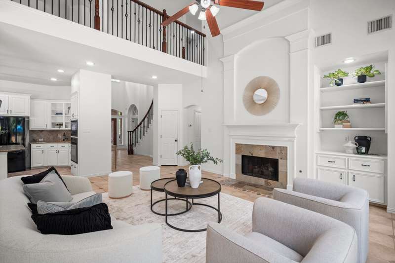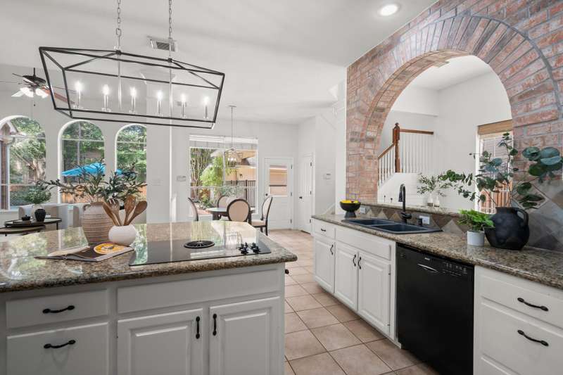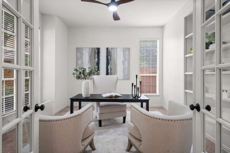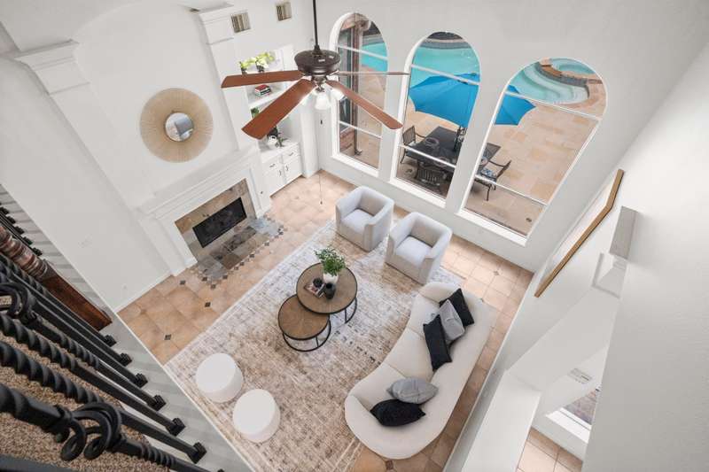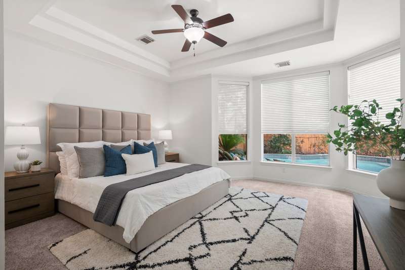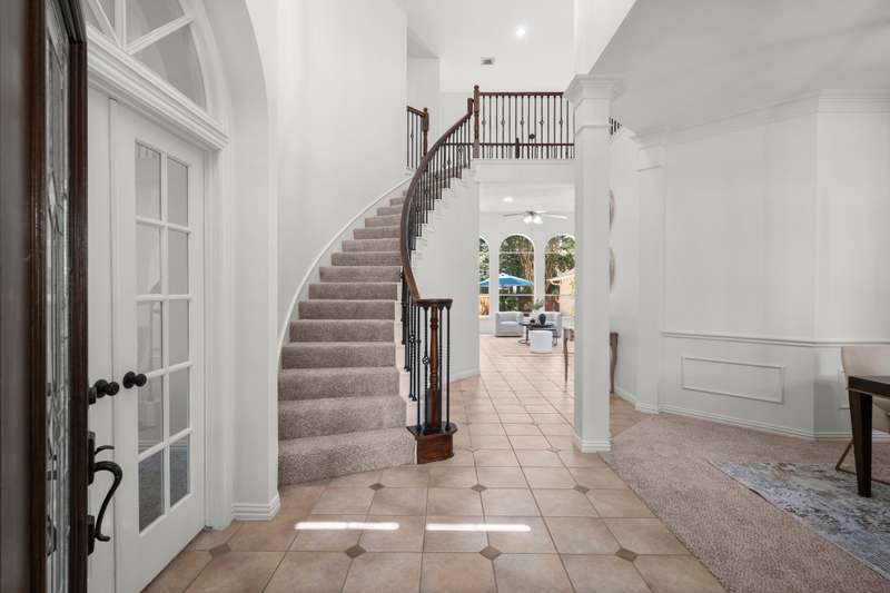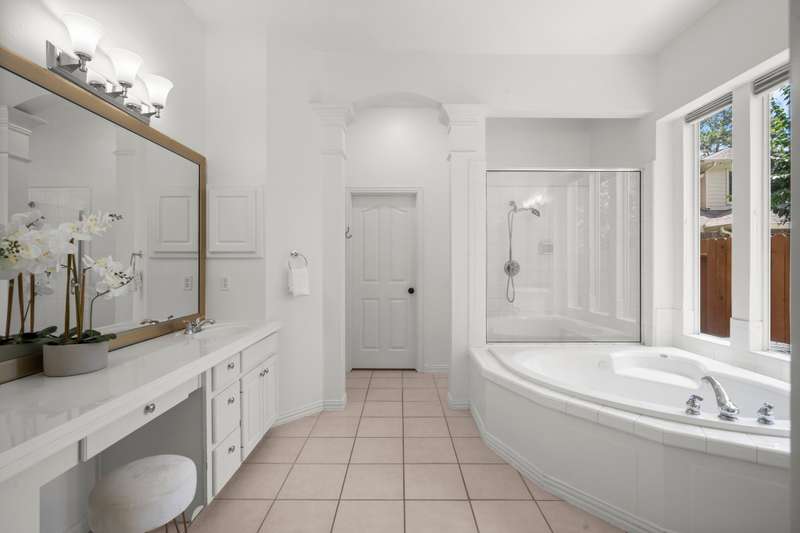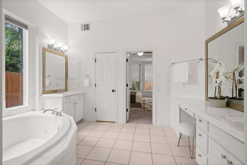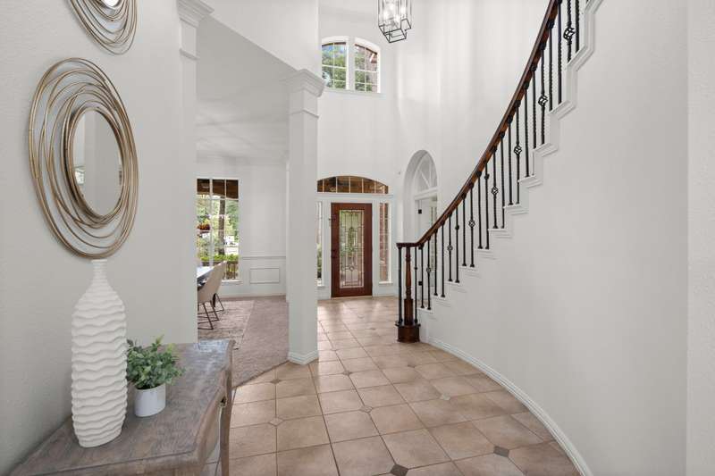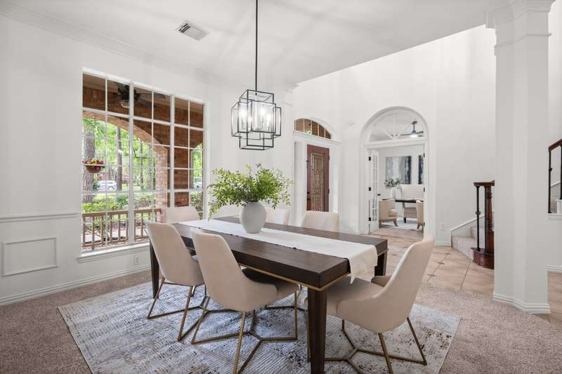 Tucked away on a peaceful cul-de-sac in desirable Alden Bridge, this charming David Weekley home offers 4 bedrooms, 3.5 baths, and inviting spaces throughout. Enjoy relaxing on the wraparound porch or in your private backyard retreat with pool and spa. Inside, the bright family room features expansive windows with serene pool views. The open kitchen flows into the sunroom, breakfast nook, and family room—perfect for everyday living. A spacious primary suite offers dramatic windows, a luxurious bath with jetted tub, oversized shower, dual vanities, makeup area, and a large walk-in closet. Two staircases lead to a generous game room with bar and two full baths upstairs. A private office with French doors and built-ins is ideal for working from home. Fresh paint and new carpet throughout. Walk to parks, trails, tennis courts, a pool, and top-rated Buckalew Elementary. This warm and welcoming home is ready for you to move in and make it your own.