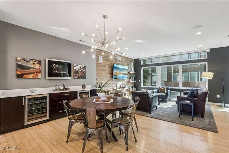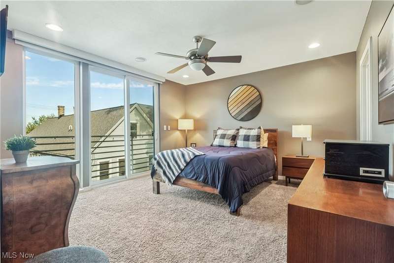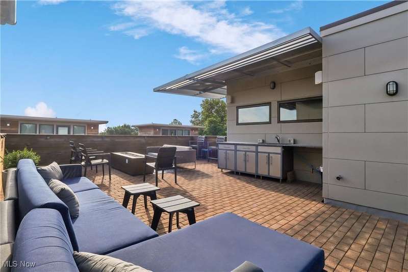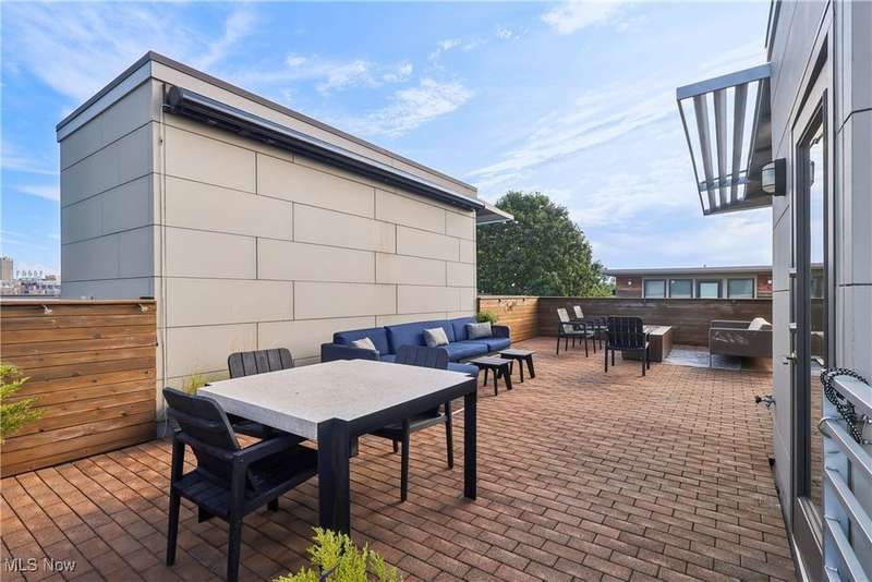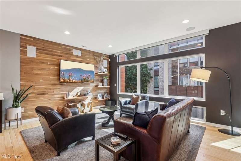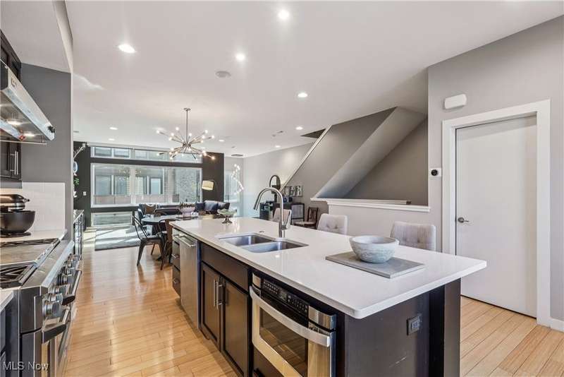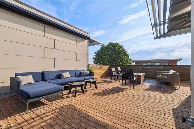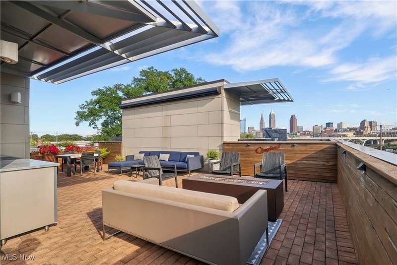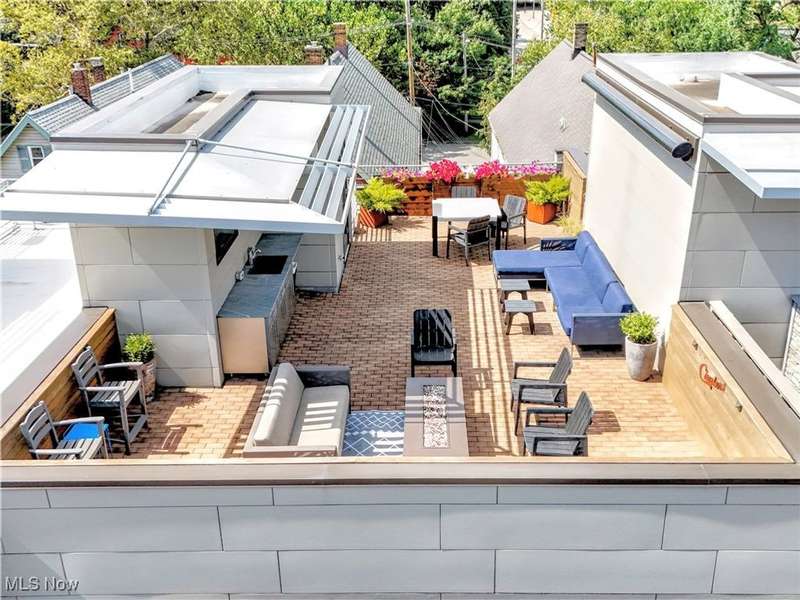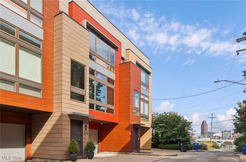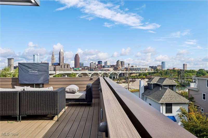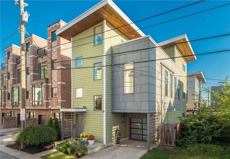 Stunning 2000+ sqft townhome with breathtaking city views from the highest point in Tremont! As you enter through the front door, you're welcomed into the 2-story foyer with modern chandelier, and heated tile floors. Access to the 2-car garage, workout room, storage and backyard complete the ground floor. The second level features an open design with floor to ceiling windows & power custom shades. The chef's kitchen has quartz countertops, custom cabinets, microwave drawer, and GE Monogram appliances, plus sliding glass doors to the balcony. The dining room features a custom built-in sideboard with quartz countertops, wine cooler, mini fridge and wall mounted gas fireplace. The living room boasts a walnut accent wall and cantilevered cherry shelves. On to the third level you'll find the owner's suite featuring a walk-in closet, attractive bath with quartz countertops and tiled shower with frameless glass door, and a Juliette balcony. The expanded second bedroom has 2 closets, and includes a sitting area, giving it a guest-suite feel. Floor to ceiling windows with powered custom shades are in each bedroom. A second full bath, laundry room and linen closet finish this floor. Saving the best for last is an understatement! The fourth level has an impressive roof deck with amazing views of the Cleveland skyline! A remote control retractable awning, Azek Paver system, and prep area will make entertaining a breeze. In addition, there is counter space and a beverage fridge on the indoor landing. Other highlights include tax abatement through 2028, green building standards, bamboo flooring throughout, wired for security, home theater, and surround sound. This prime Tremont location provides easy access to Ohio City, the West Side Market, downtown, the Towpath Trail, and more! Come see why this remarkable residence is the perfect blend of modern luxury and awesome city living!