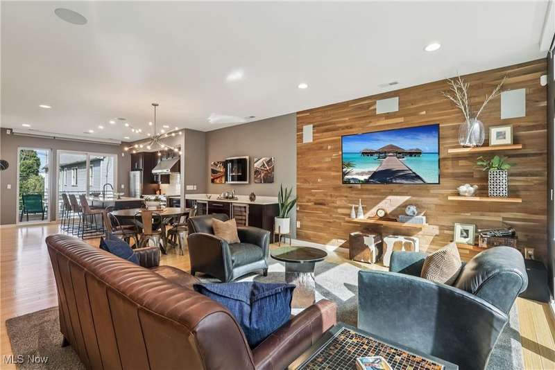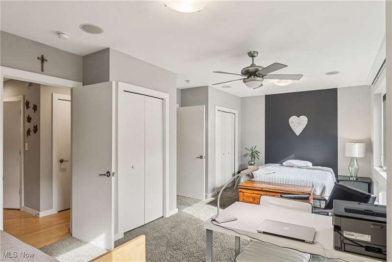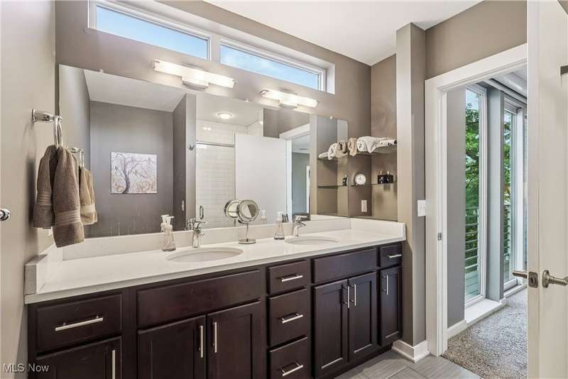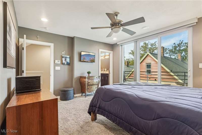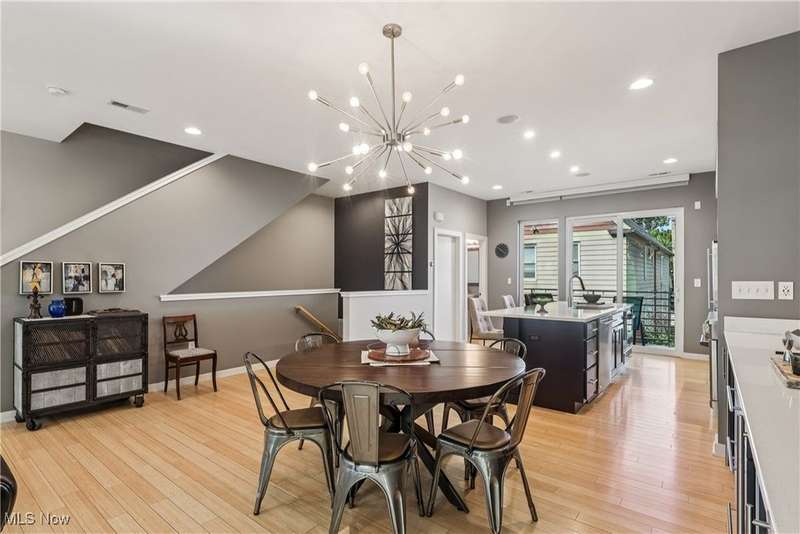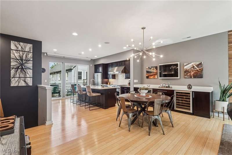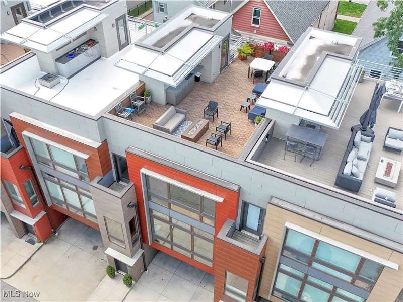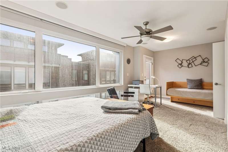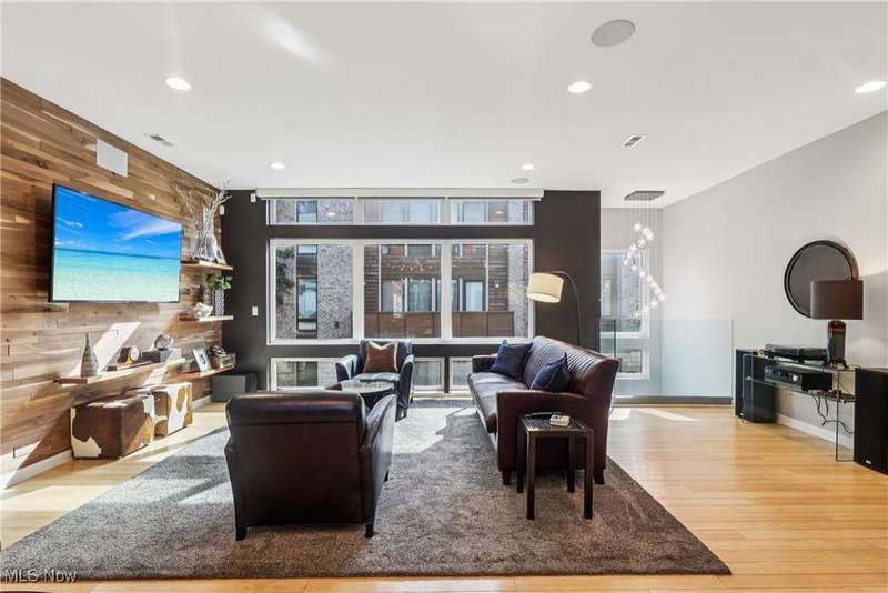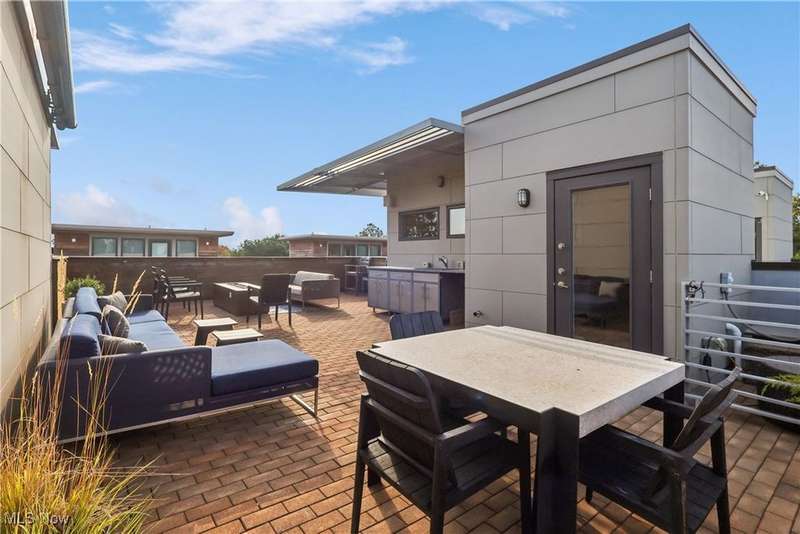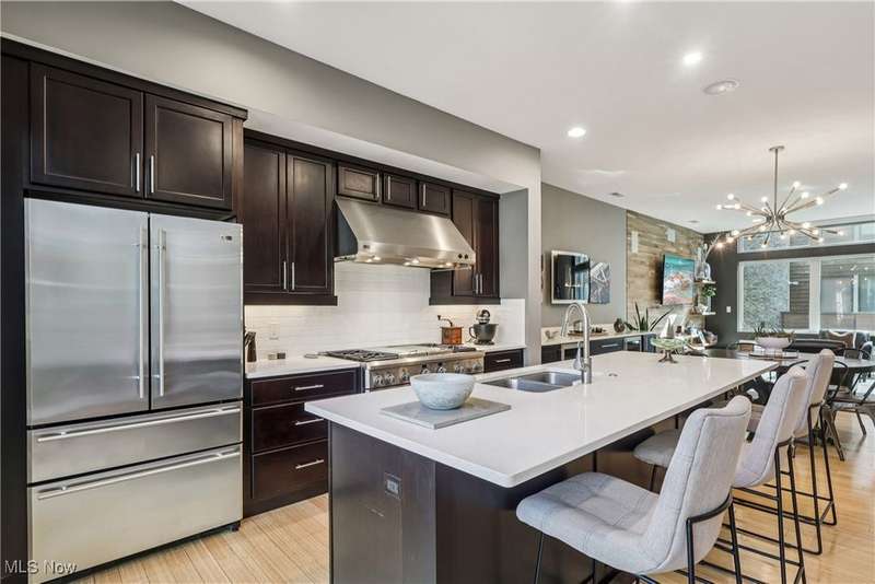 Stunning 2000+ sqft townhome with breathtaking city views from the highest point in Tremont! As you enter through the front door, you're welcomed into the 2-story foyer with modern chandelier, and heated tile floors. Access to the 2-car garage, workout room, storage and backyard complete the ground floor. The second level features an open design with floor to ceiling windows & power custom shades. The chef's kitchen has quartz countertops, custom cabinets, microwave drawer, and GE Monogram appliances, plus sliding glass doors to the balcony. The dining room features a custom built-in sideboard with quartz countertops, wine cooler, mini fridge and wall mounted gas fireplace. The living room boasts a walnut accent wall and cantilevered cherry shelves. On to the third level you'll find the owner's suite featuring a walk-in closet, attractive bath with quartz countertops and tiled shower with frameless glass door, and a Juliette balcony. The expanded second bedroom has 2 closets, and includes a sitting area, giving it a guest-suite feel. Floor to ceiling windows with powered custom shades are in each bedroom. A second full bath, laundry room and linen closet finish this floor. Saving the best for last is an understatement! The fourth level has an impressive roof deck with amazing views of the Cleveland skyline! A remote control retractable awning, Azek Paver system, and prep area will make entertaining a breeze. In addition, there is counter space and a beverage fridge on the indoor landing. Other highlights include tax abatement through 2028, green building standards, bamboo flooring throughout, wired for security, home theater, and surround sound. This prime Tremont location provides easy access to Ohio City, the West Side Market, downtown, the Towpath Trail, and more! Come see why this remarkable residence is the perfect blend of modern luxury and awesome city living!