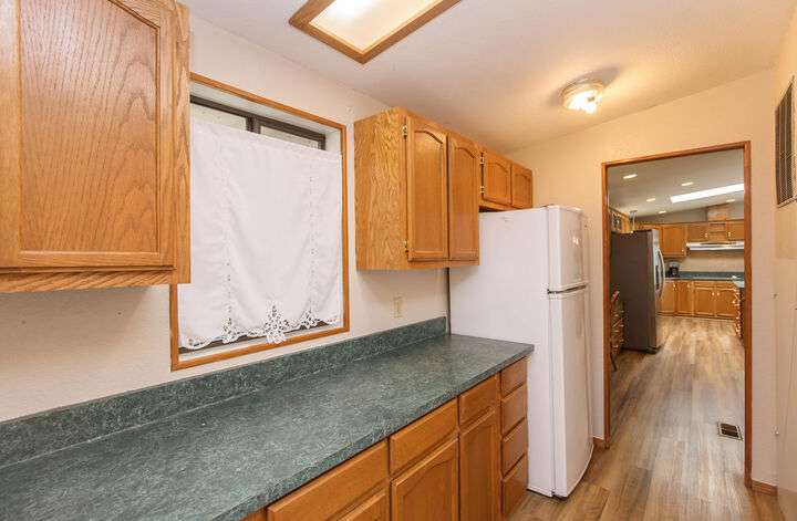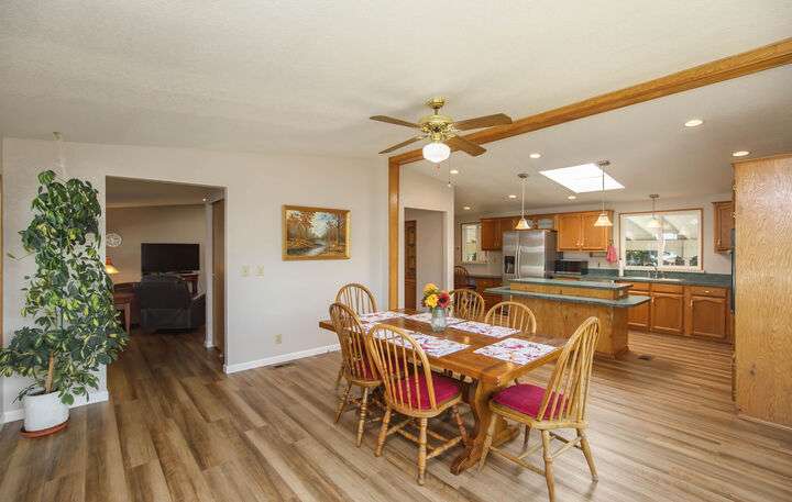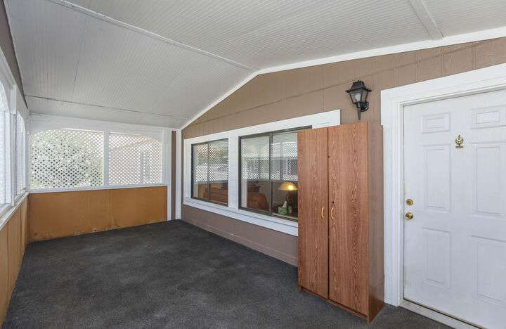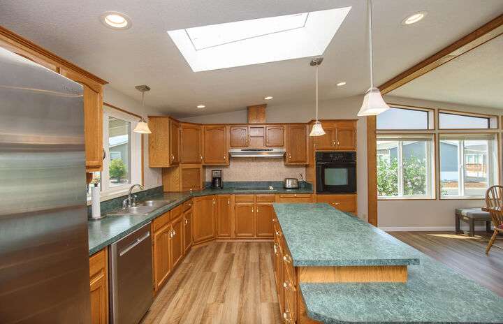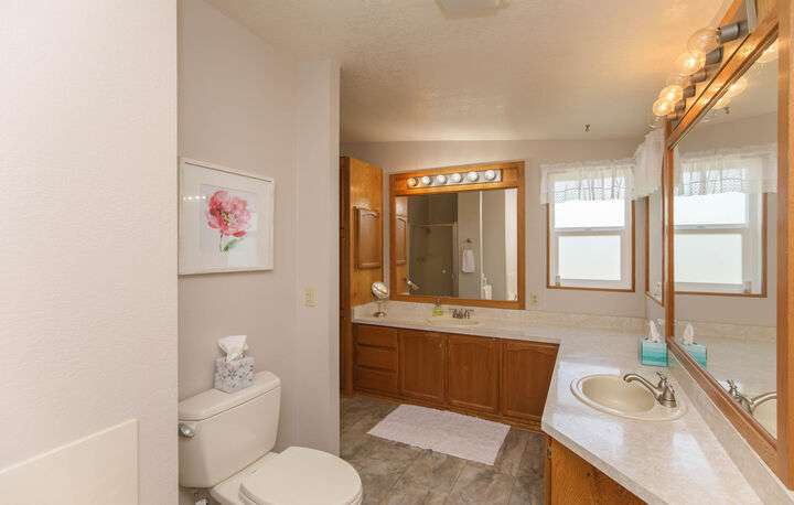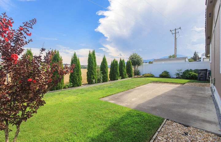 Turnkey 3 bed, 2 bath home in Greenway Village, a quiet 55+ community in South Phoenix. This spacious 1,782 sq ft home features a new roof (2024), Energy Star windows (2025), exterior paint (2022), vinyl plank flooring throughout, and updated bathroom vinyl. The light-filled kitchen offers ample cabinetry, large kitchen island, a built-in desk that makes a great office space, and a dining area off the kitchen for entertaining. Enclosed patio on side of home. All appliances included—plus a second fridge and washer/dryer in laundry room. Outside, enjoy the flowers and plants including Rose of Sharon, grapes, rosemary, and Cypress. The fully fenced yard has an Orbit sprinkler system and backs to peaceful farmland. Additional features include a shed with workbench, carport ramp, and newer vinyl fencing and gate. Well-maintained and move-in ready, this home offers low-maintenance living in a welcoming park near shopping, dining, and access to the Bear Creek Greenway for walking and biking.