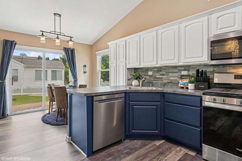 Stunning ranch home nestled in desirable Orchard Valley of Aurora. 3 bed, 2 full bath home offers an open floor plan, soaring vaulted ceilings, luxury vinyl plank flooring, and neutral decor throughout. Sunfilled kitchen features white and navy cabinetry, tumbled stone backsplash and all stainless steel appliances. Sliding door off dining room leads to the oversized stone paver patio and private backyard. PVC maintenance free fence and irrigation system complete this space. Fantastic family room/Great room anchored with floor to ceiling stone fireplace and wall of windows overlooking the backyard. Sleek primary suite with striking accent wall, custom walk-in closet and updated private bath; dual vanity, soaking tub, tile surround walk-in shower, updated lighting and water closet. 2nd bedroom offers custom closet and situated next to the other updated full bath. Bath features tub/shower with tumbled Subway tile surround, farmhouse vanity, Quartz countertop and updated fixtures. 3rd bedroom/den/office with double doors provides versatility for any buyer. Conveniently located first floor laundry room making this true ranch living...newer washer/dryer and utility tub. Both front closet and closet off the garage have been customized with beautiful shiplap, wood bench and hooks. Unfinished partial basement with a crawl yields tons of storage space or the opportunity to customize for one's specific needs. Mechanical updates: A/C (2024) and furnace (2023). The community is situated next to the Orchard Valley Golf Course and is super easy access to I-88. Welcome Home!