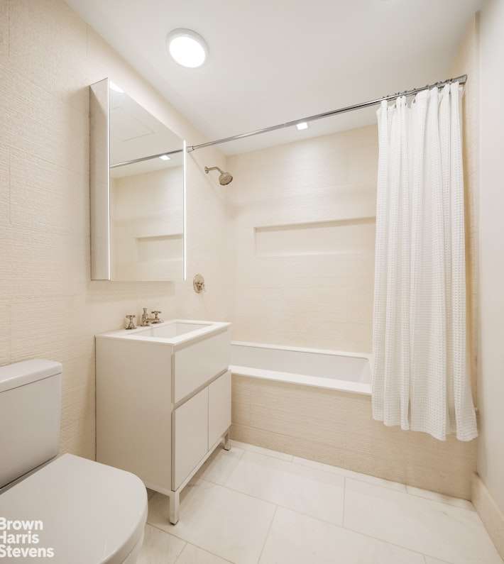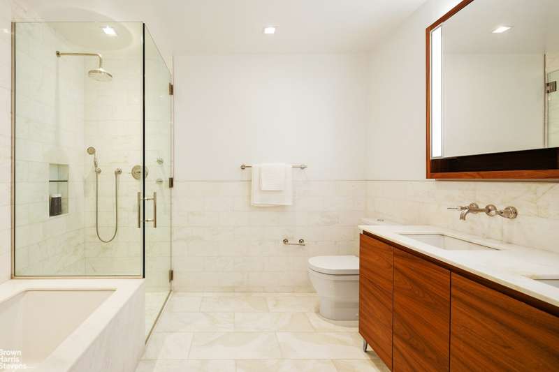 The king-sized primary bedroom serves as a peaceful retreat. The spa-like en-suite bathroom features a glass-enclosed shower, deep soaking tub, double vanity and lit walnut medicine cabinet complimented by polished nickel finishes and marble radiant heat flooring. The large closet is truly a sought-after amenity. On the opposite side of the home you will find a beautifully lit second bedroom and full bathroom with a soaking tub and high-end fixtures. An in-unit washer/dryer, and ample closet space throughout are ideal for effortless day-to-day living.