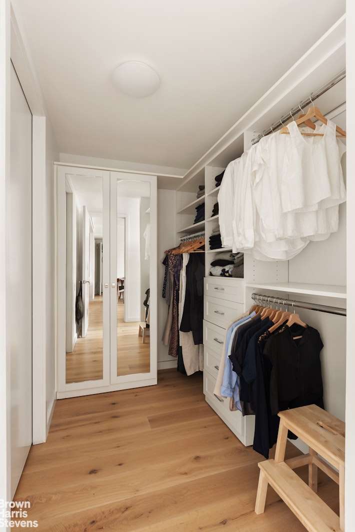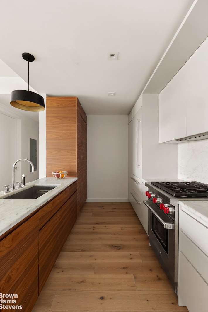 This well-designed apartment is in immaculate condition and features wide-plank hardwood floors throughout and an open-concept living and dining area that flows effortlessly onto your own private balcony, perfect for morning coffee or a quiet evening outdoors. The kitchen combines form and function with abundant storage in custom Italian cabinetry, top-of-the-line appliances by Wolf, Liebherr, and Miele, and a breakfast bar topped with an elegant slab of Olympian Danby marble, ideal for both dining and meal prep.