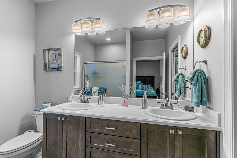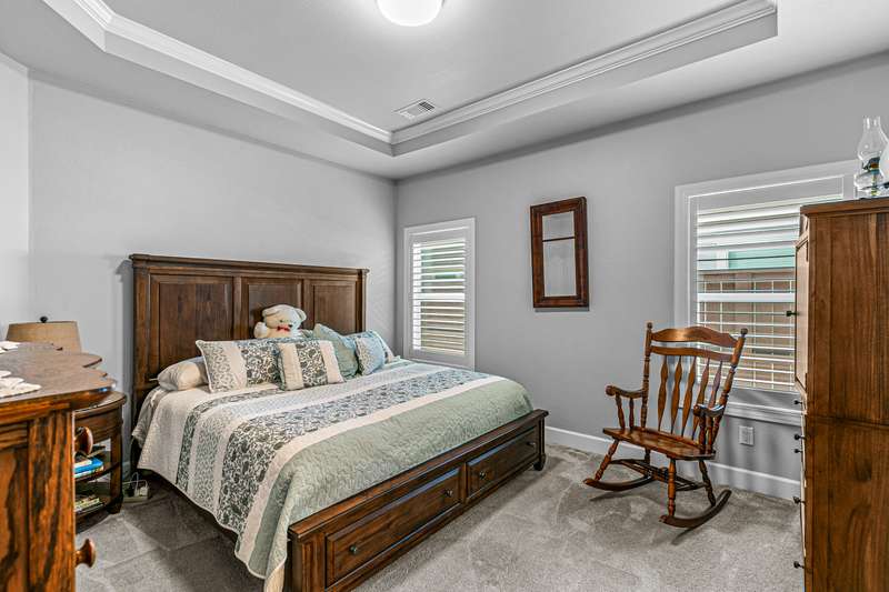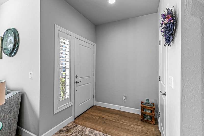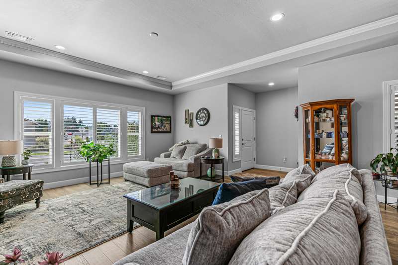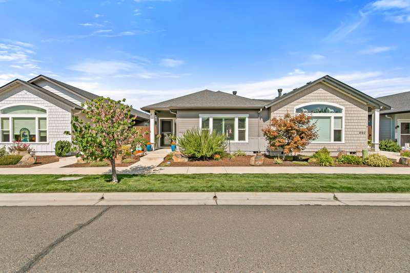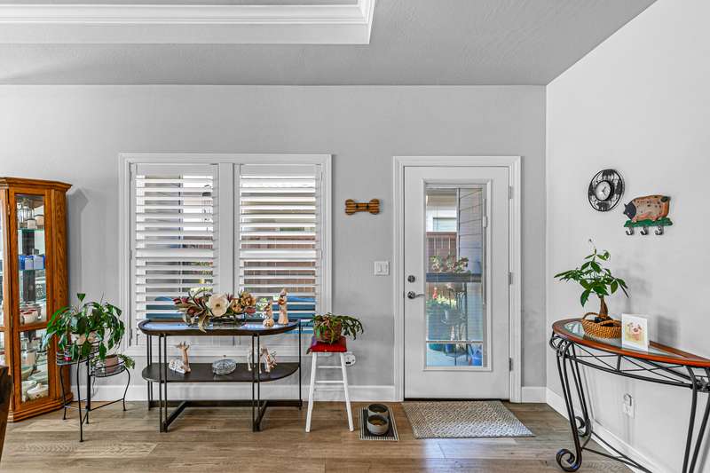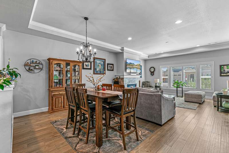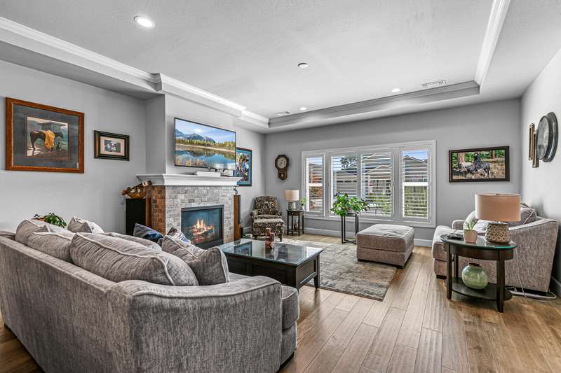 Designed for comfort and convenience, this Snowy Butte Station home features a popular great room floor plan with vaulted/coffered ceilings, hardwood floors in the main living areas, and a cozy gas fireplace. The kitchen shines with granite counters, tile backsplash, stainless steel appliances including a 5-burner range, soft-close cabinetry, and a huge walk-in pantry. The primary suite includes a walk-in closet and dual-sink vanity. Enjoy a covered patio, fenced side yard, and oversized 2-car rear garage with utility sink. HOA maintains front landscaping, with a pocket park just down the street.
