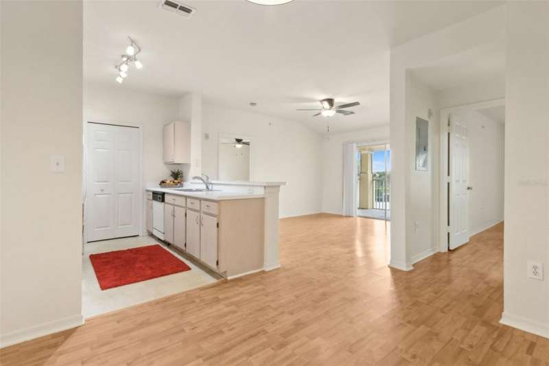 MOVE IN READY and ready for you! Adorable, 2 bed/2 bath THIRD floor condo in the Millenia area's Cypress Fairway. This top floor condo has a bright and open floor plan with vaulted ceilings and no upstairs neighbors. You will love the wood laminate and ceramic tile floors throughout - NO CARPET (!), neutral paint palette and upgraded ceiling fans in every room! The dining area and kitchen welcome you inside. The kitchen features cabinets with hardware, all appliances, a pantry and a breakfast bar. The kitchen is open to the family room with glass sliders leading to the covered and screened patio. What a great space to enjoy your morning coffee or unwind after a long day! The owner's suite is off the living room and has a bright window and a large walk-in closet. The bathroom features a one sink vanity and a tub/shower combo. The guest bedroom is on the other side of the living room, has a ceiling fan, wood laminate floors and shares the guest bath with a one sink vanity and a tub/shower combo. There's an inside laundry room with a washer and dryer and new water heater. This building had the stucco redone, exterior has been repainted, with new energy efficient windows installed in addition to new insulation in the exterior walls making condo energy efficient! The roof was replaced in 2022 by the condo association, also. Additional updates include upgraded ceiling fans, new mini blinds and upgraded shower heads. One assigned parking spot is included in the sale of this property, but there is plenty of guest parking. Cypress Fairway has great amenities, with a recreation center, gym, pool & tennis courts, walking trail, picnic tables, grills throughout and is gated! Located near I-4, Mall at Millenia & major highways & theme parks, this condo would make a great rental investment opportunity or primary residence! Make this your new home today!